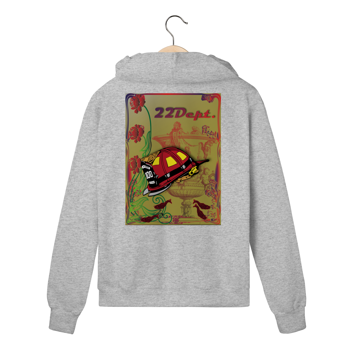 Esta arte traz um capacete clássico de bombeiro em destaque, envolto por arabescos florais, folhagens e ornamentos vintage, que remetem ao movimento artístico do início do século XX. O fundo em tons dourados e vermelhos cria uma atmosfera nobre e atemporal, enquanto os elementos decorativos – flores, peixes e formas orgânicas – simbolizam vida, movimento e renovação.