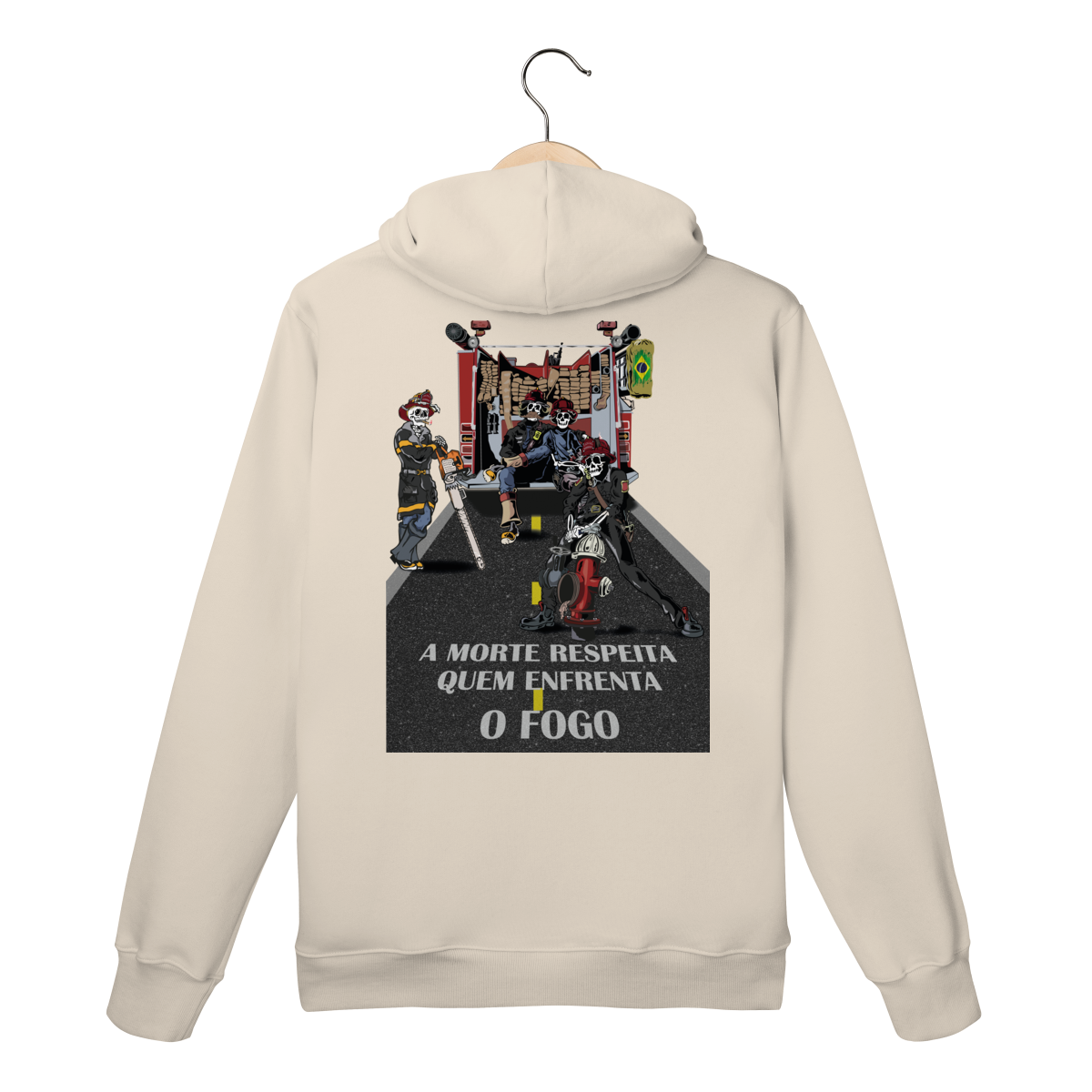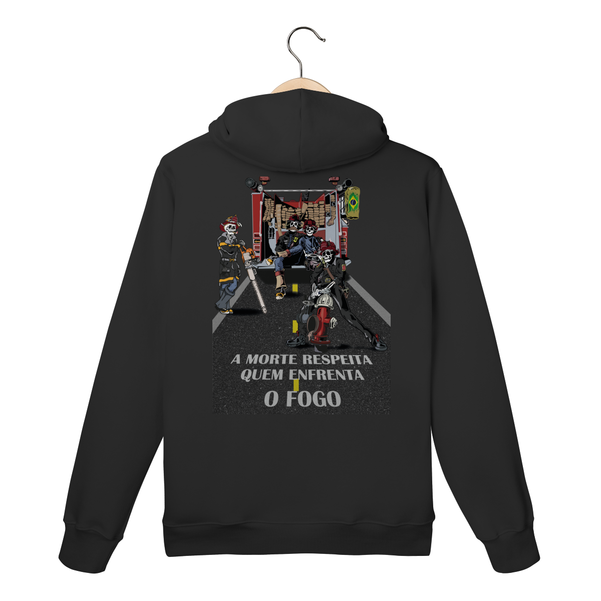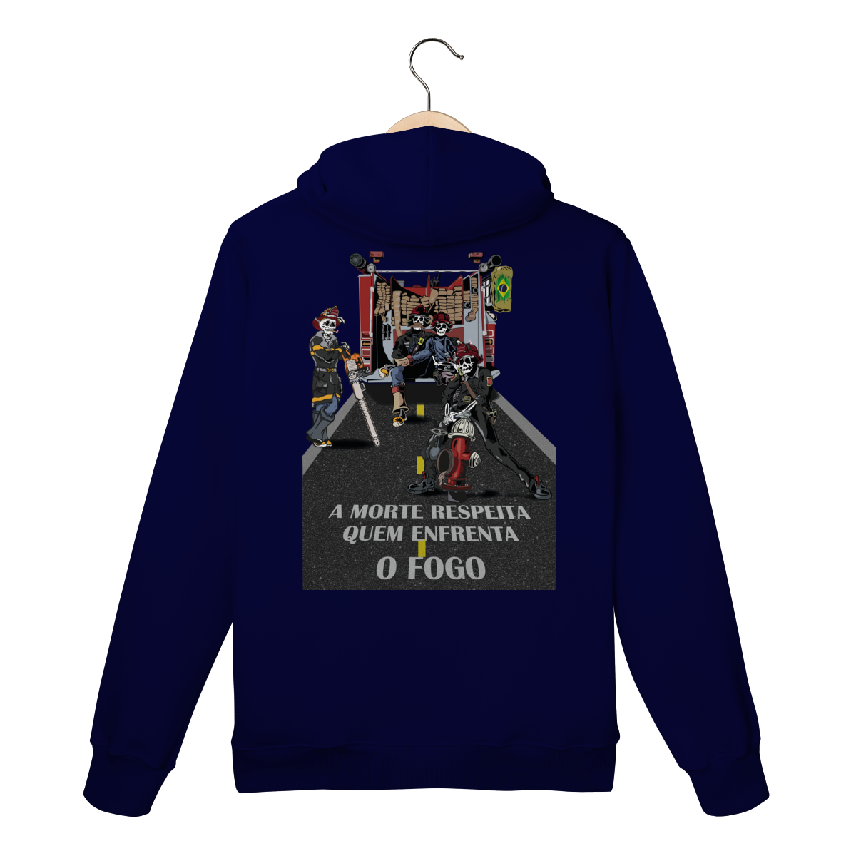 Uma arte criada para quem vive no limite e encara o que ninguém mais tem coragem. A ilustração apresenta uma equipe de bombeiros estilizados como caveiras — um símbolo clássico de bravura, irreverência e resistência — posicionados em frente ao caminhão de combate a incêndio, prontos para a próxima chamada.