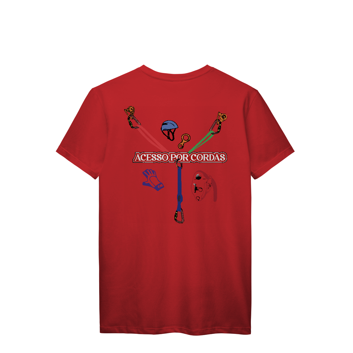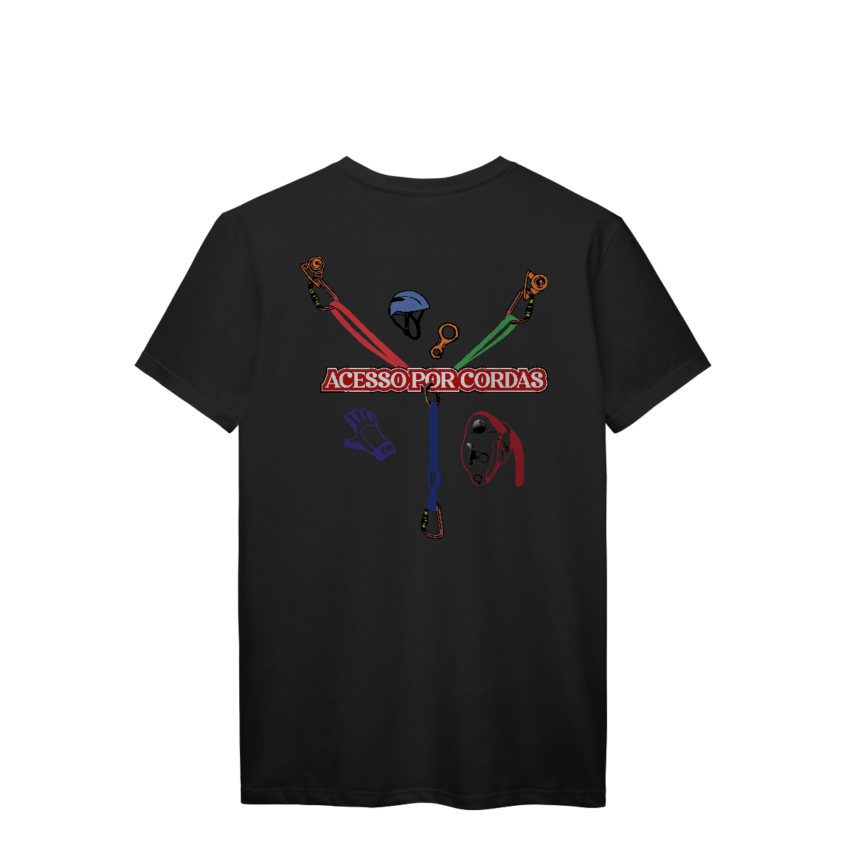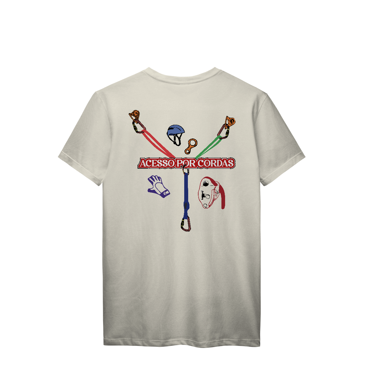 A frase “ACESSO POR CORDAS” em letras grandes brancas com contorno vermelho atravessa o centro, deixando claro o tema da estampa.
