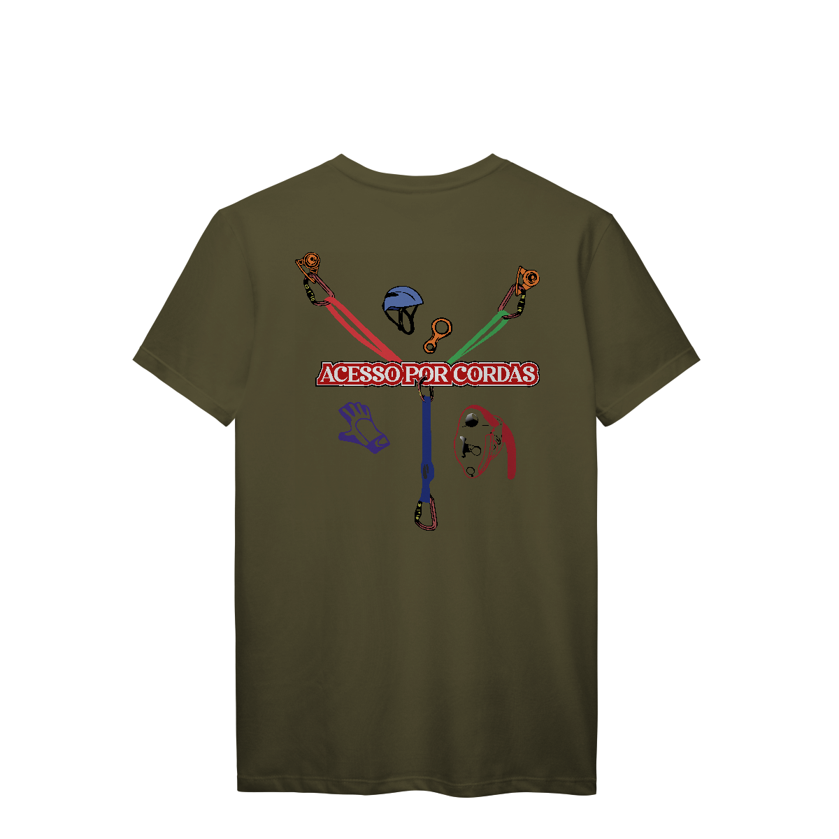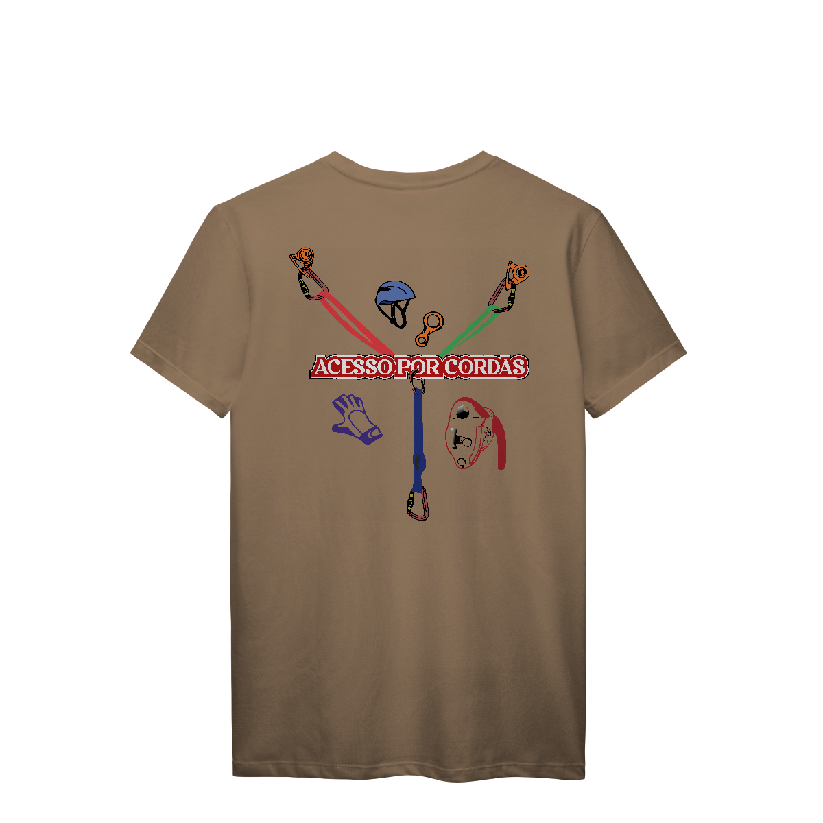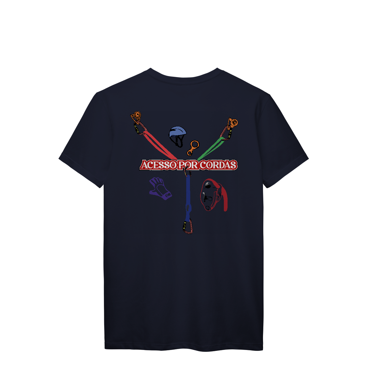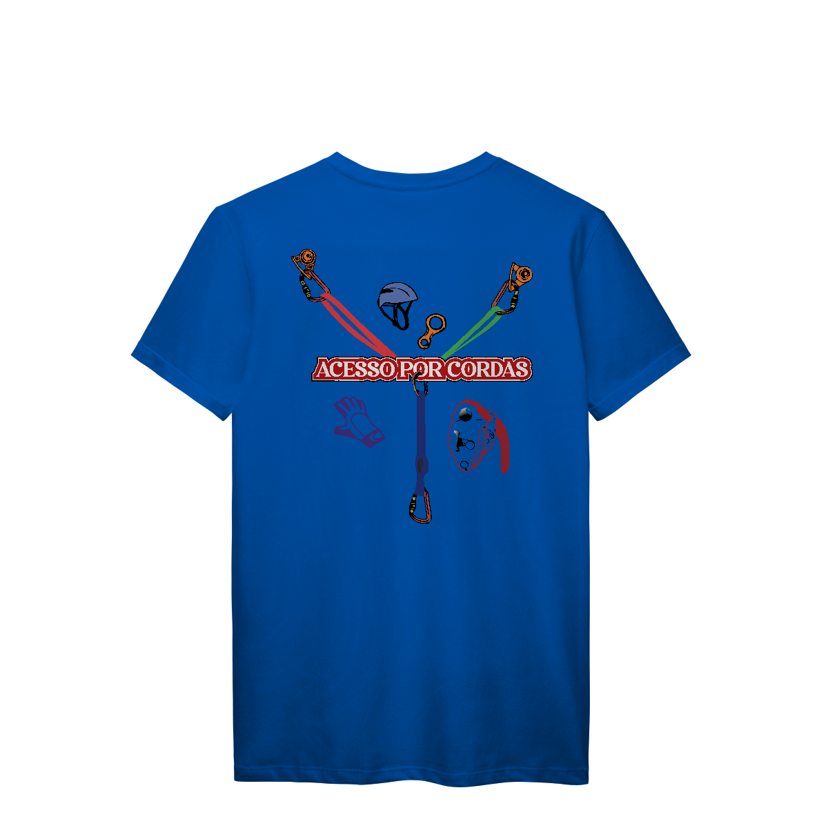A frase “ACESSO POR CORDAS” em letras grandes brancas com contorno vermelho atravessa o centro, deixando claro o tema da estampa.