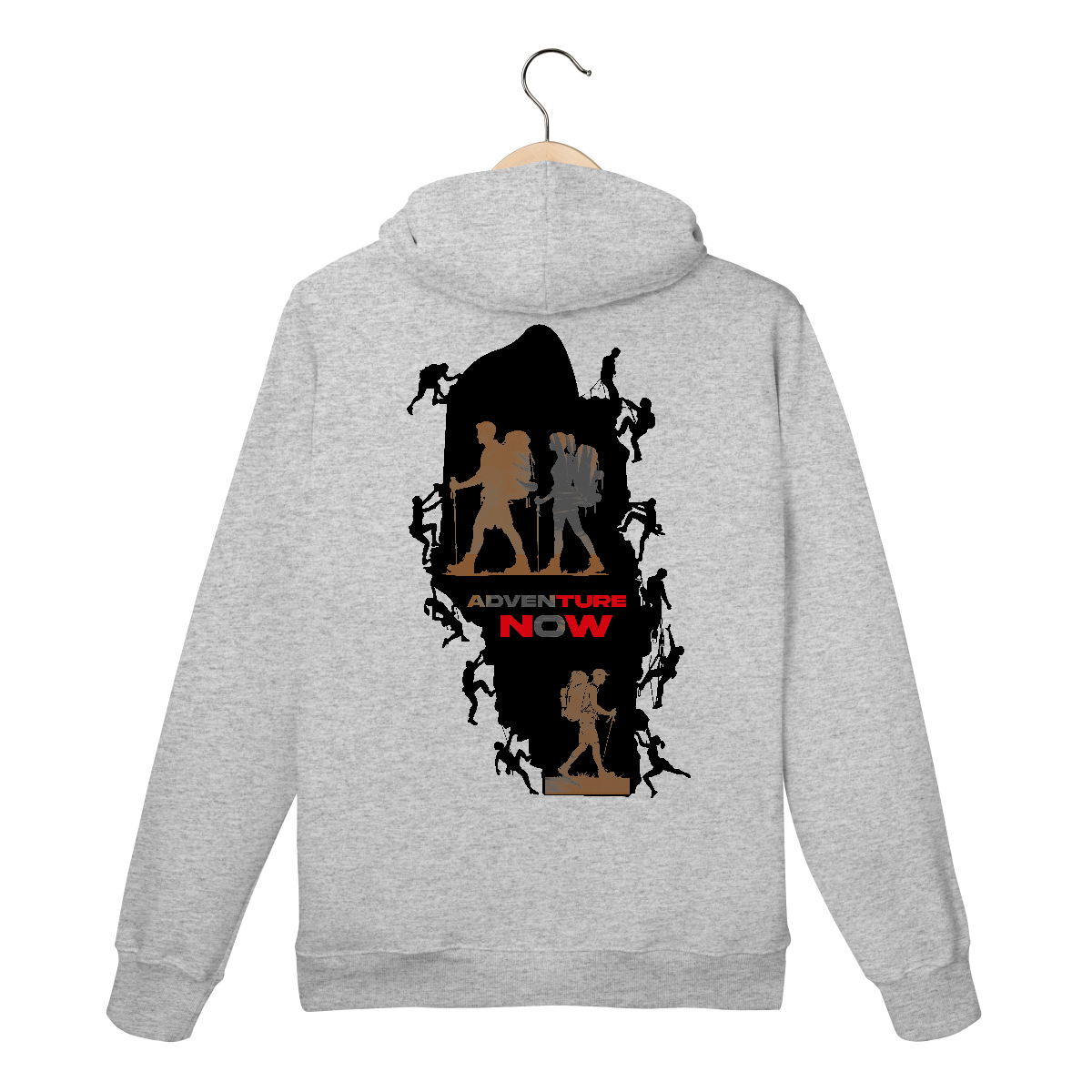 Essa estampa é um convite visual à liberdade e ao espírito aventureiro. Em destaque, três silhuetas em tons terrosos representam homens e mulheres em trilha, equipados com mochilas cargueiras e bastões de caminhada — um retrato fiel dos exploradores modernos.