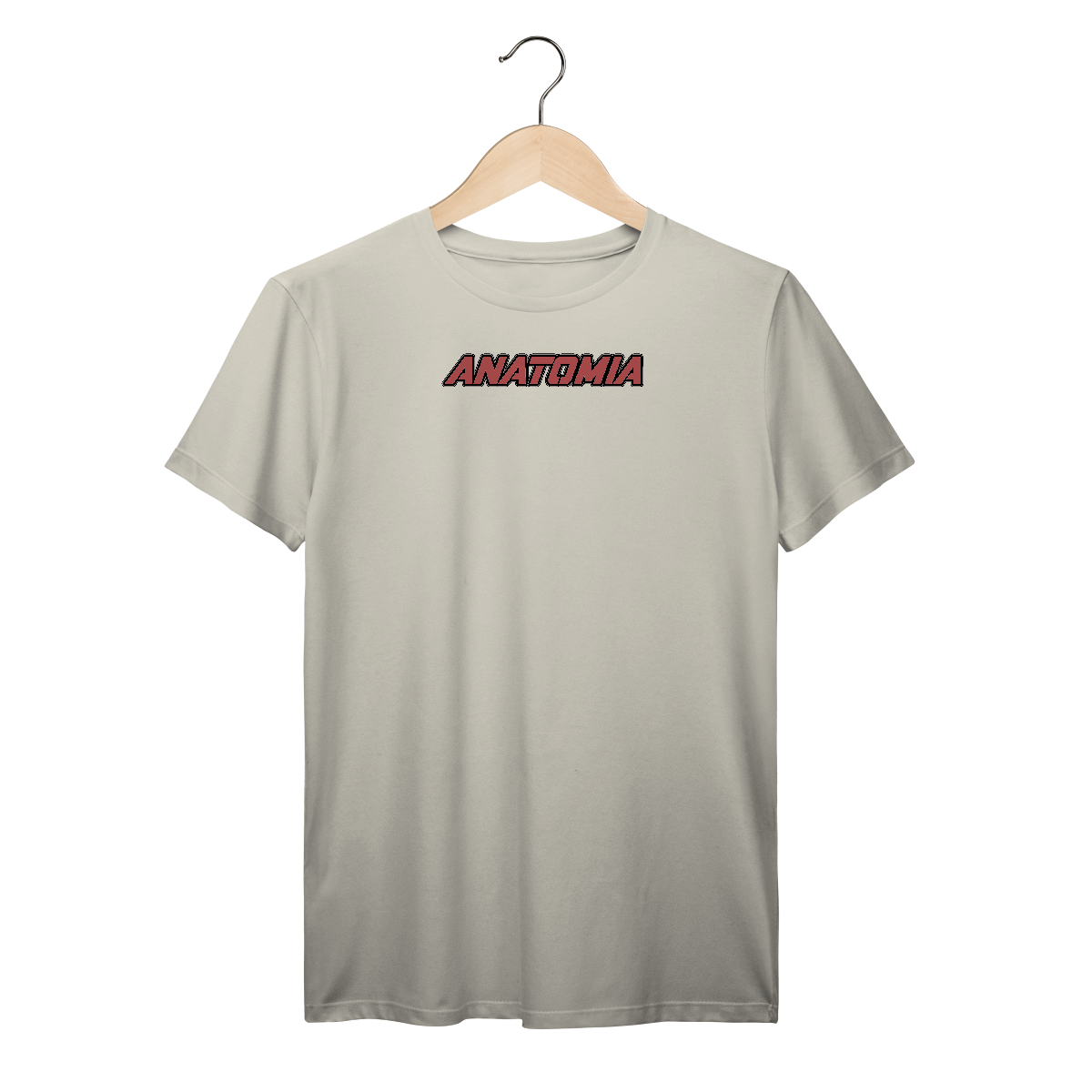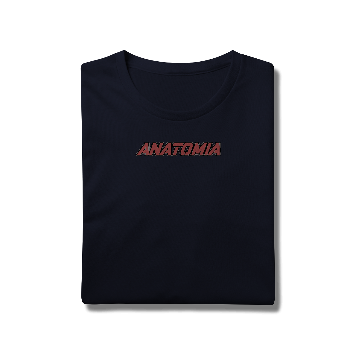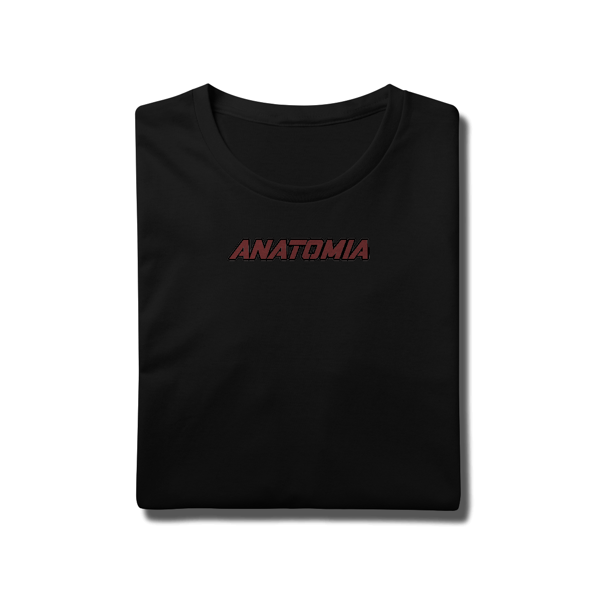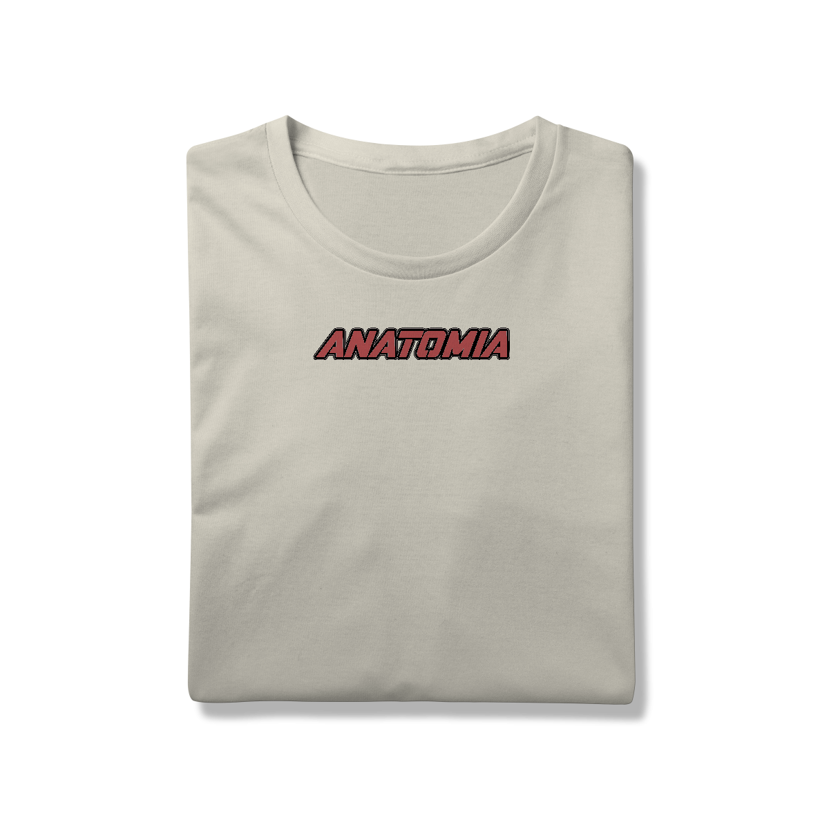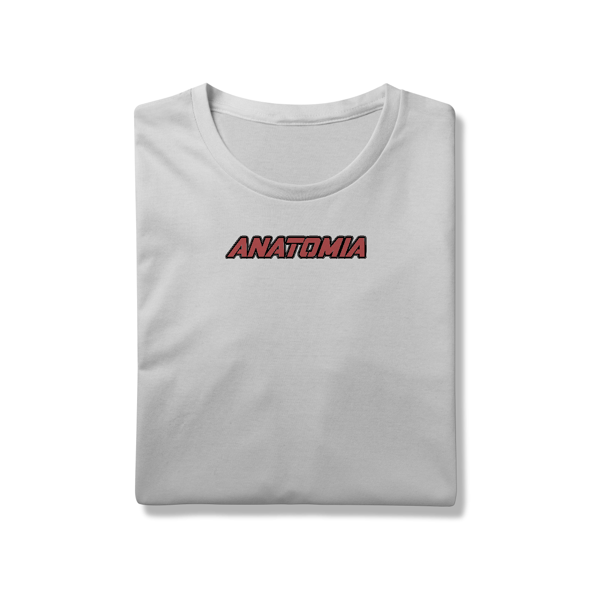 • Tipografia robusta com a palavra “ANATOMIA” em destaque, escrita na vertical com cor vermelha e contorno preto, agregando impacto visual e identidade acadêmica.