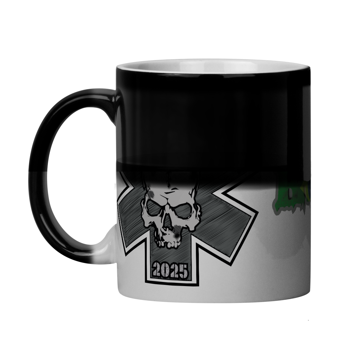 • Ao centro, uma caveira sombria com o bastão de Asclépio gravado no crânio, simbolizando a fusão entre a morte iminente e o salvamento.