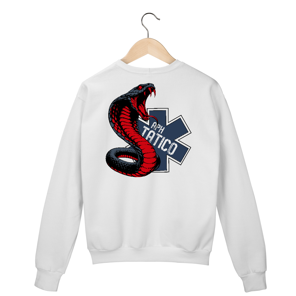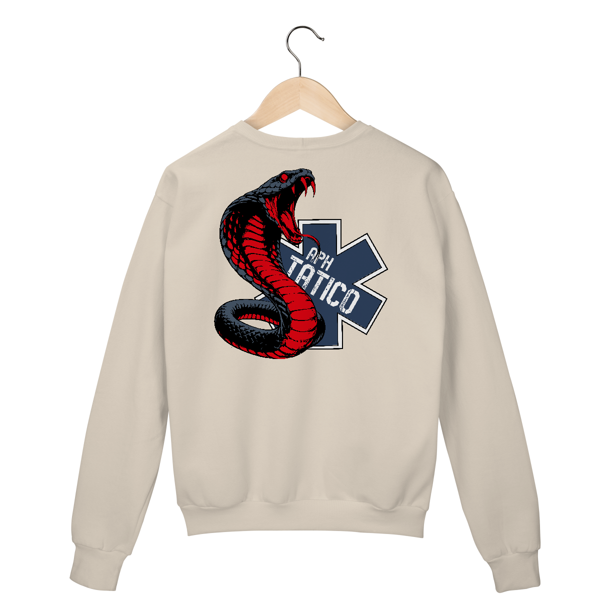 Ao fundo, aparece a estrela da vida (símbolo do APH - Atendimento Pré-Hospitalar) em azul escuro com bordas brancas, onde está escrito em fonte tática e desgastada: APH TÁTICO. A combinação da cobra com a tipografia e o símbolo do APH comunica força, coragem e atuação em situações extremas.
