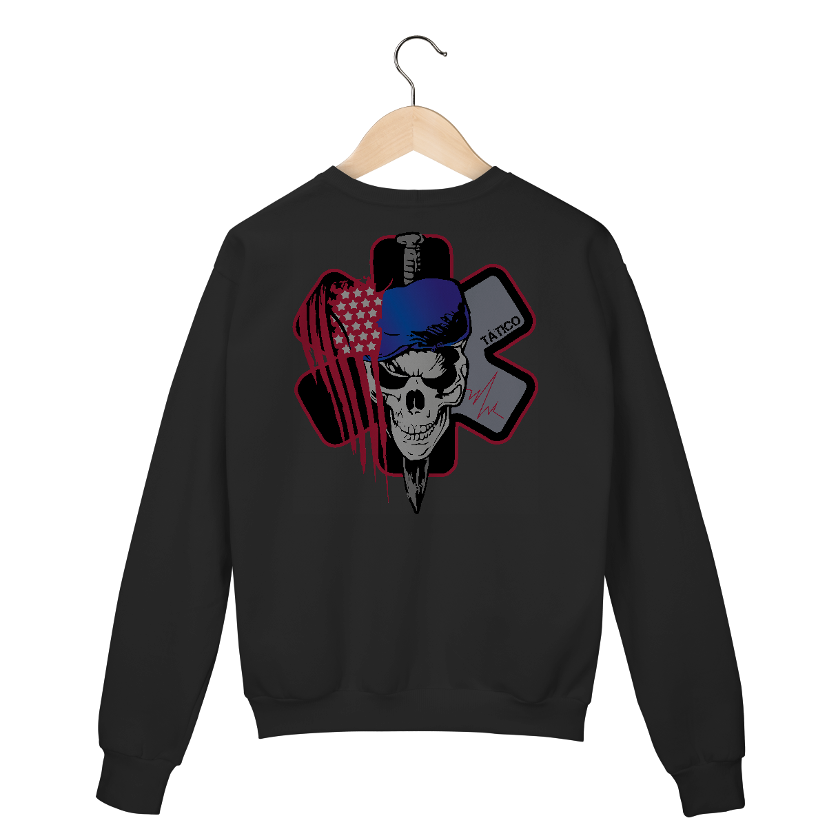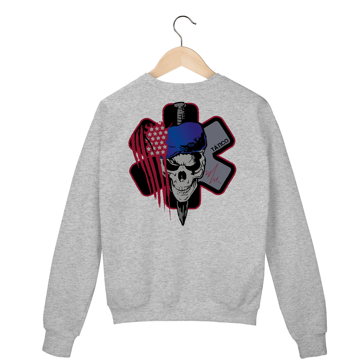 • Abaixo, uma caveira com boina azul (referência a equipes táticas ou forças especiais de APH), ao centro da estrela da vida estilizada em preto e cinza, com detalhes em vermelho.