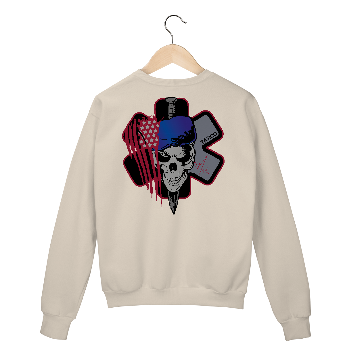 • No fundo, o texto “TÁTICO” e um traçado de sinal de vida (batimento cardíaco) completam a ideia de prontidão médica e agressividade no resgate.