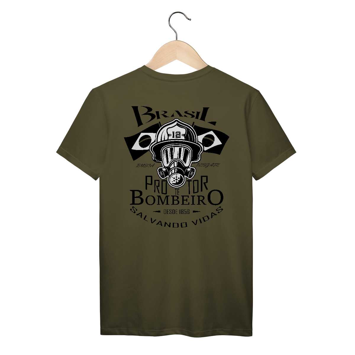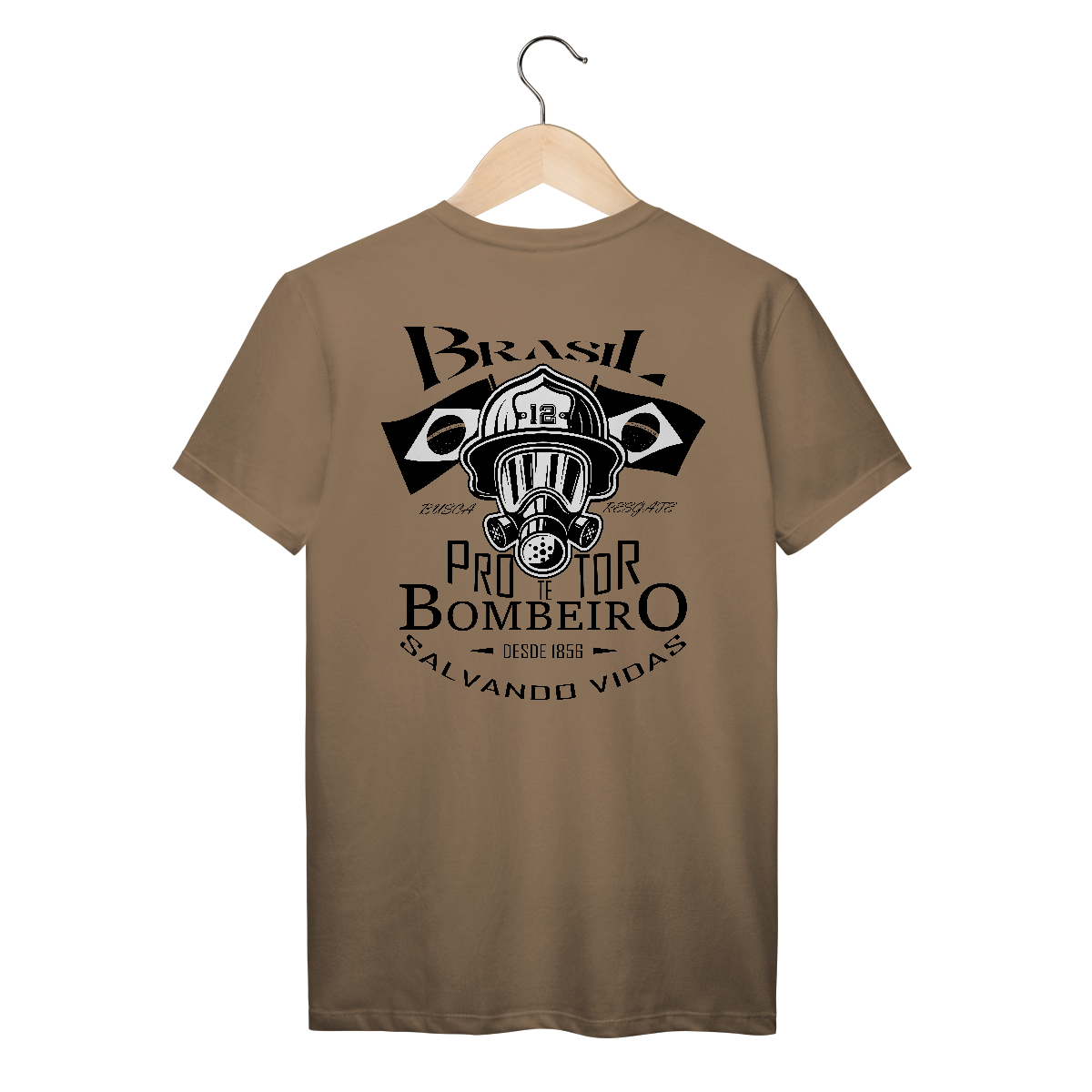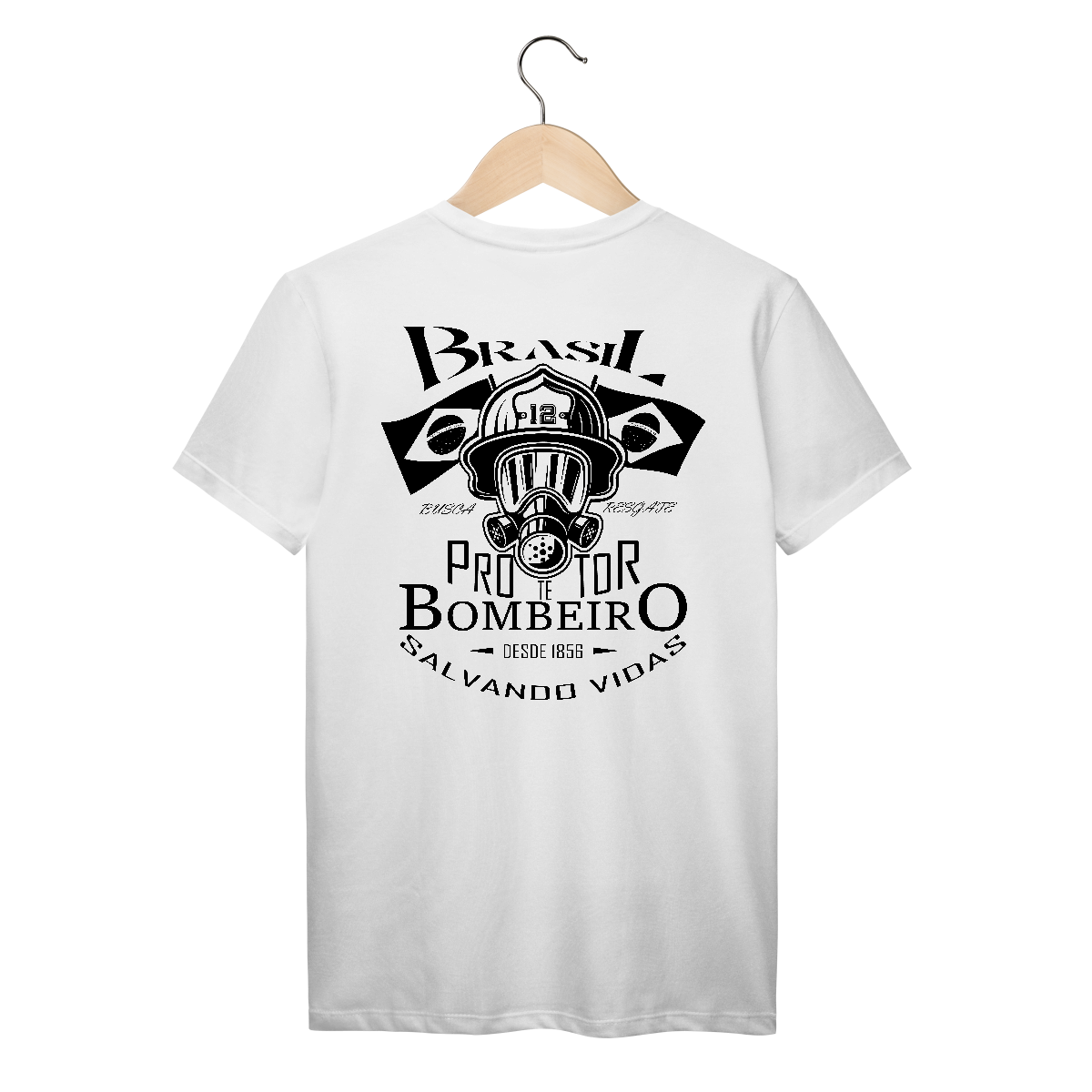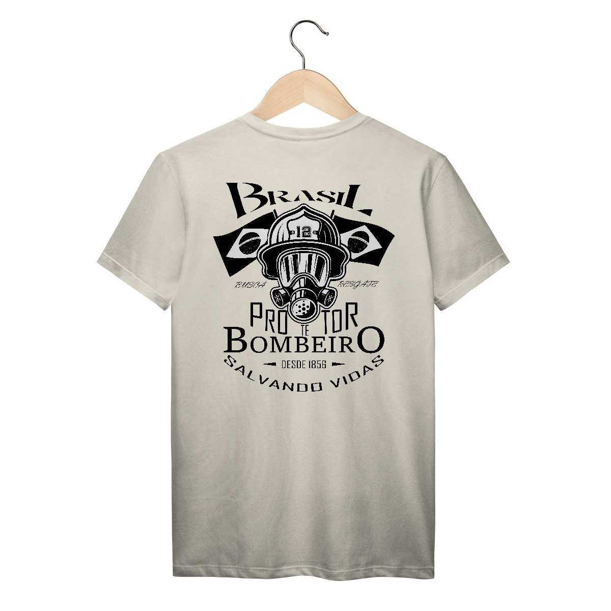 Estilo minimalista e marcante. Um respirador completo com capacete de bombeiro número 12 e bandeiras laterais. Representa o combate em ambientes extremos e o orgulho da corporação.