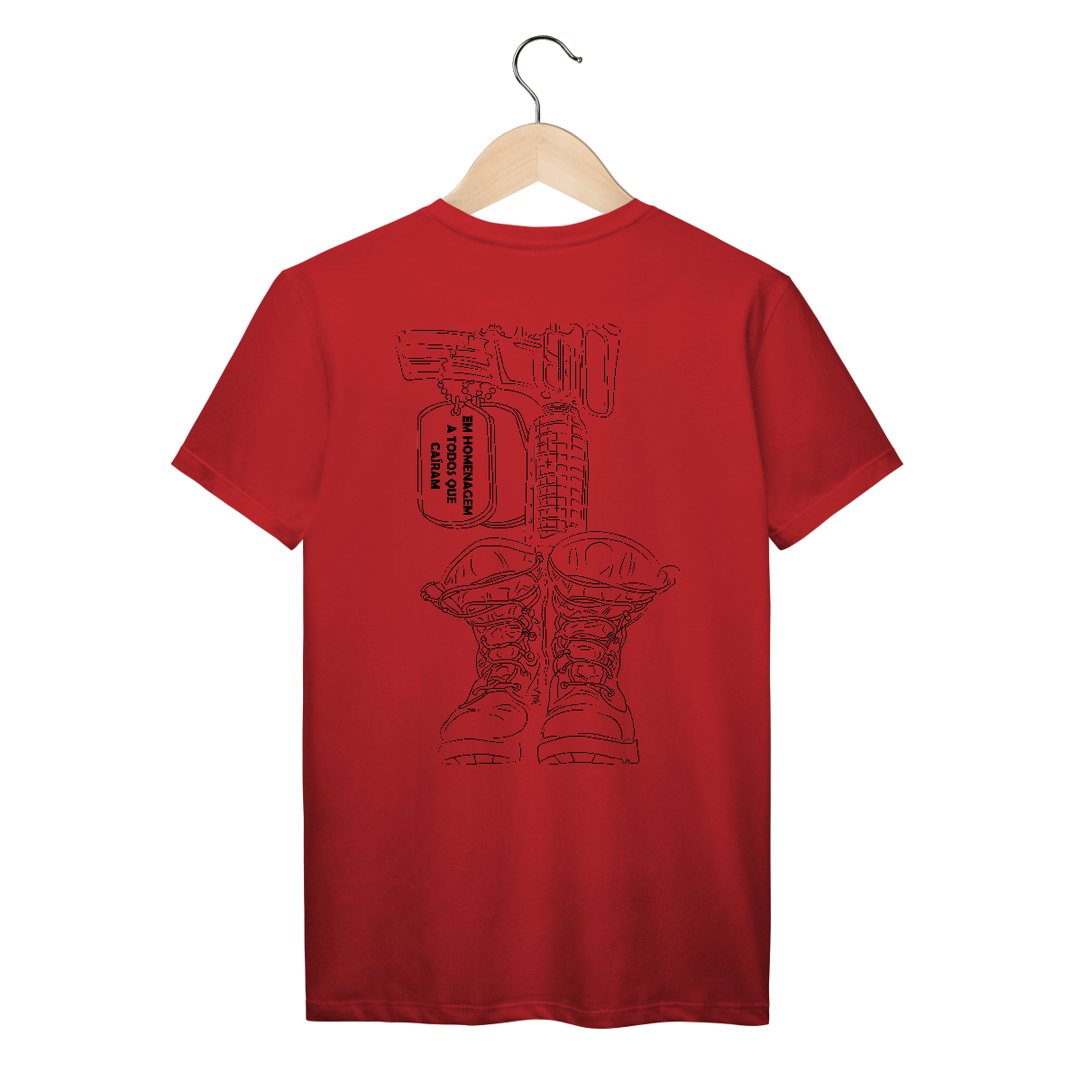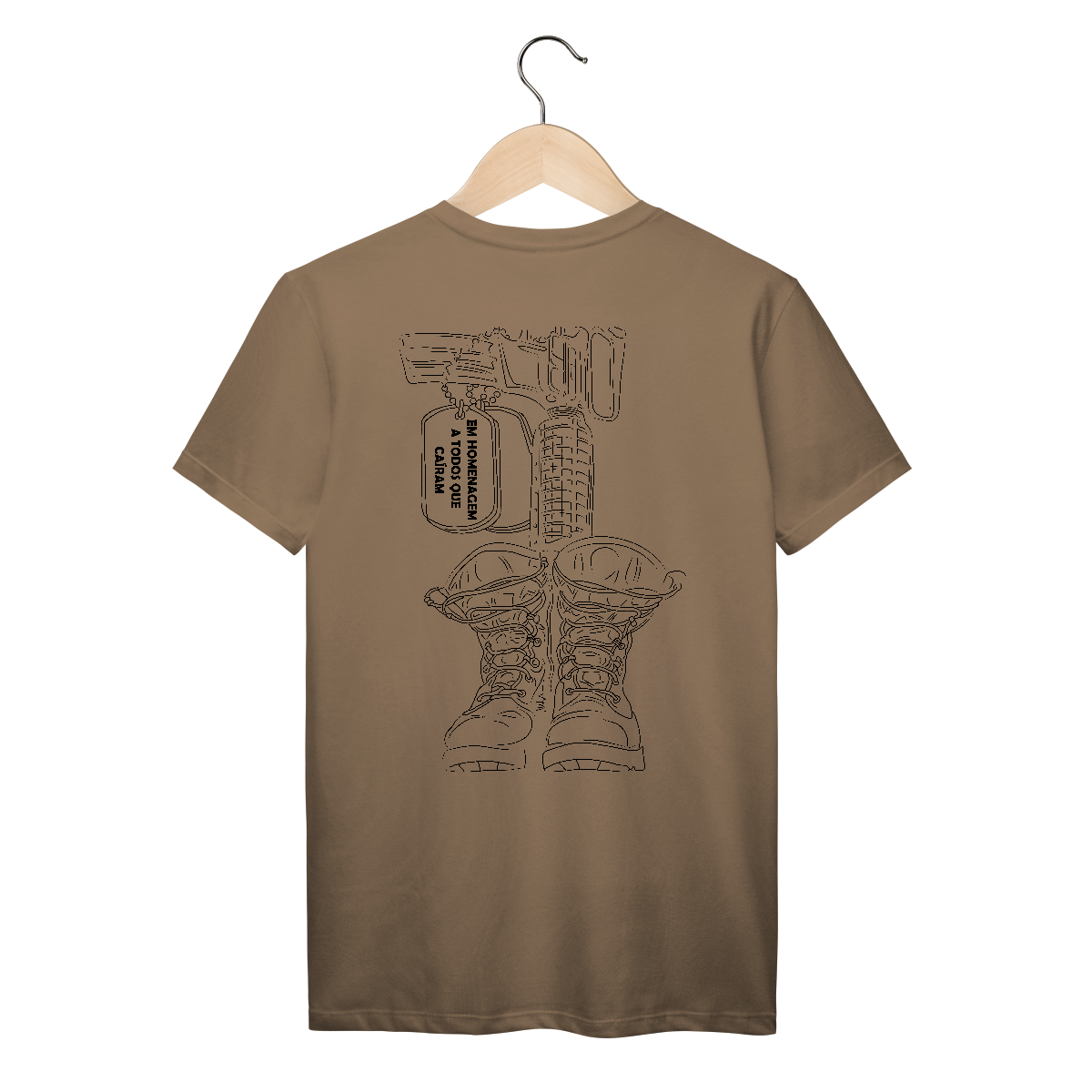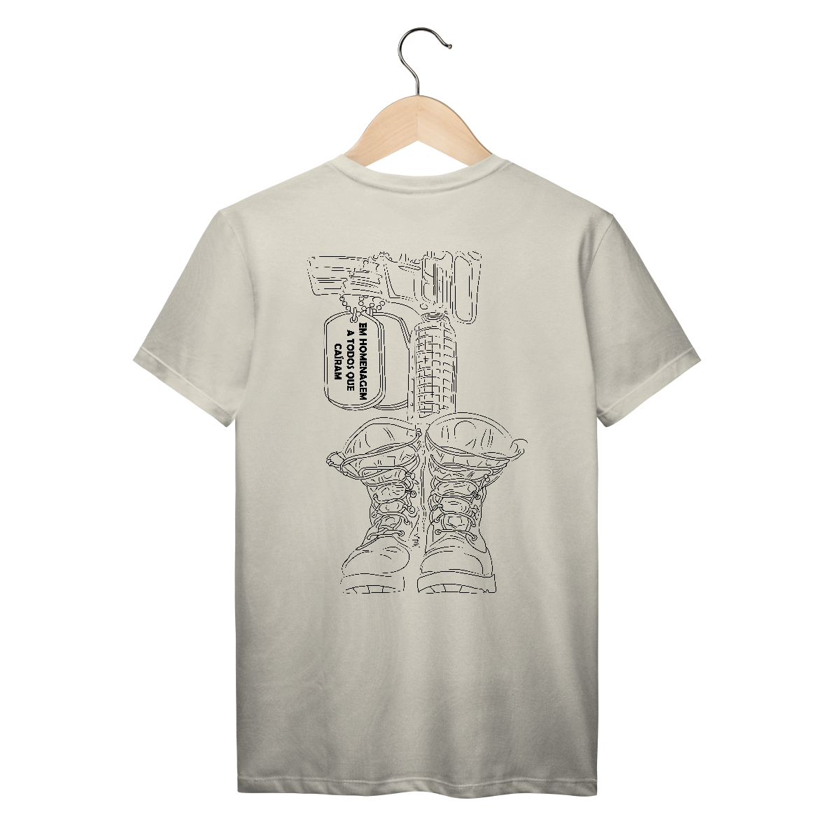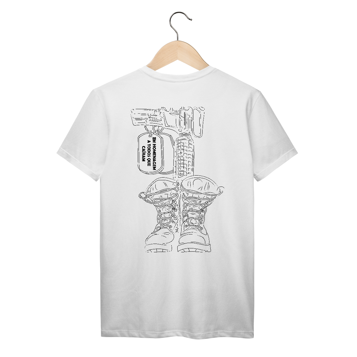 Esta estampa impactante presta homenagem a todos os heróis que deram suas vidas em serviço. A imagem do fuzil cravado no chão, as botas alinhadas e as plaquetas com mensagem de honra formam um símbolo profundo de respeito, sacrifício e memória.