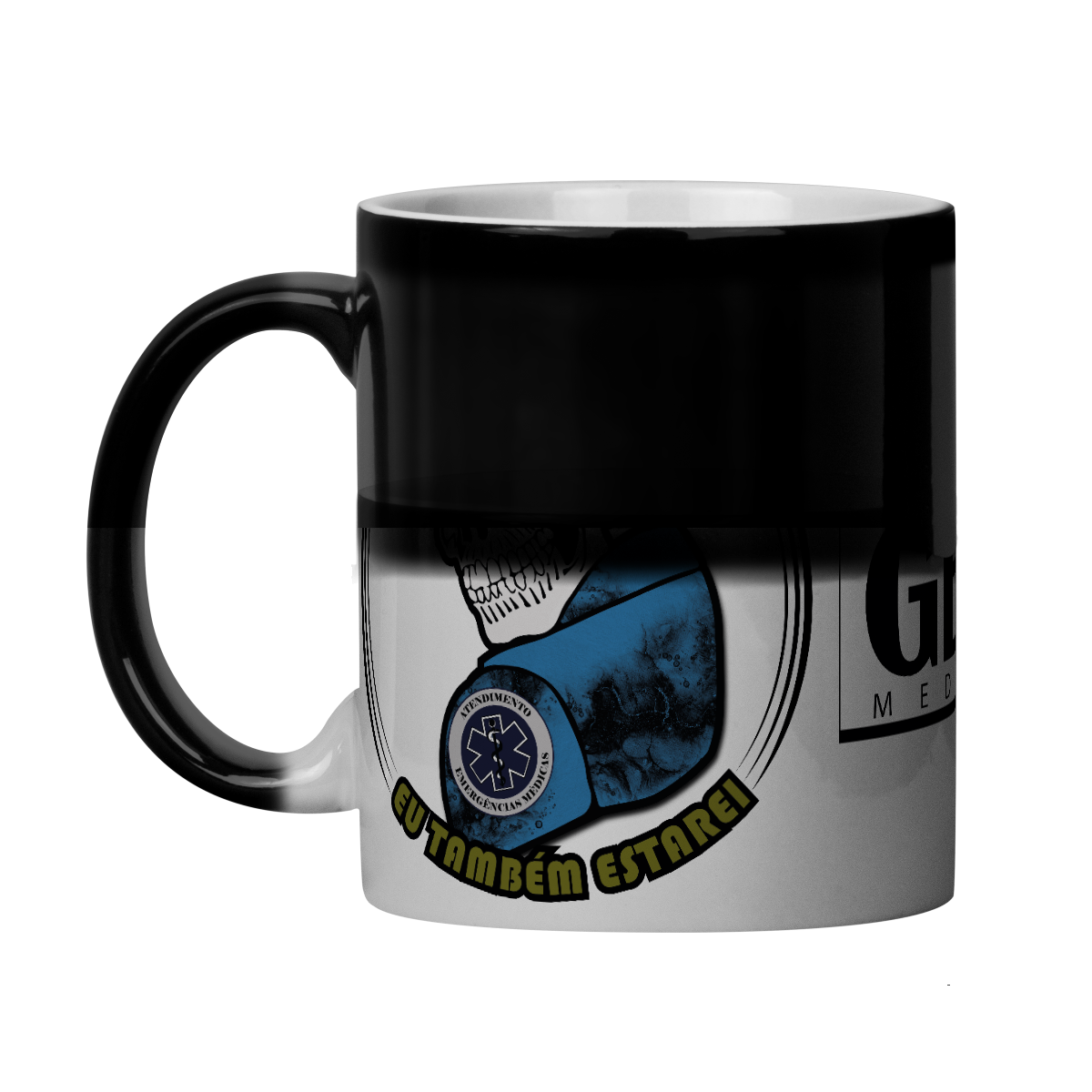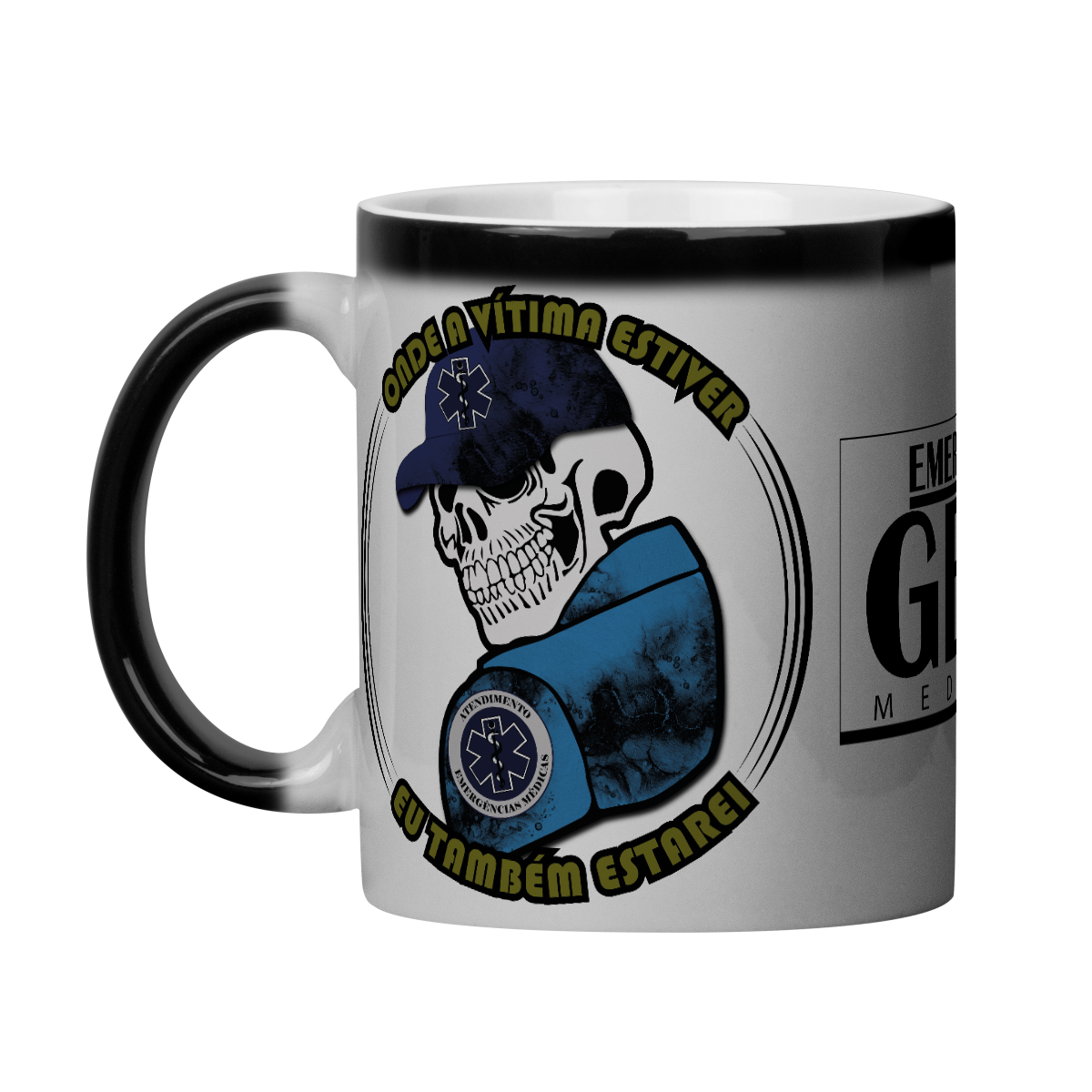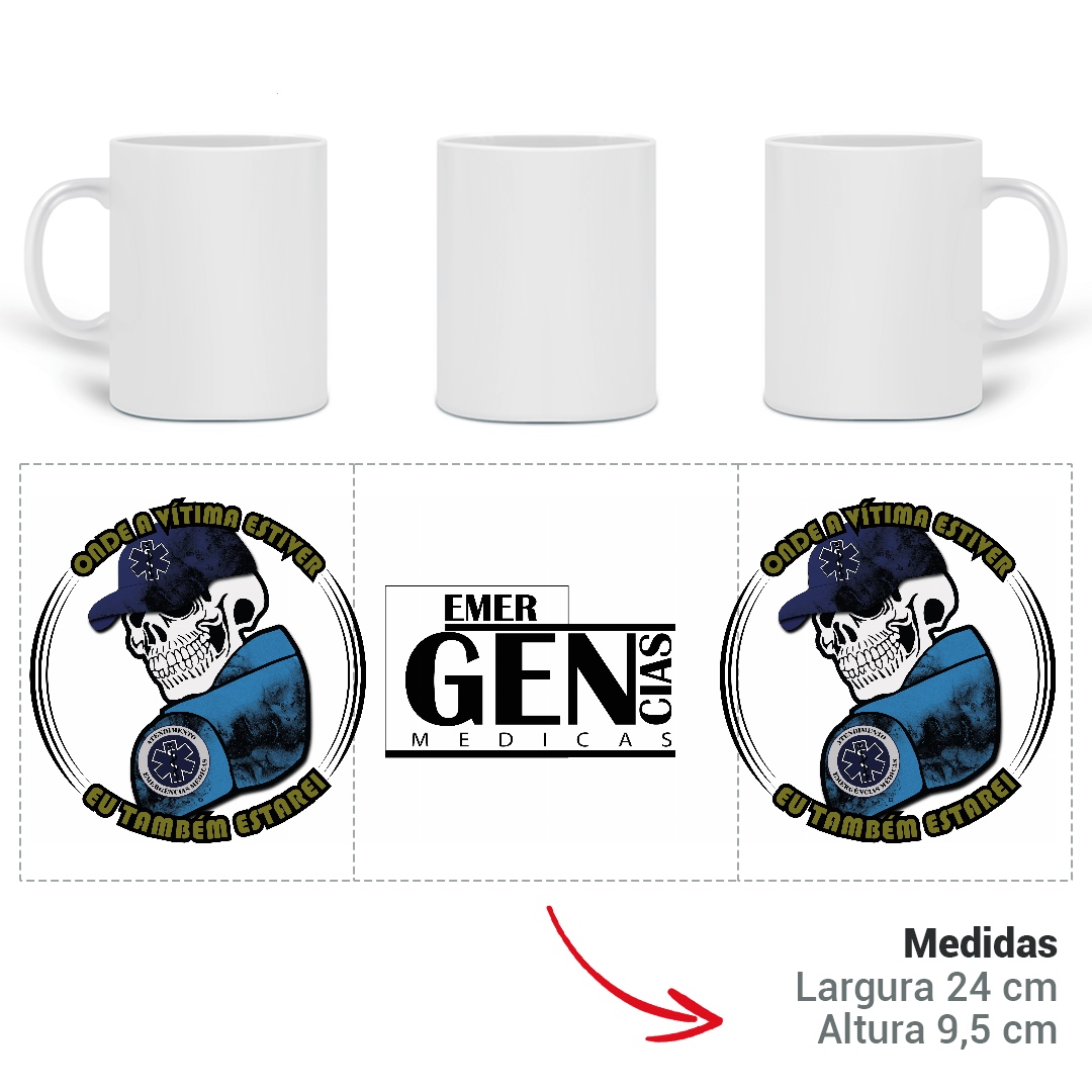 A arte apresenta uma caveira com boné azul-marinho ostentando a Estrela da Vida, símbolo internacional do atendimento pré-hospitalar. O personagem veste uniforme tático na cor azul com detalhes sombreados em preto, transmitindo seriedade e prontidão.