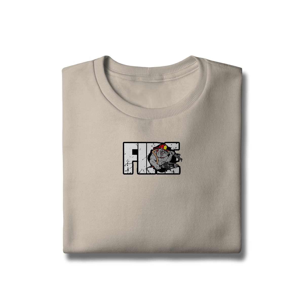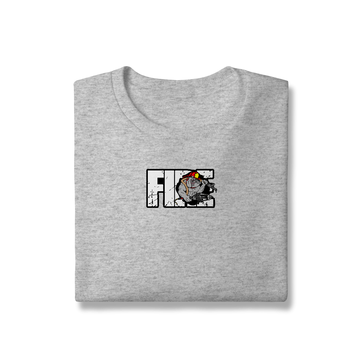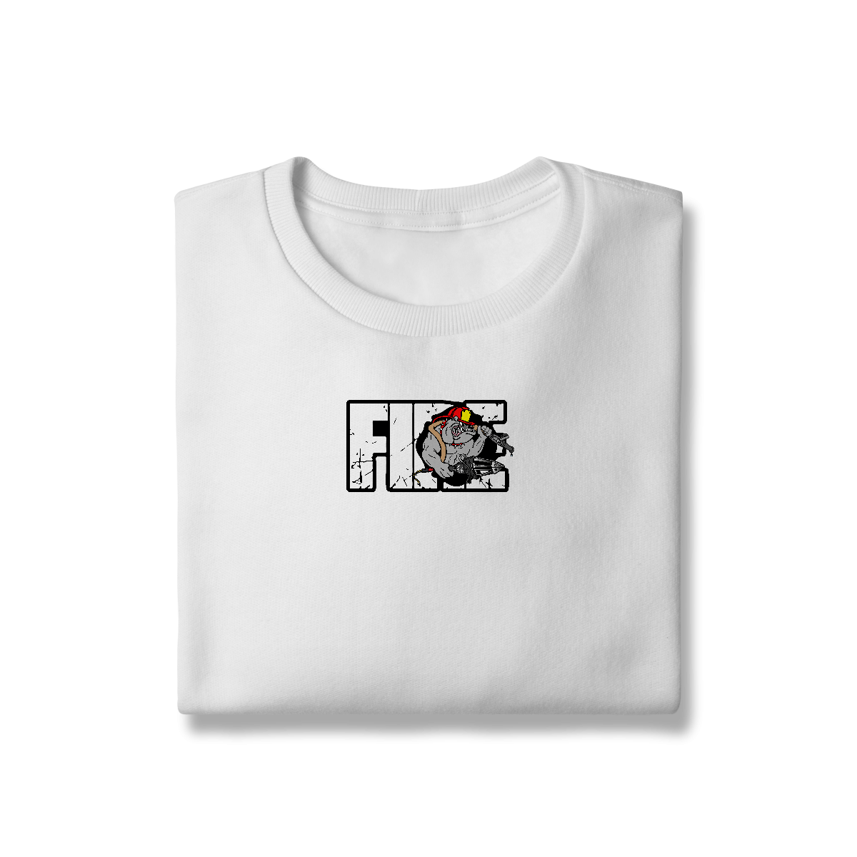 Bulldog bombeiro musculoso usando ferramenta hidráulica em frente à palavra "FIRE". Uma estampa divertida e agressiva, perfeita para quem tem garra.