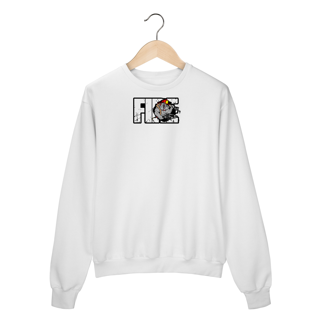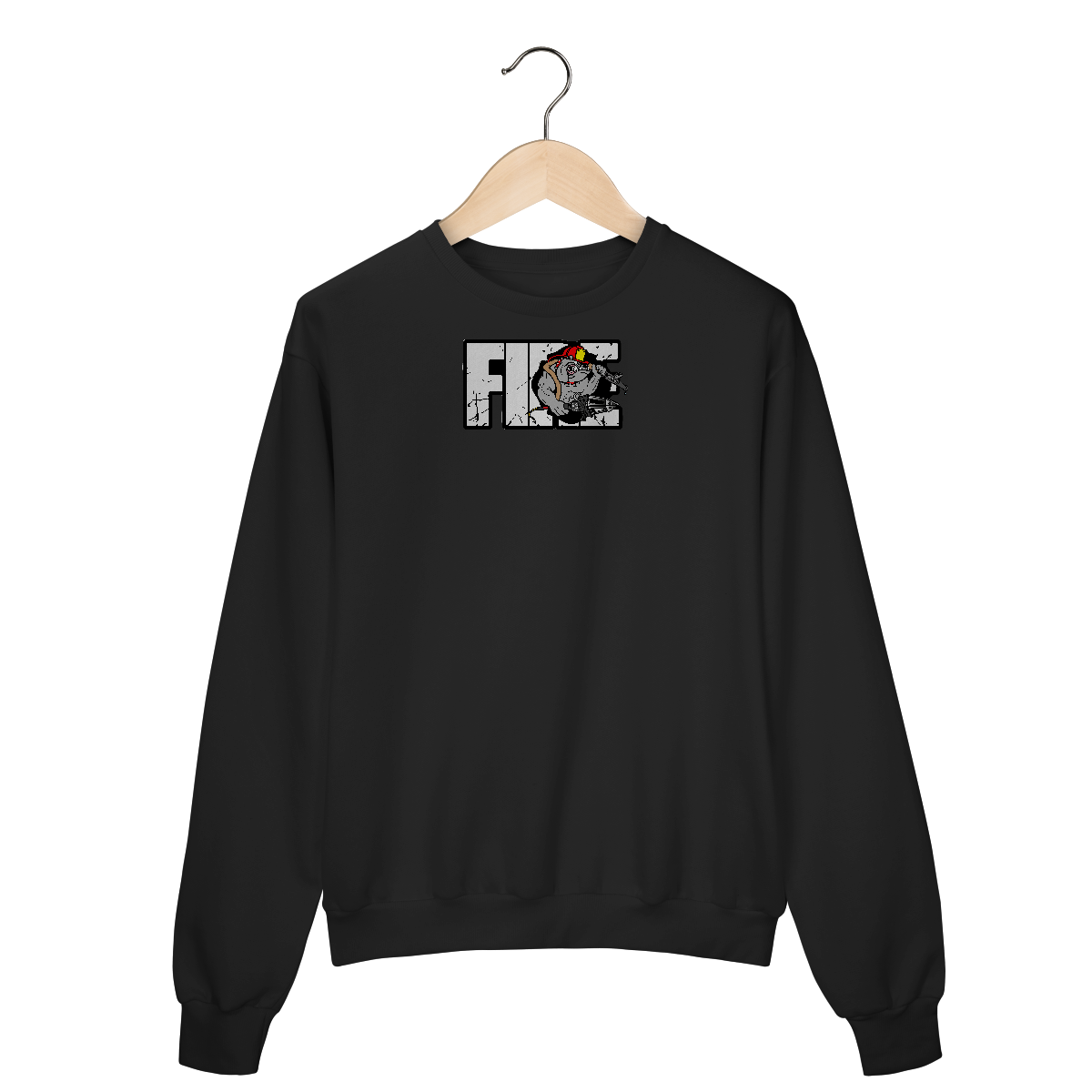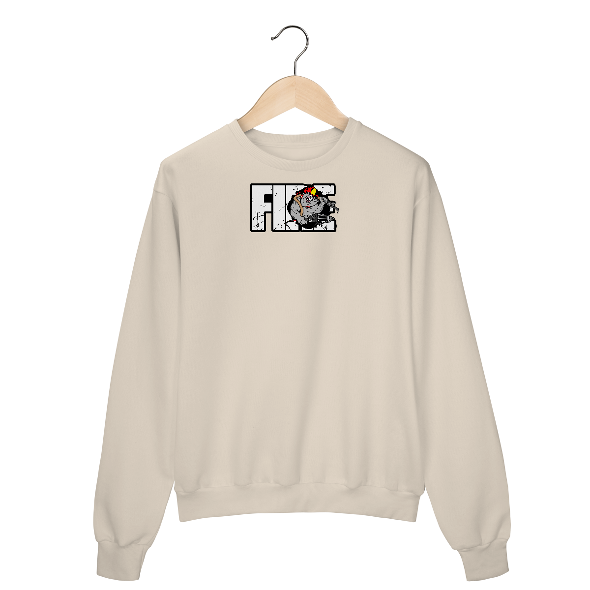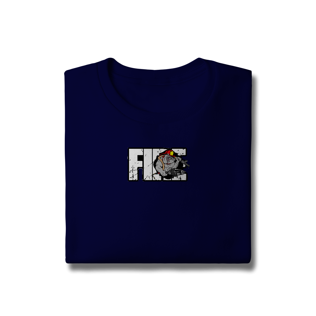 Bulldog bombeiro musculoso usando ferramenta hidráulica em frente à palavra "FIRE". Uma estampa divertida e agressiva, perfeita para quem tem garra.