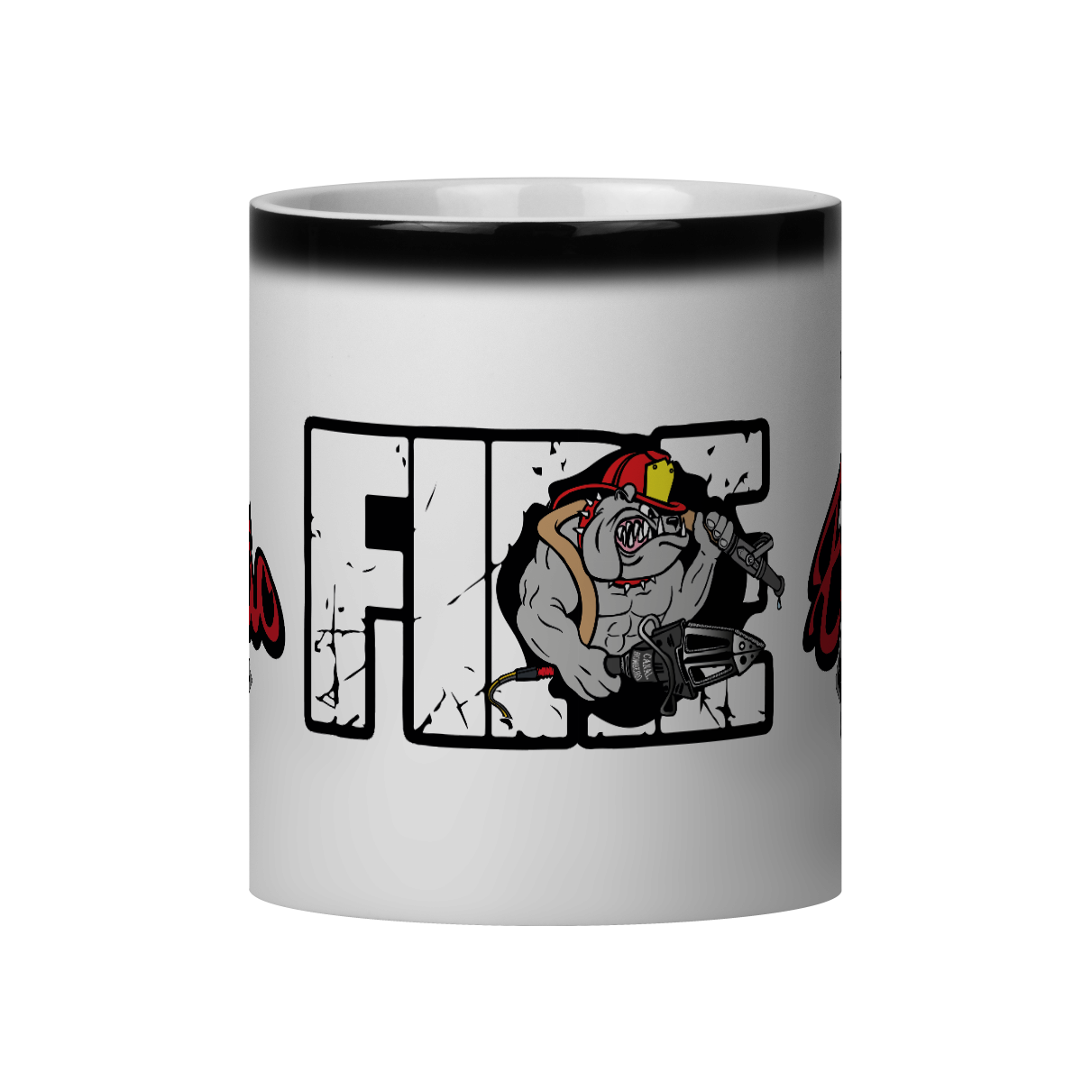Bulldog bombeiro musculoso usando ferramenta hidráulica em frente à palavra "FIRE". Uma estampa divertida e agressiva, perfeita para quem tem garra.