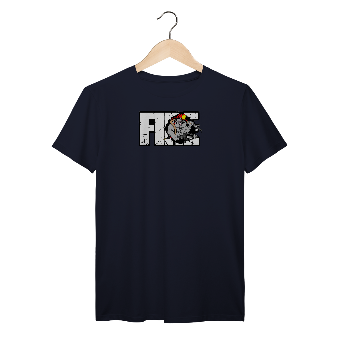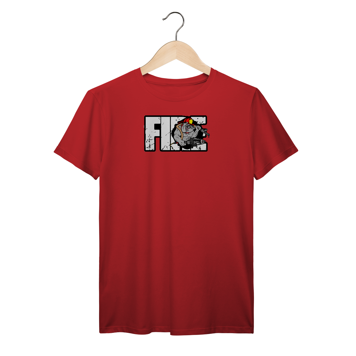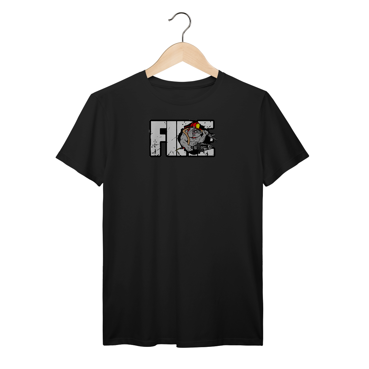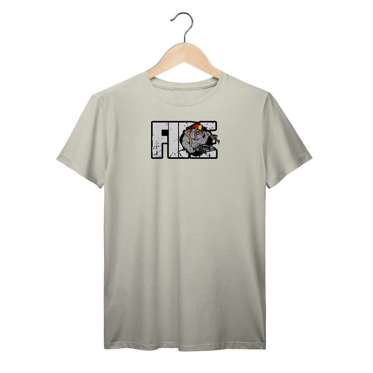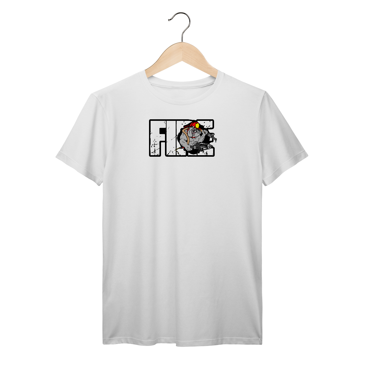 Bulldog bombeiro musculoso usando ferramenta hidráulica em frente à palavra "FIRE". Uma estampa divertida e agressiva, perfeita para quem tem garra.