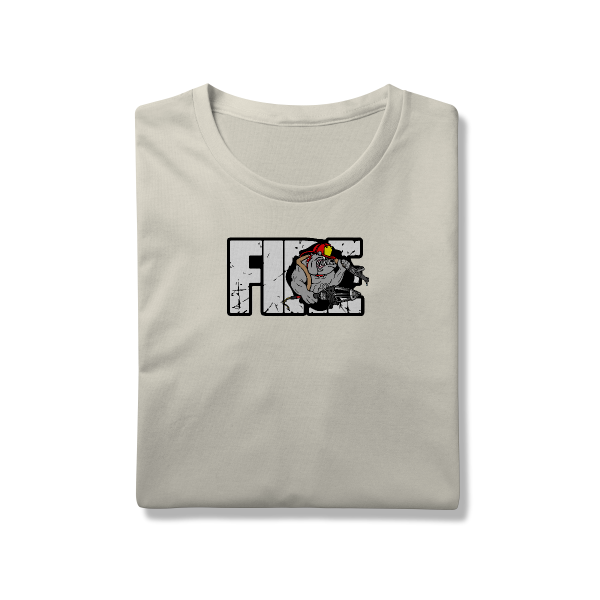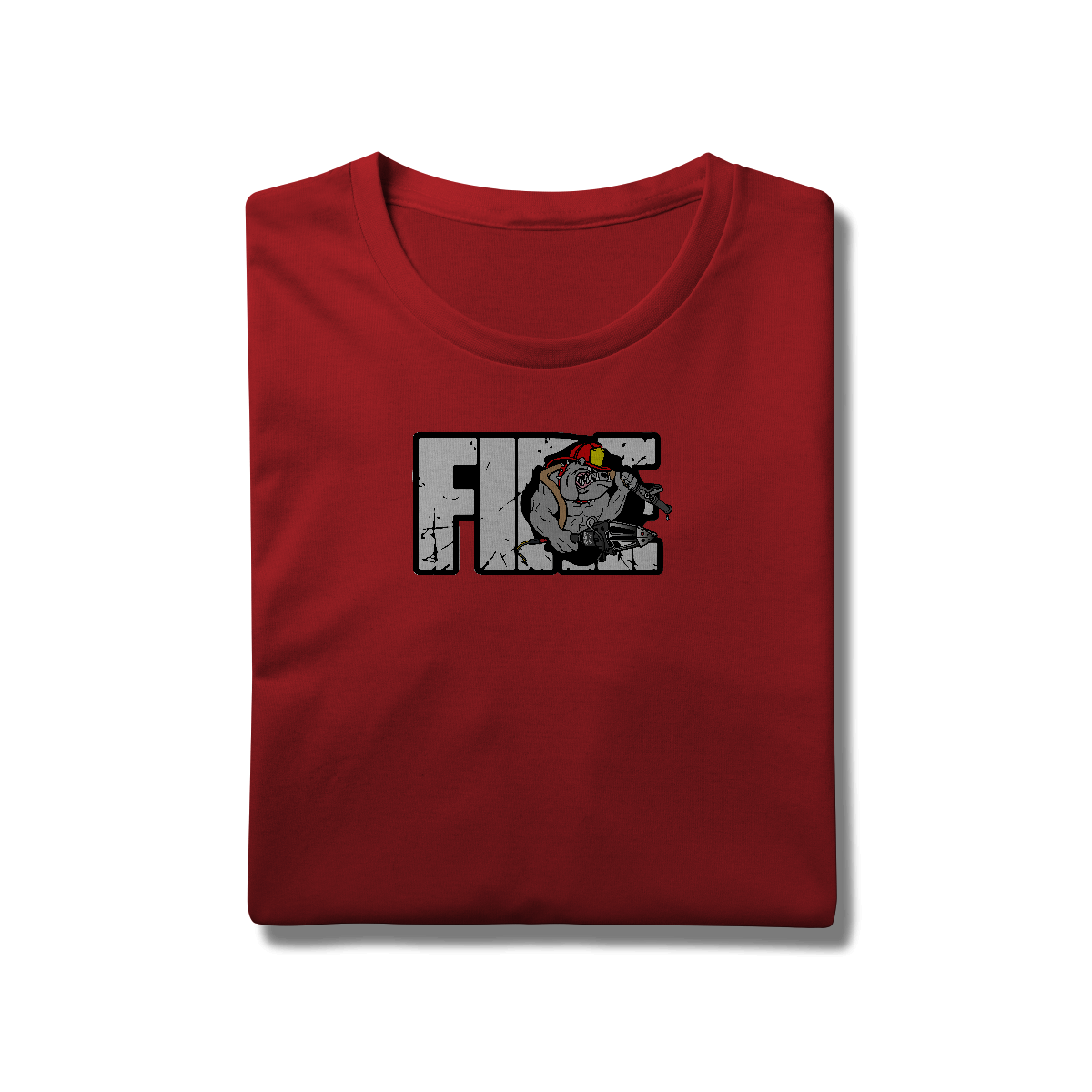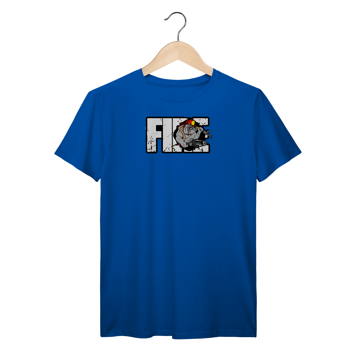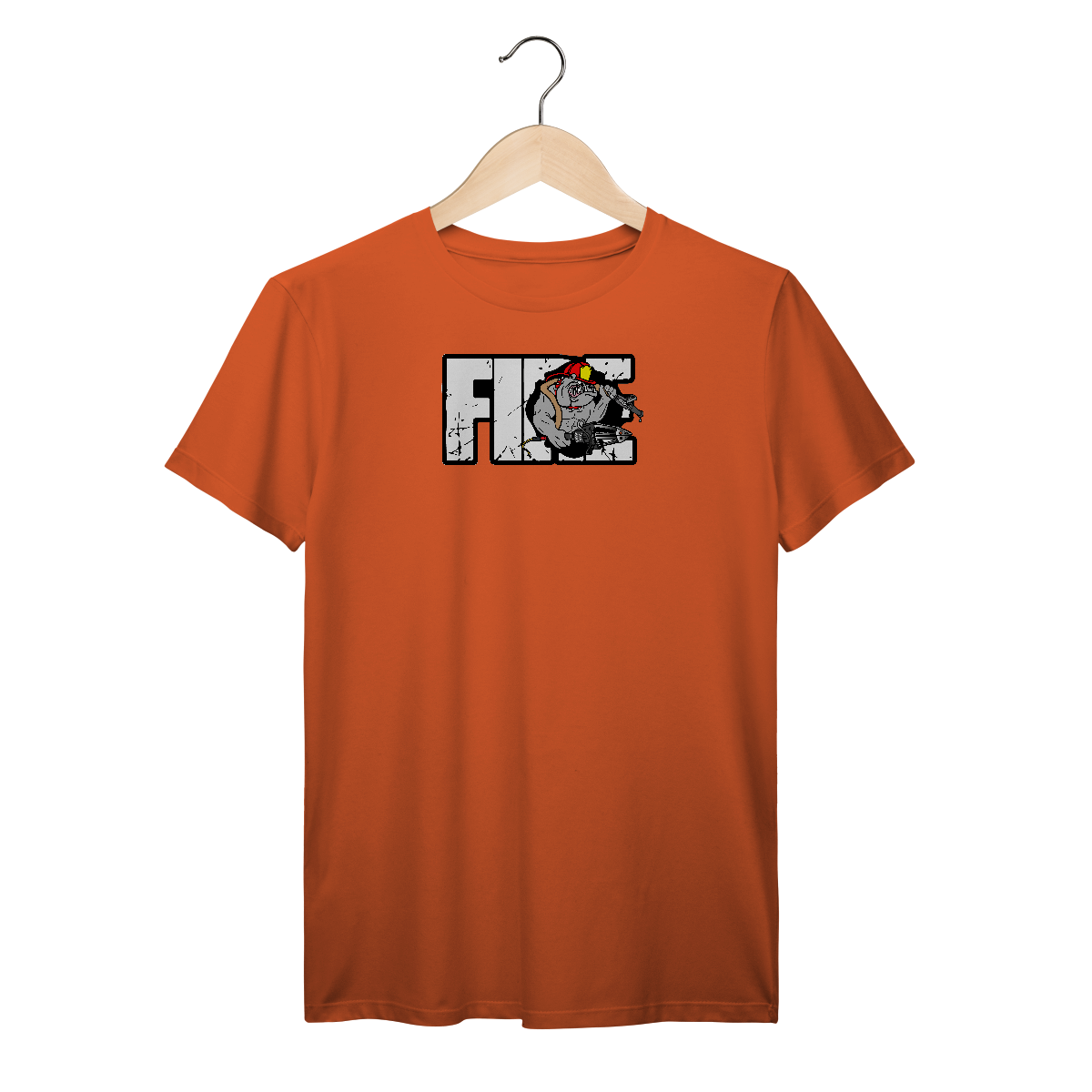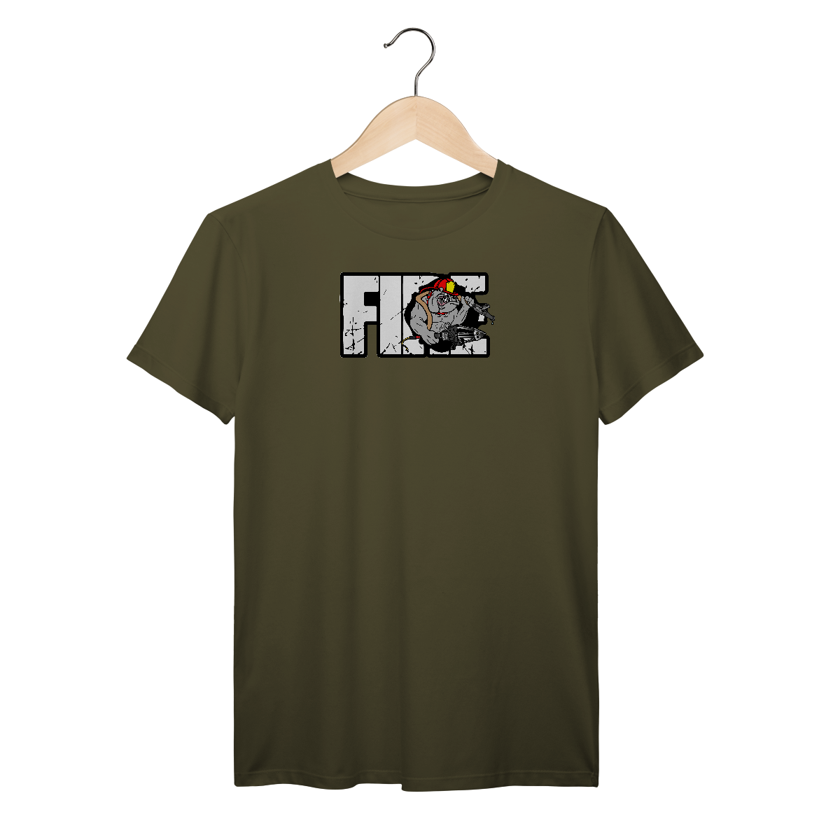 Bulldog bombeiro musculoso usando ferramenta hidráulica em frente à palavra "FIRE". Uma estampa divertida e agressiva, perfeita para quem tem garra.