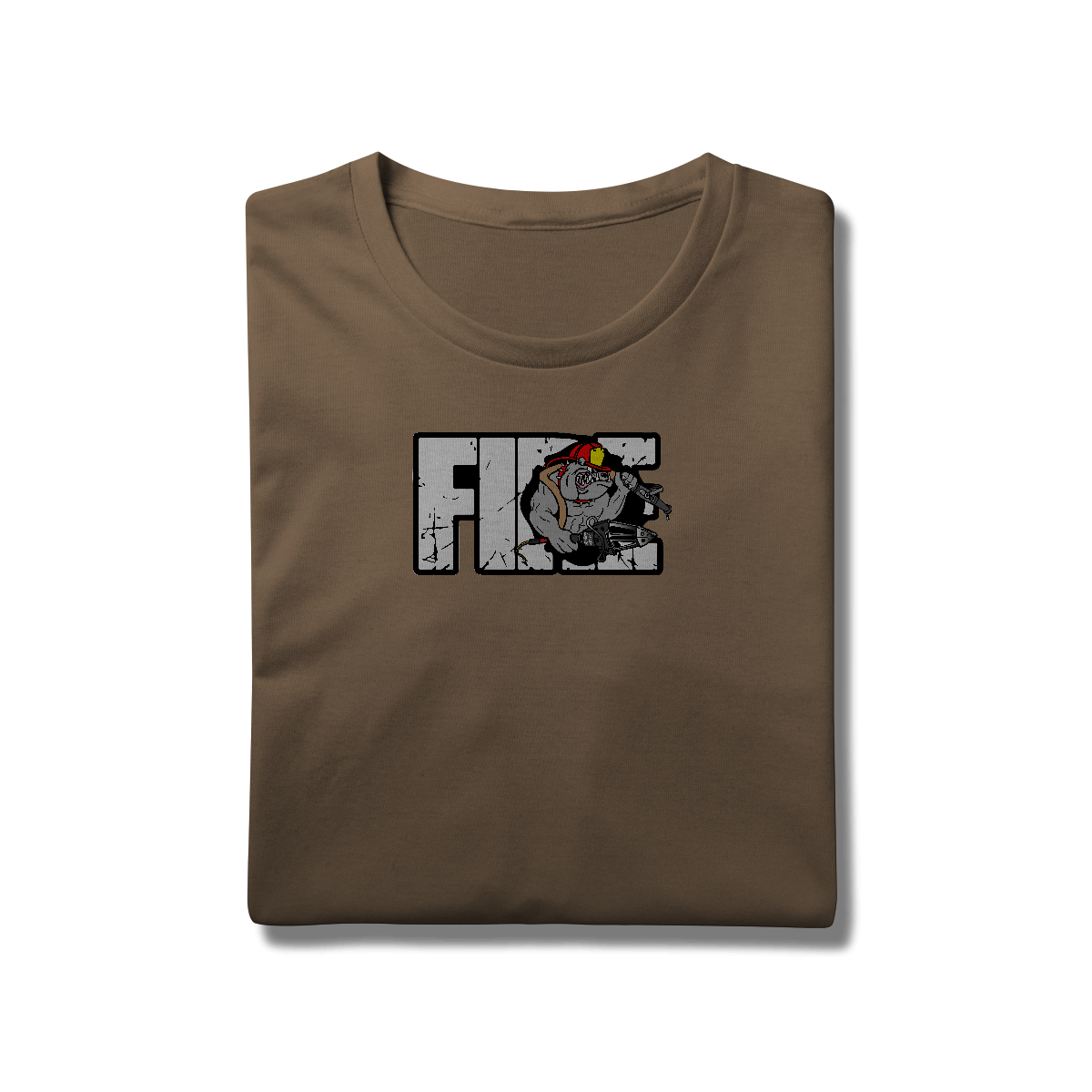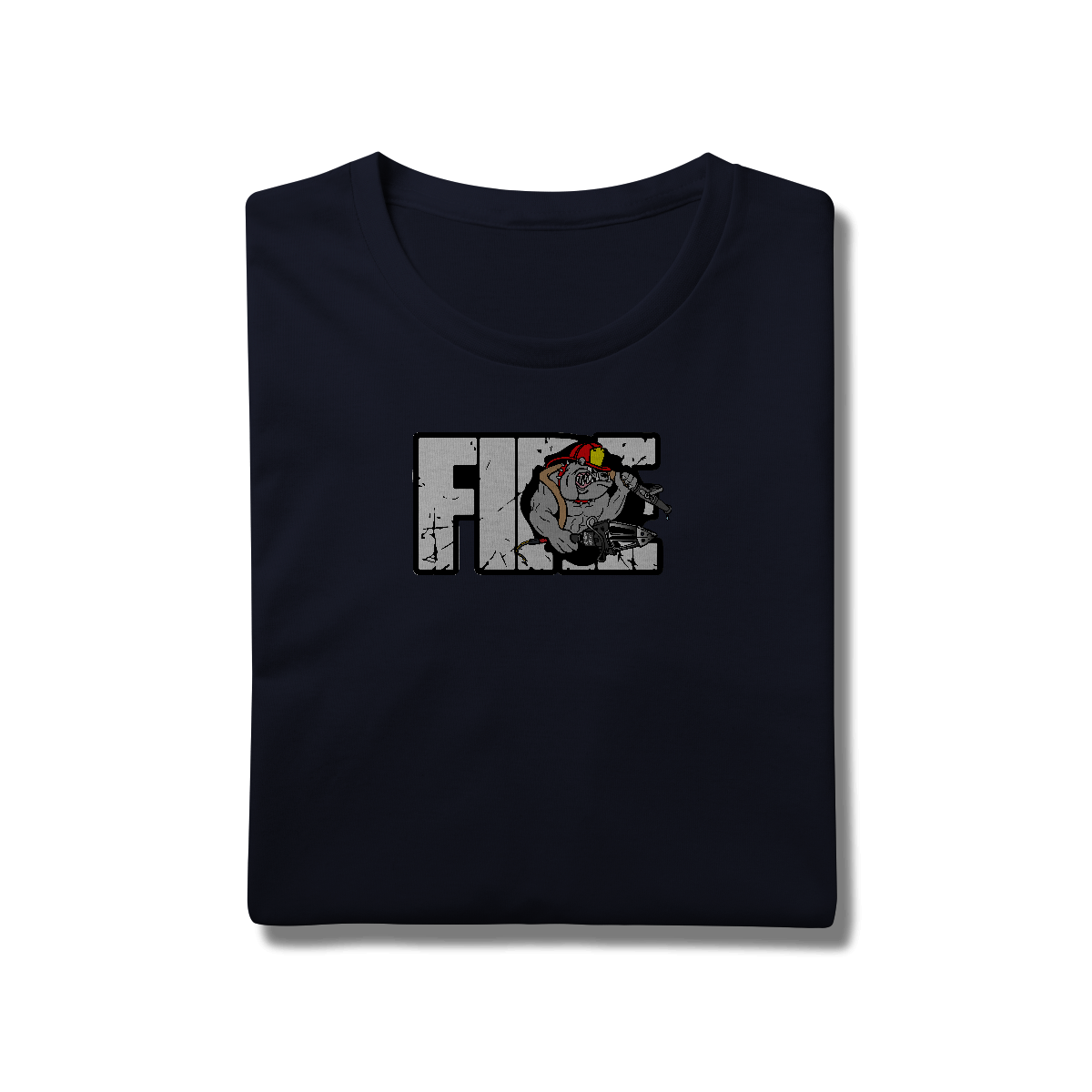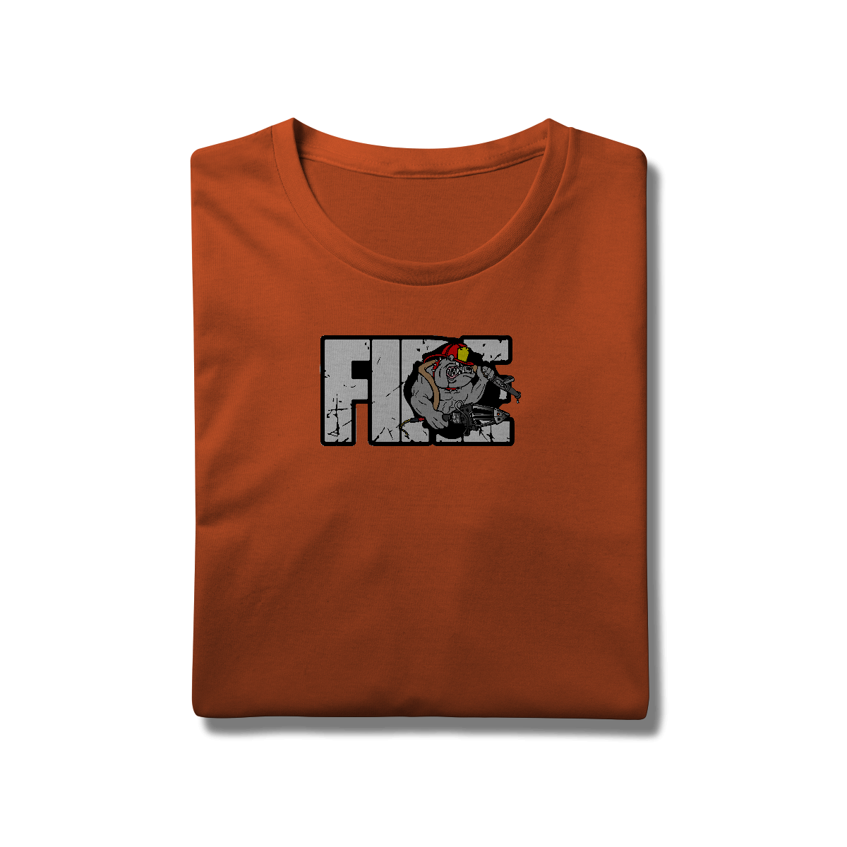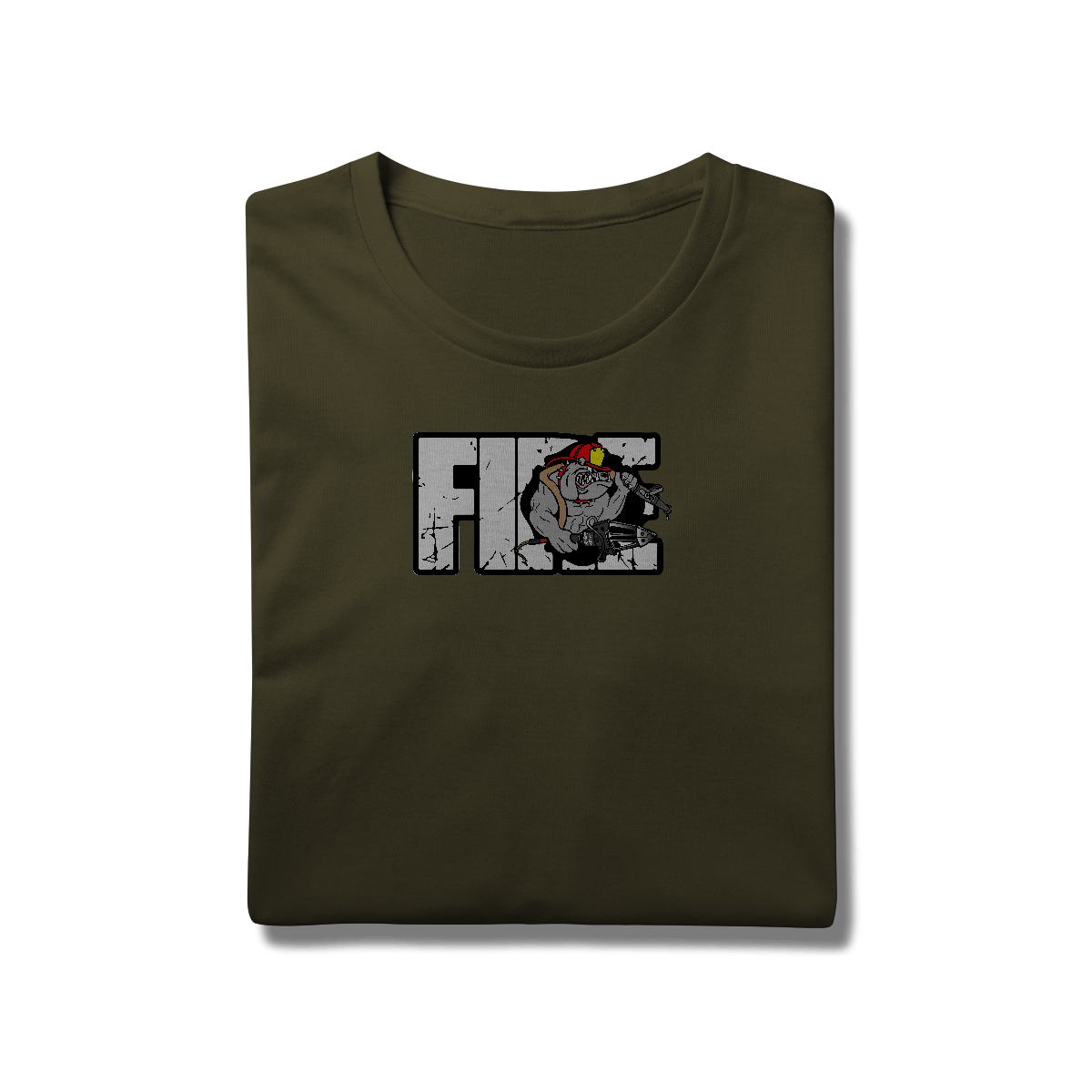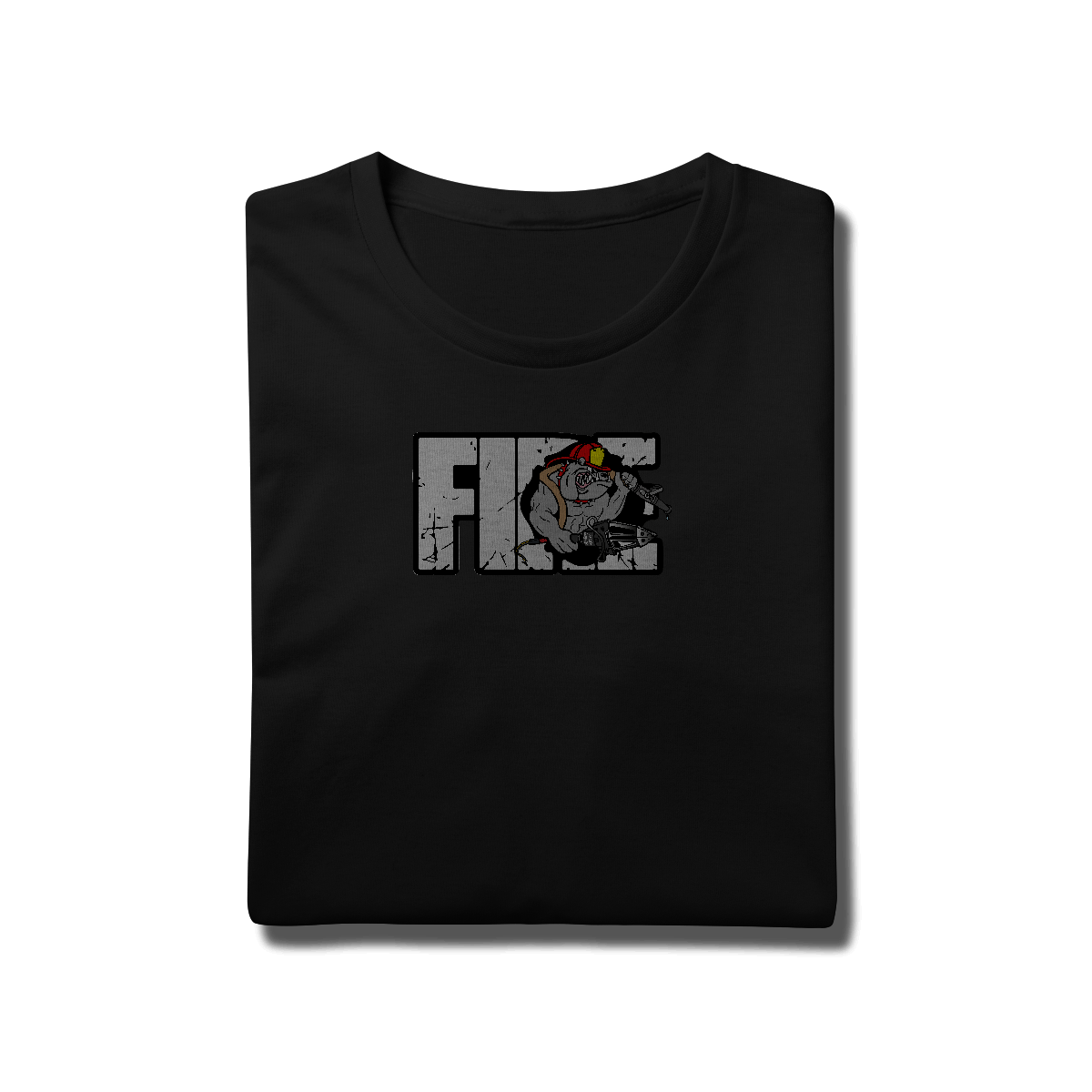 Bulldog bombeiro musculoso usando ferramenta hidráulica em frente à palavra "FIRE". Uma estampa divertida e agressiva, perfeita para quem tem garra.