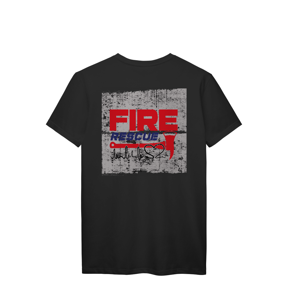 Esta estampa une coragem, resgate e compaixão em um design cheio de personalidade. Com fundo texturizado que remete ao desgaste da madeira e à rusticidade do serviço de emergência, a palavra FIRE em vermelho vibrante se destaca na parte superior, simbolizando ação e intensidade. Abaixo, o termo RESCUE em azul escuro representa o compromisso com o salvamento e a integridade da equipe.