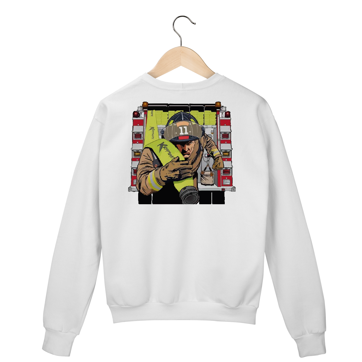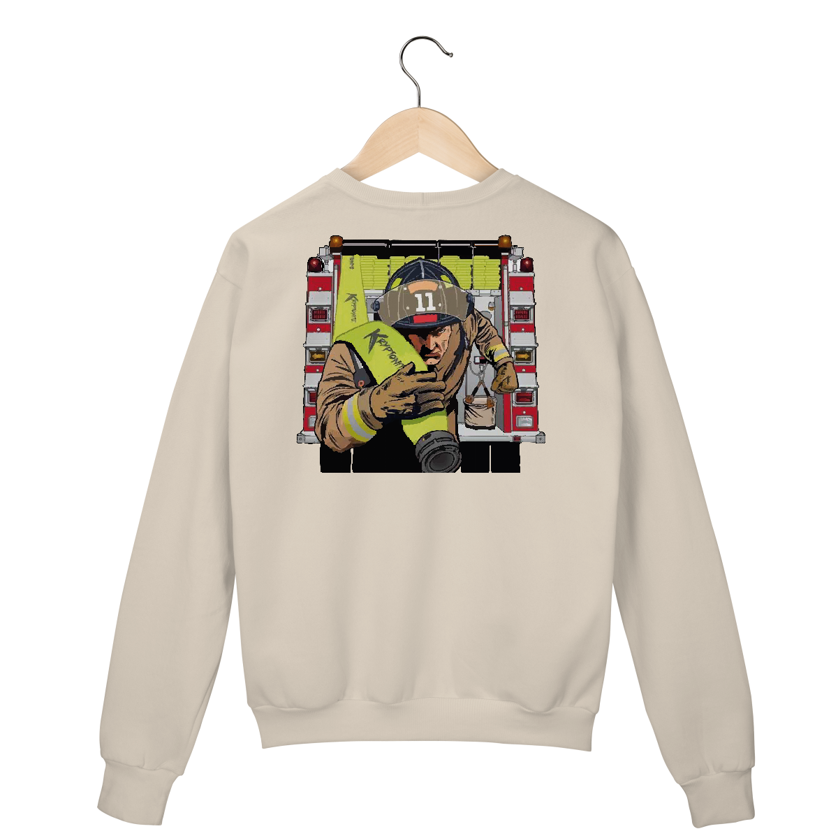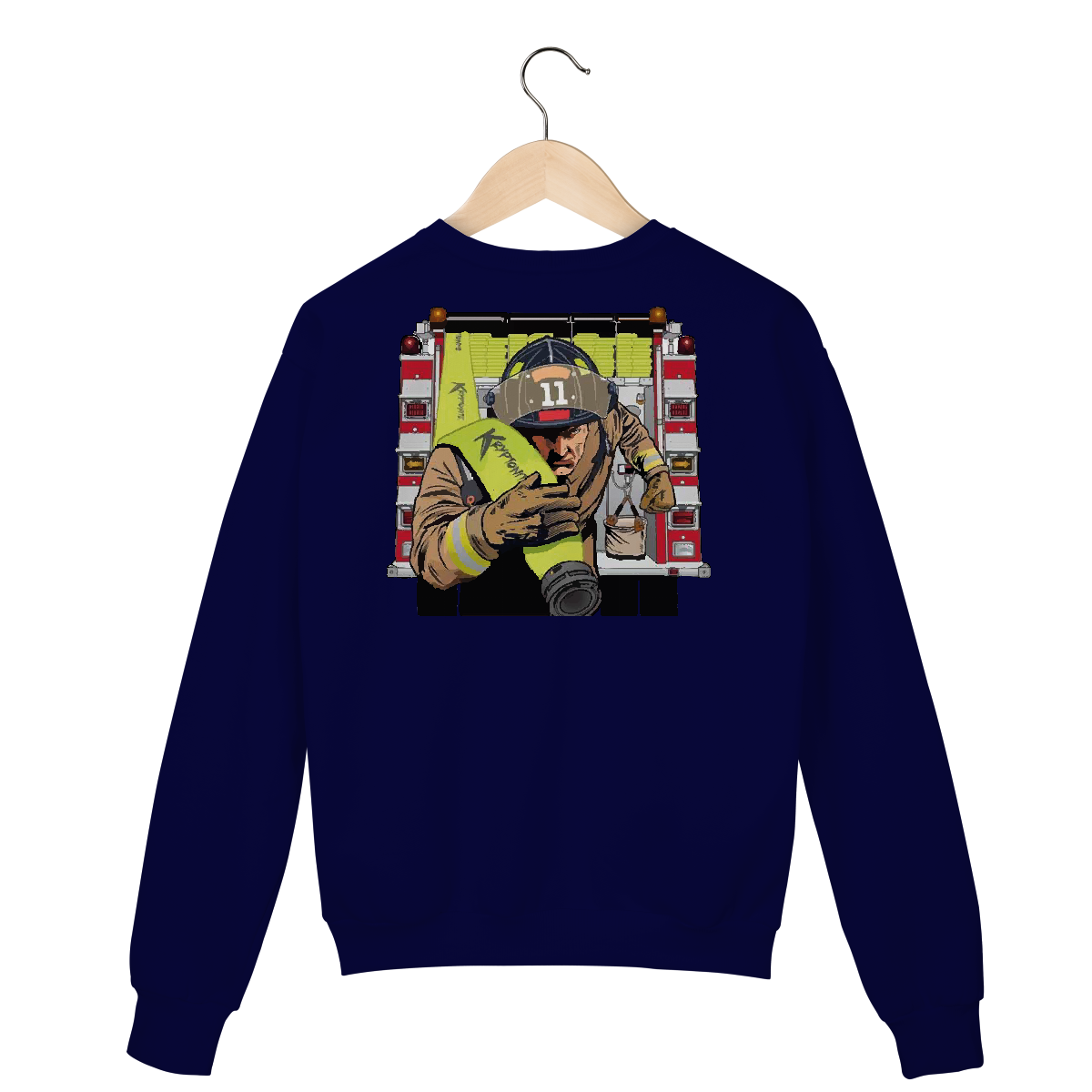 Bombeiro correndo com mangueira Kryptonite em punho, fundo de viatura. Representa velocidade, preparo e missão.