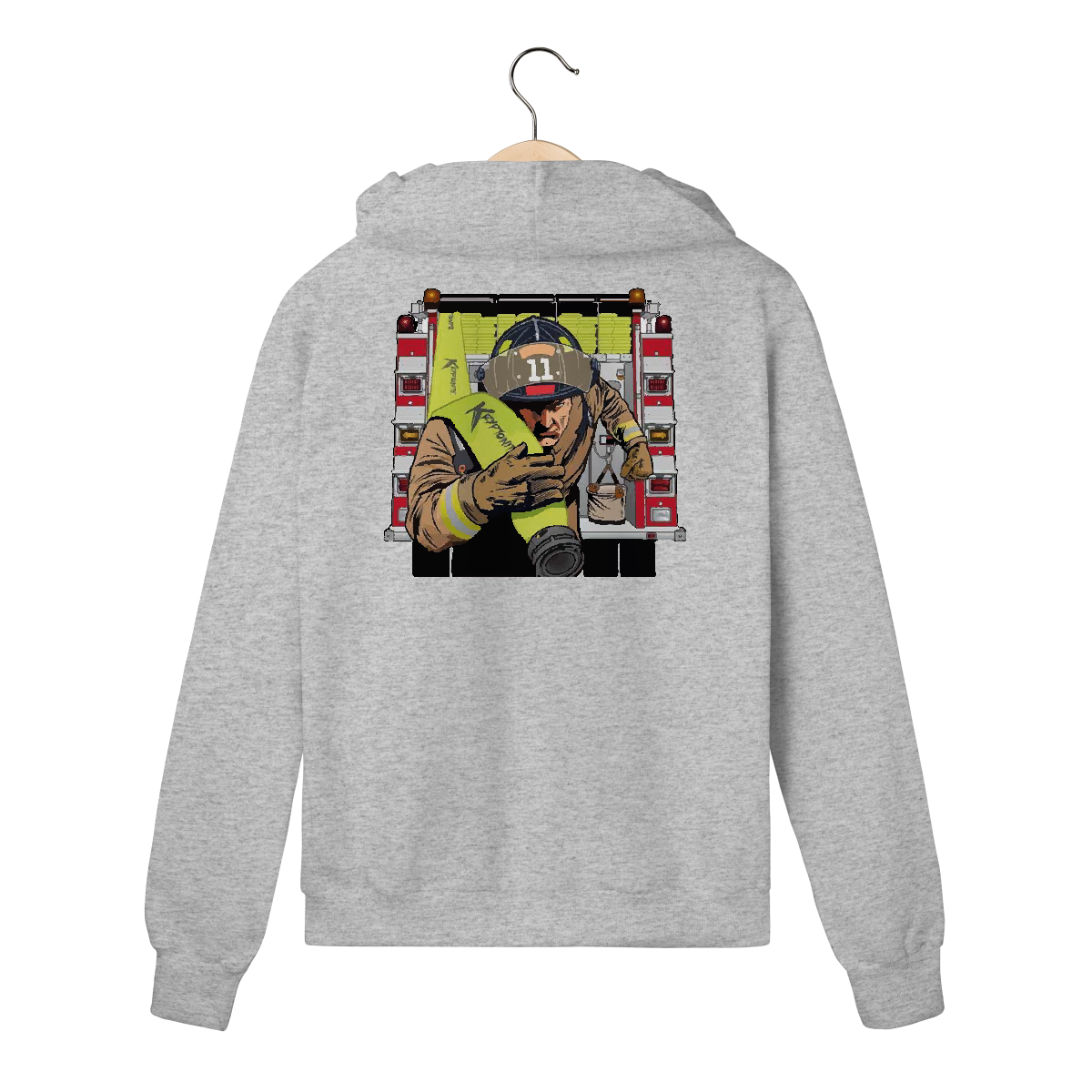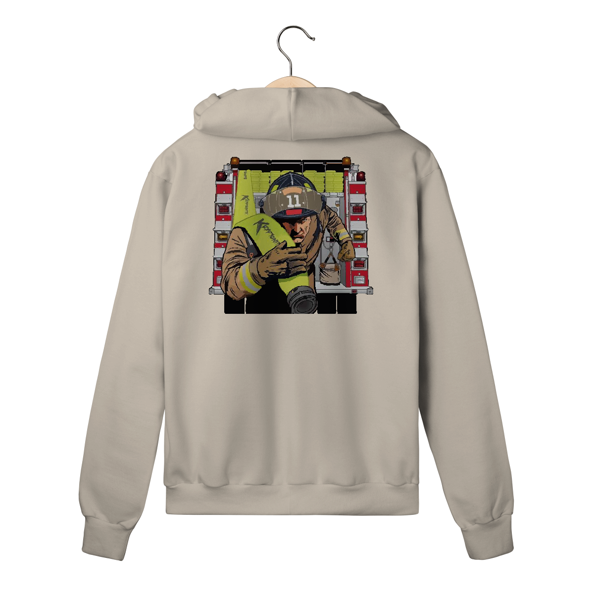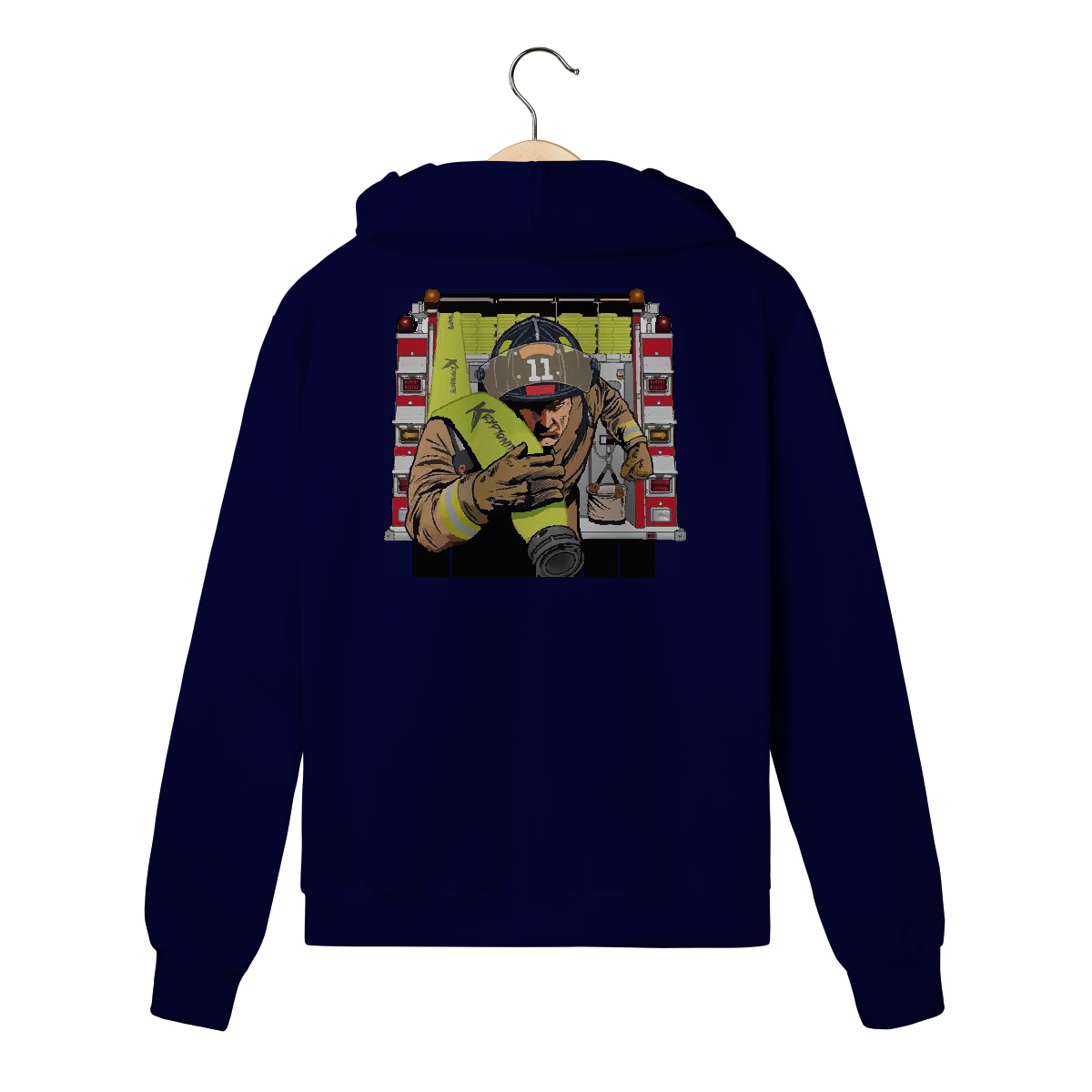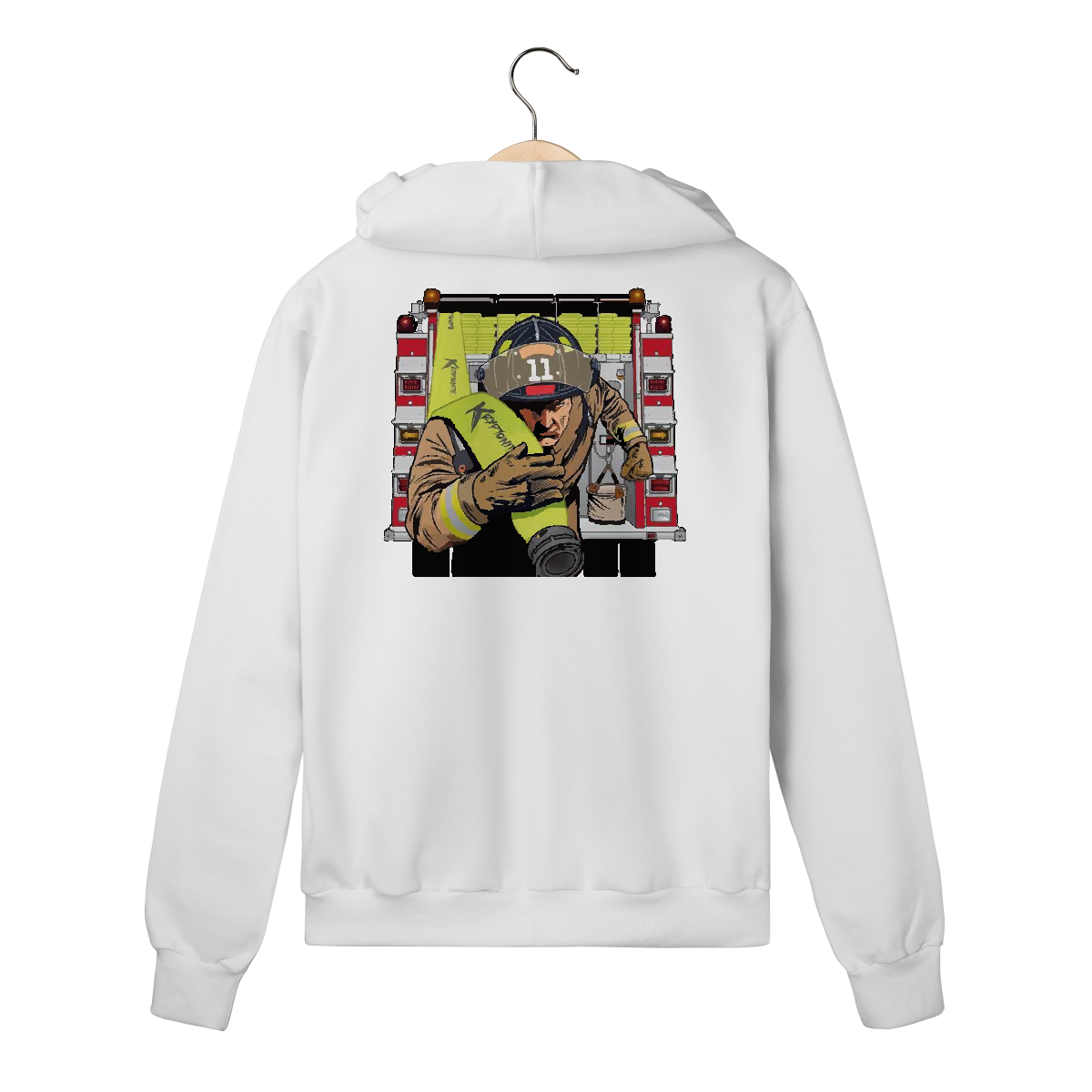 Bombeiro correndo com mangueira Kryptonite em punho, fundo de viatura. Representa velocidade, preparo e missão.