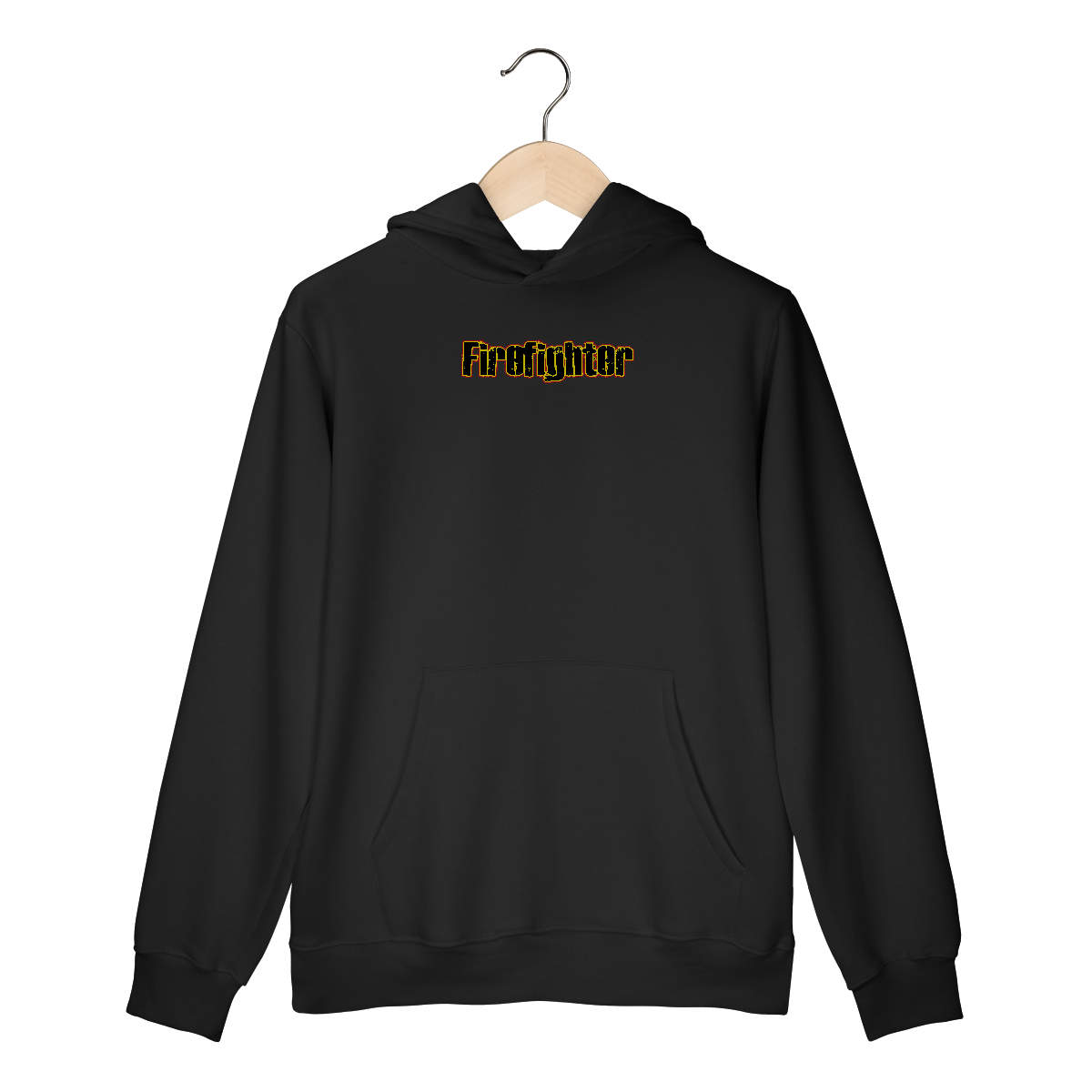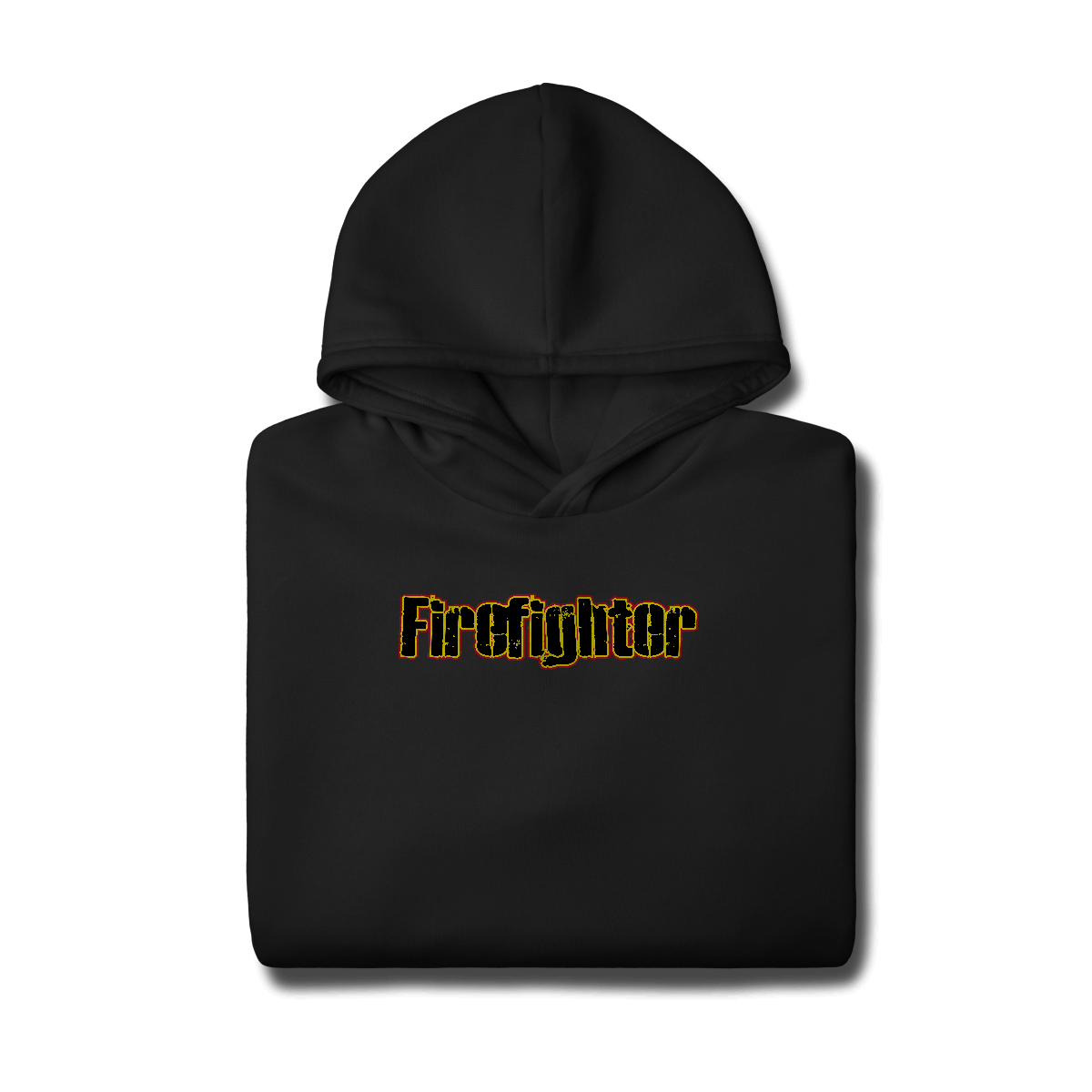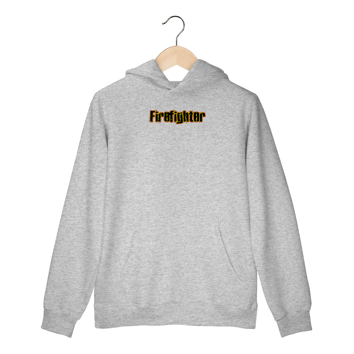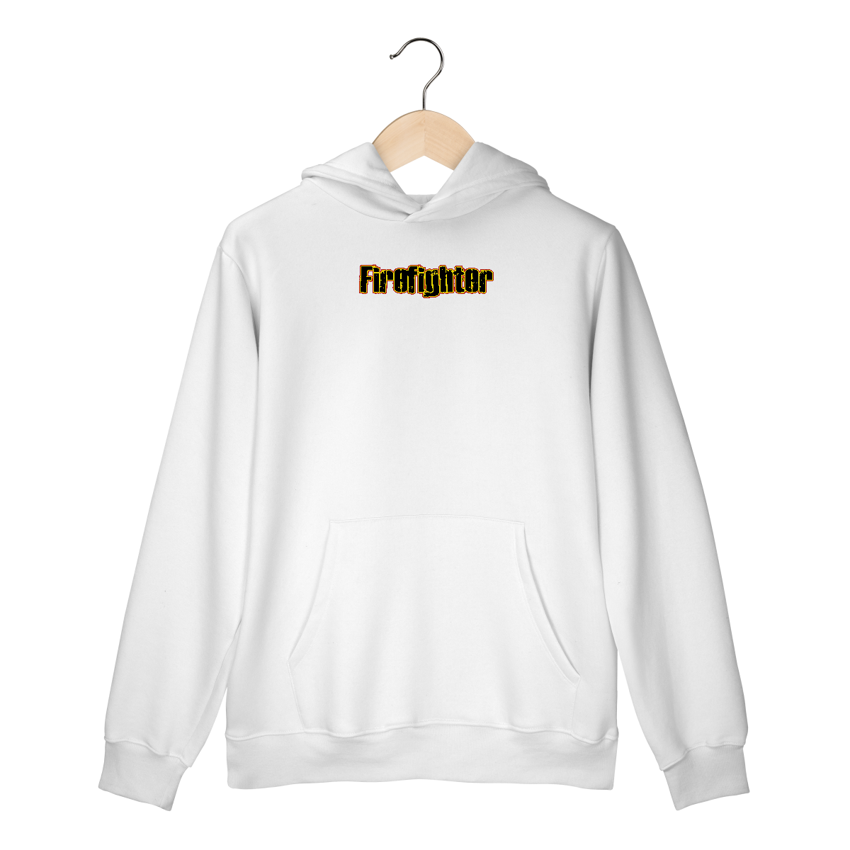 Letreiro impactante “Firefighter” com estilo grunge e bordas em fogo. Para quem vive intensamente a profissão.