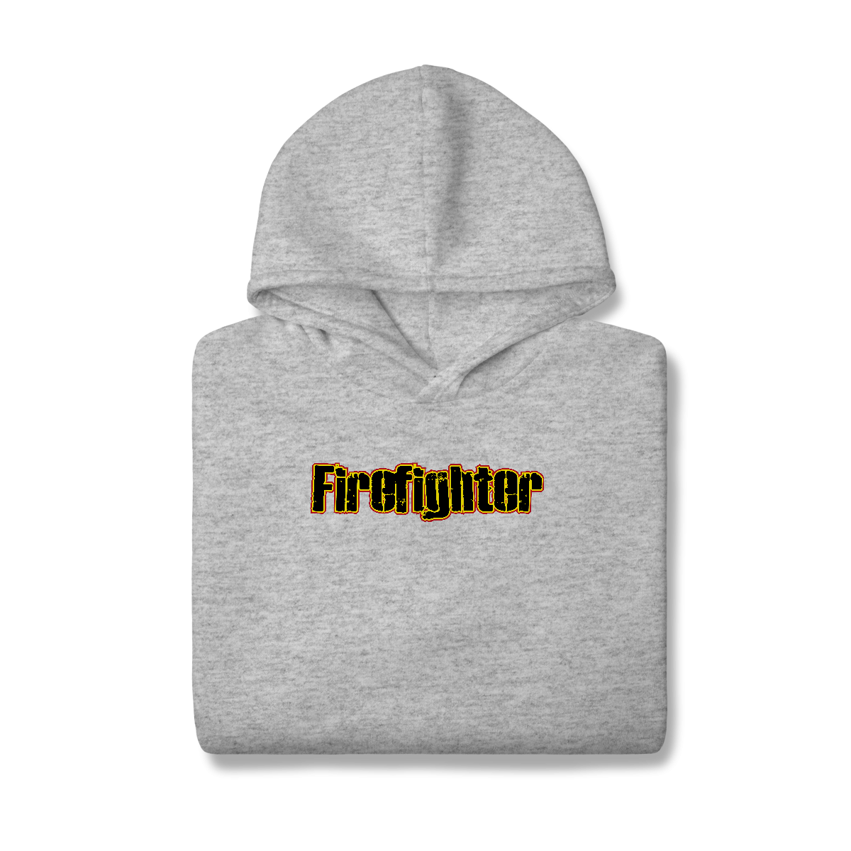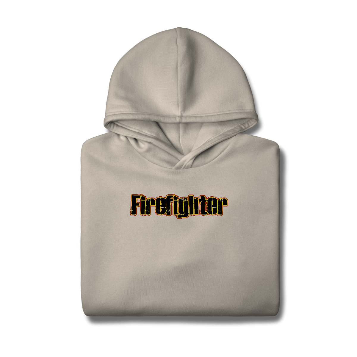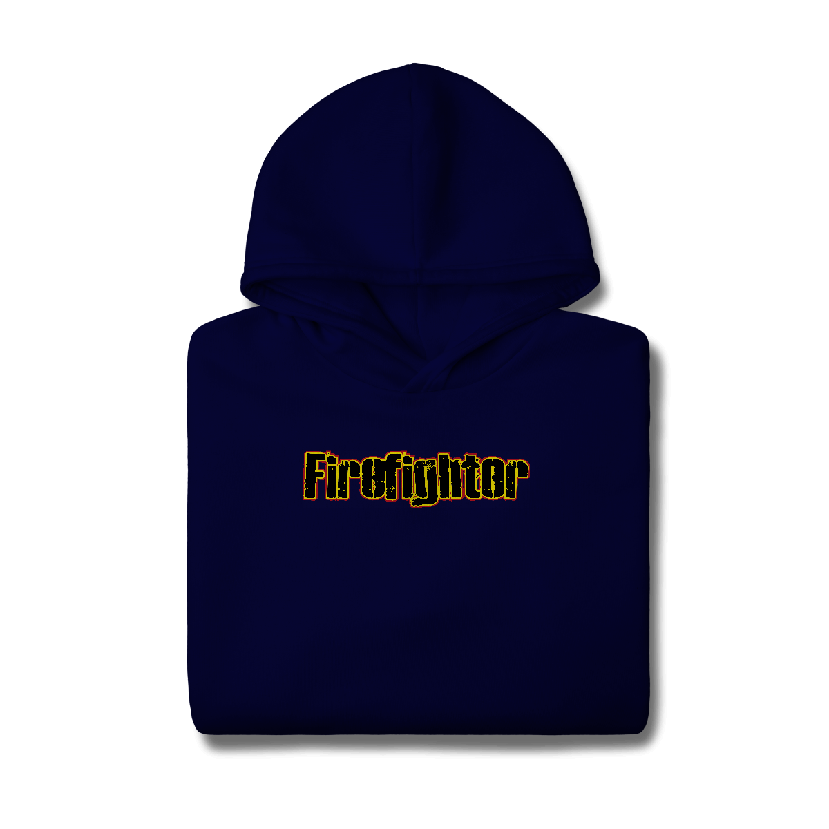 Letreiro impactante “Firefighter” com estilo grunge e bordas em fogo. Para quem vive intensamente a profissão.