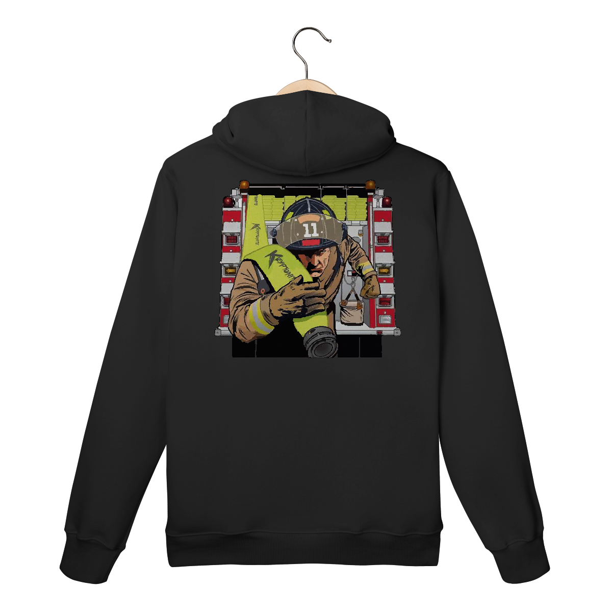 Bombeiro correndo com mangueira Kryptonite em punho, fundo de viatura. Representa velocidade, preparo e missão.