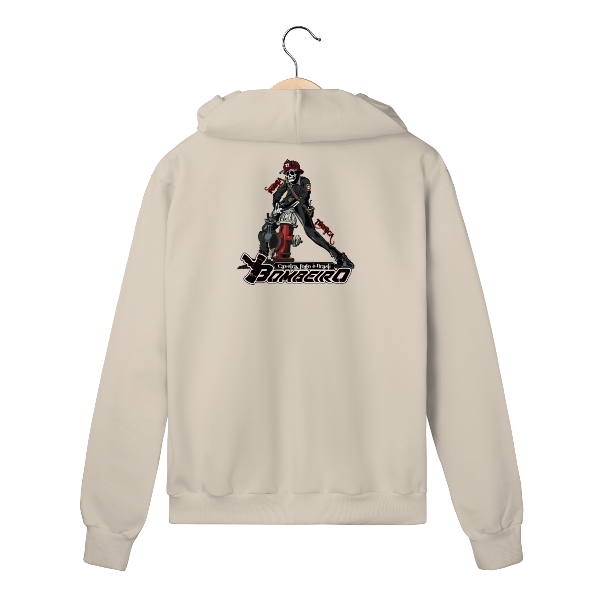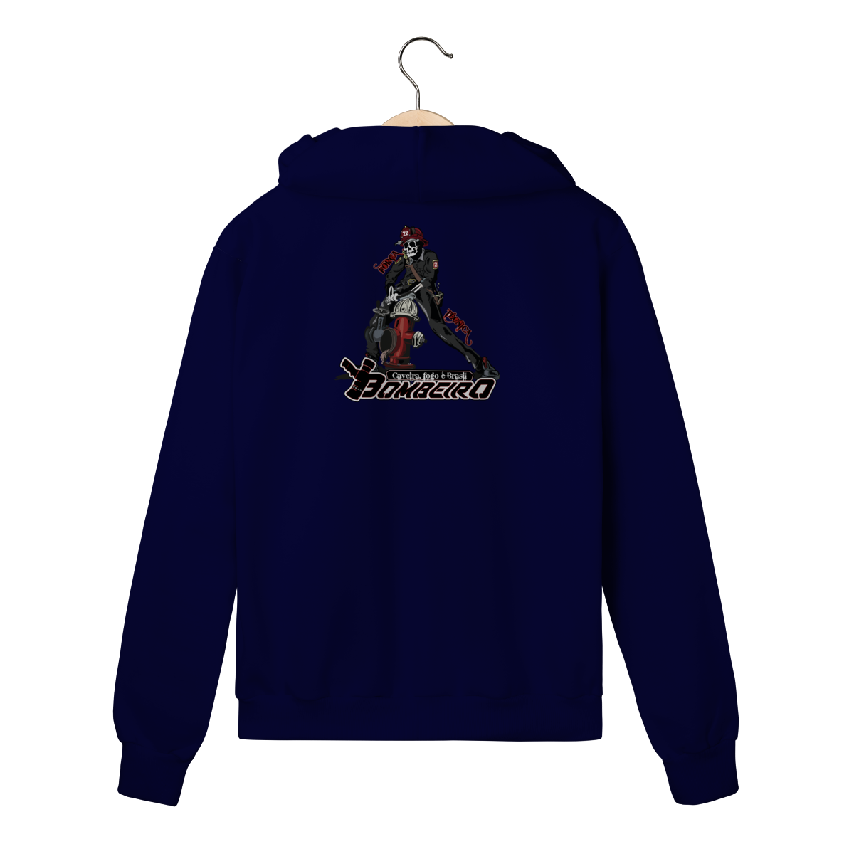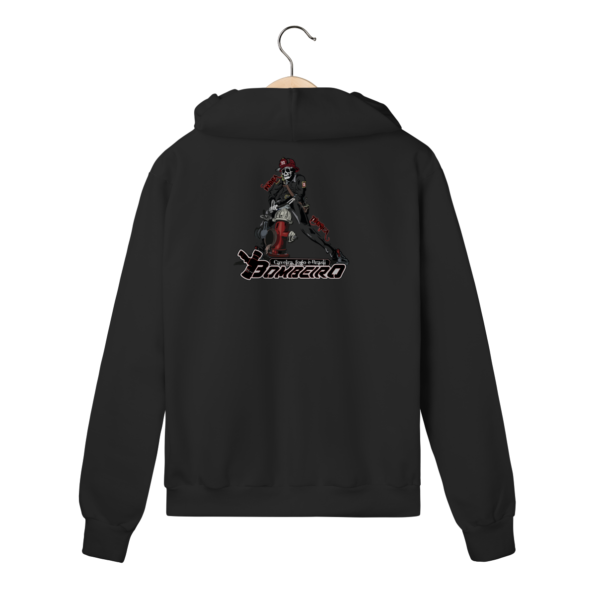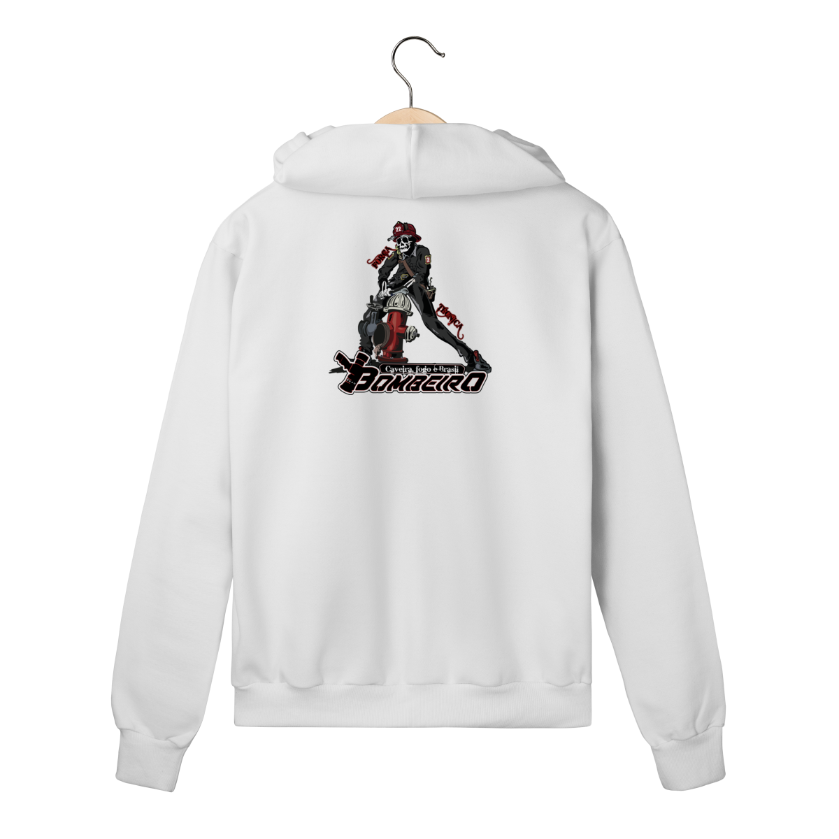 Na base, o lettering “Bombeiro – Caveira, Fogo e Brasil” completa o visual com identidade nacional, criando uma peça ideal para quem vive a profissão, honra a história e carrega o espírito de rua da tropa.