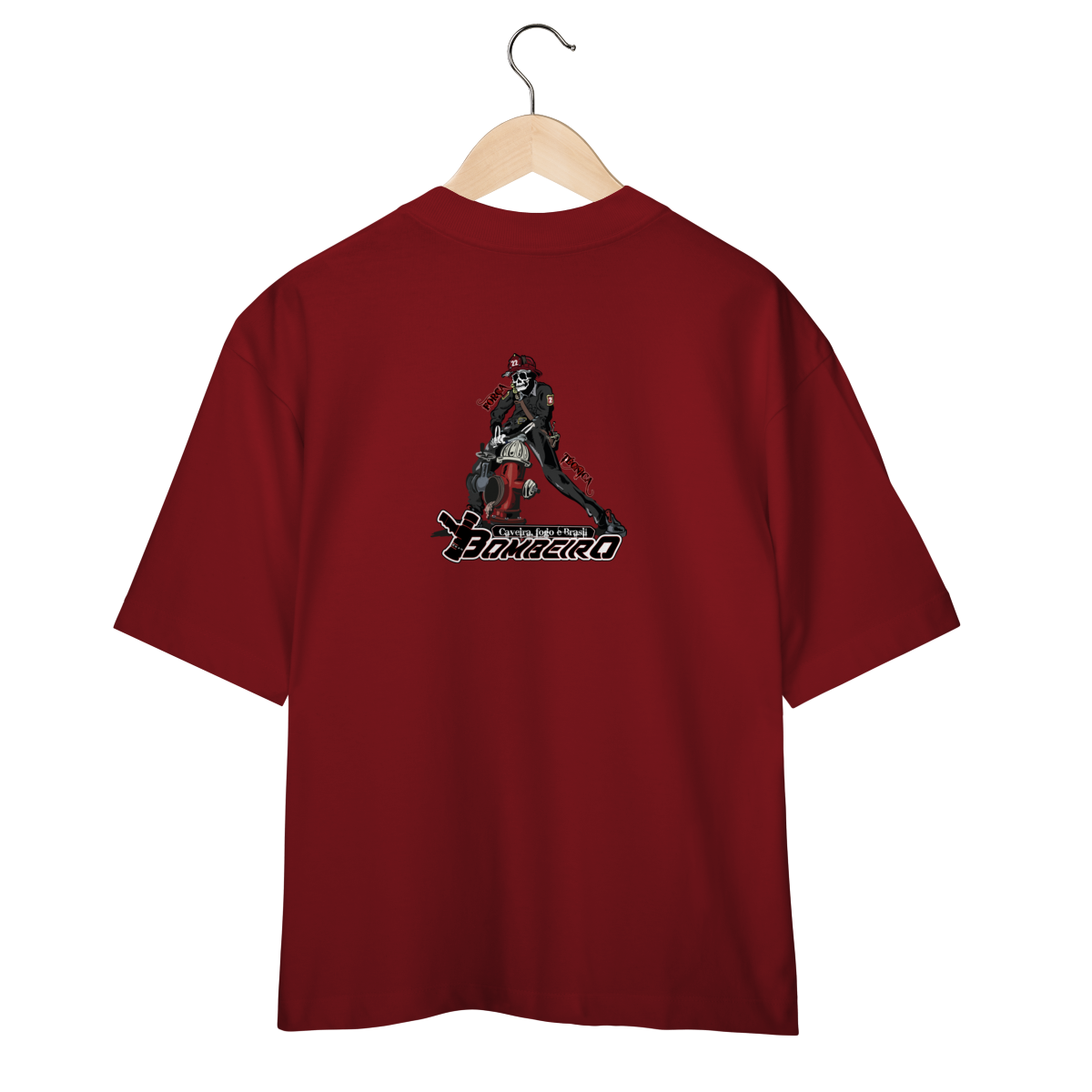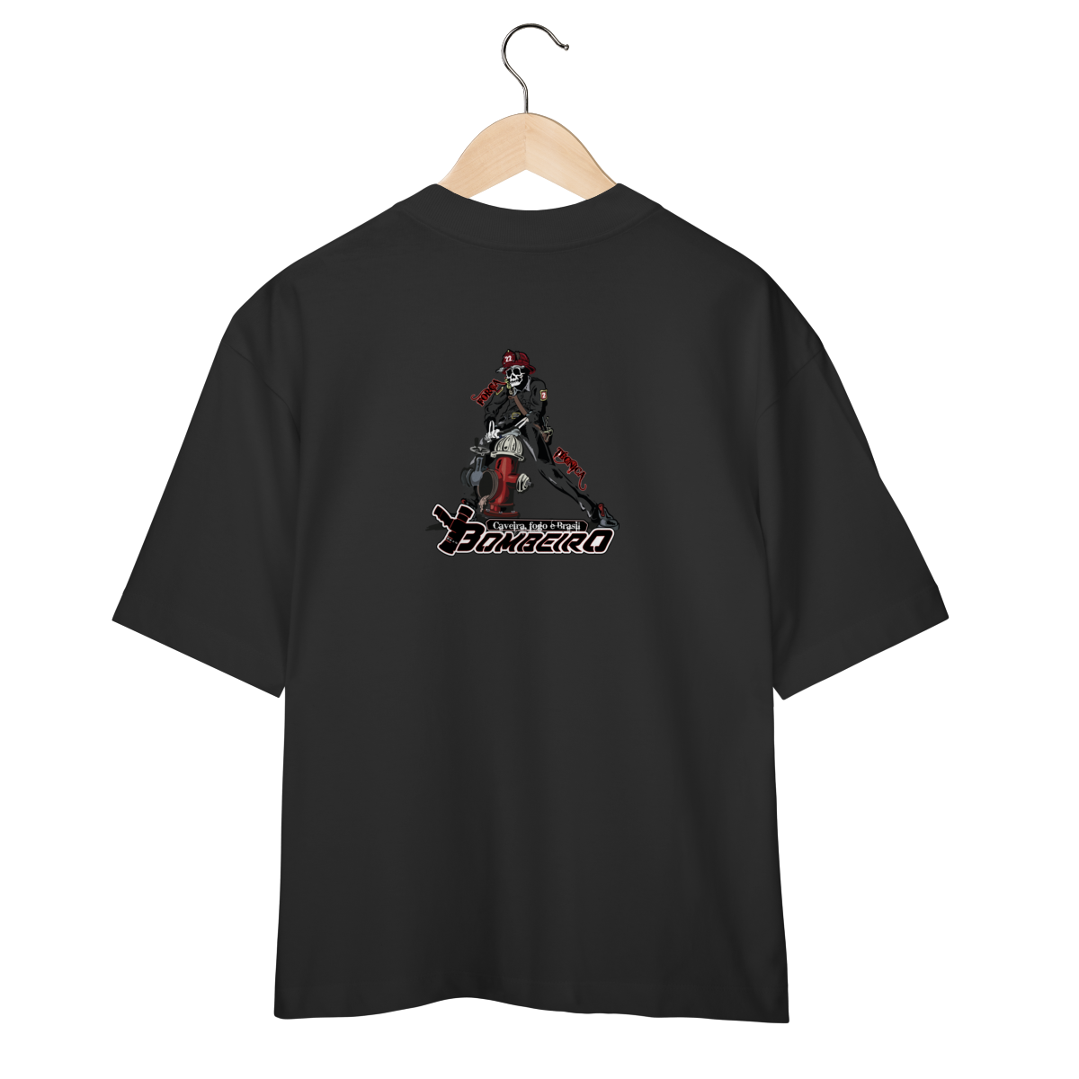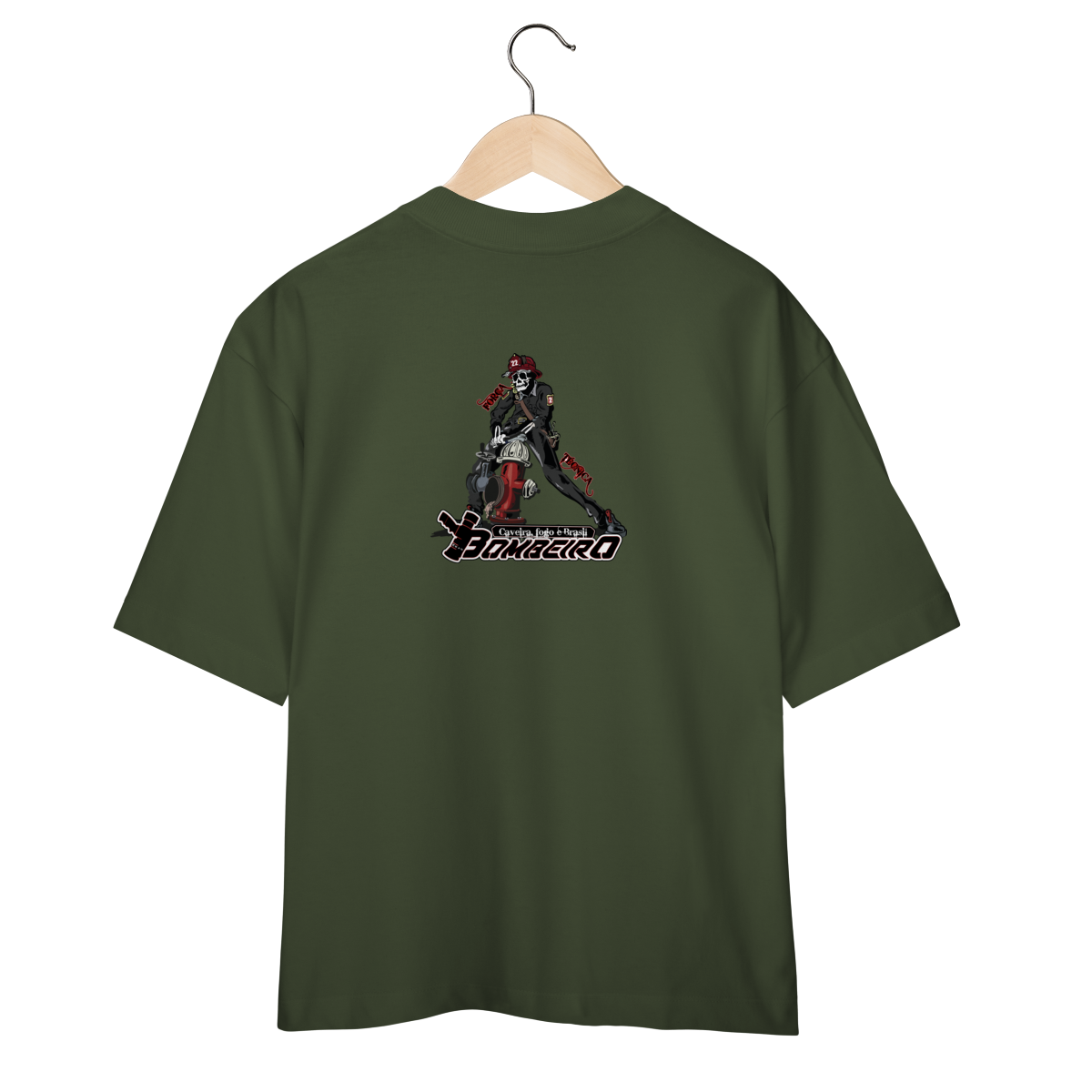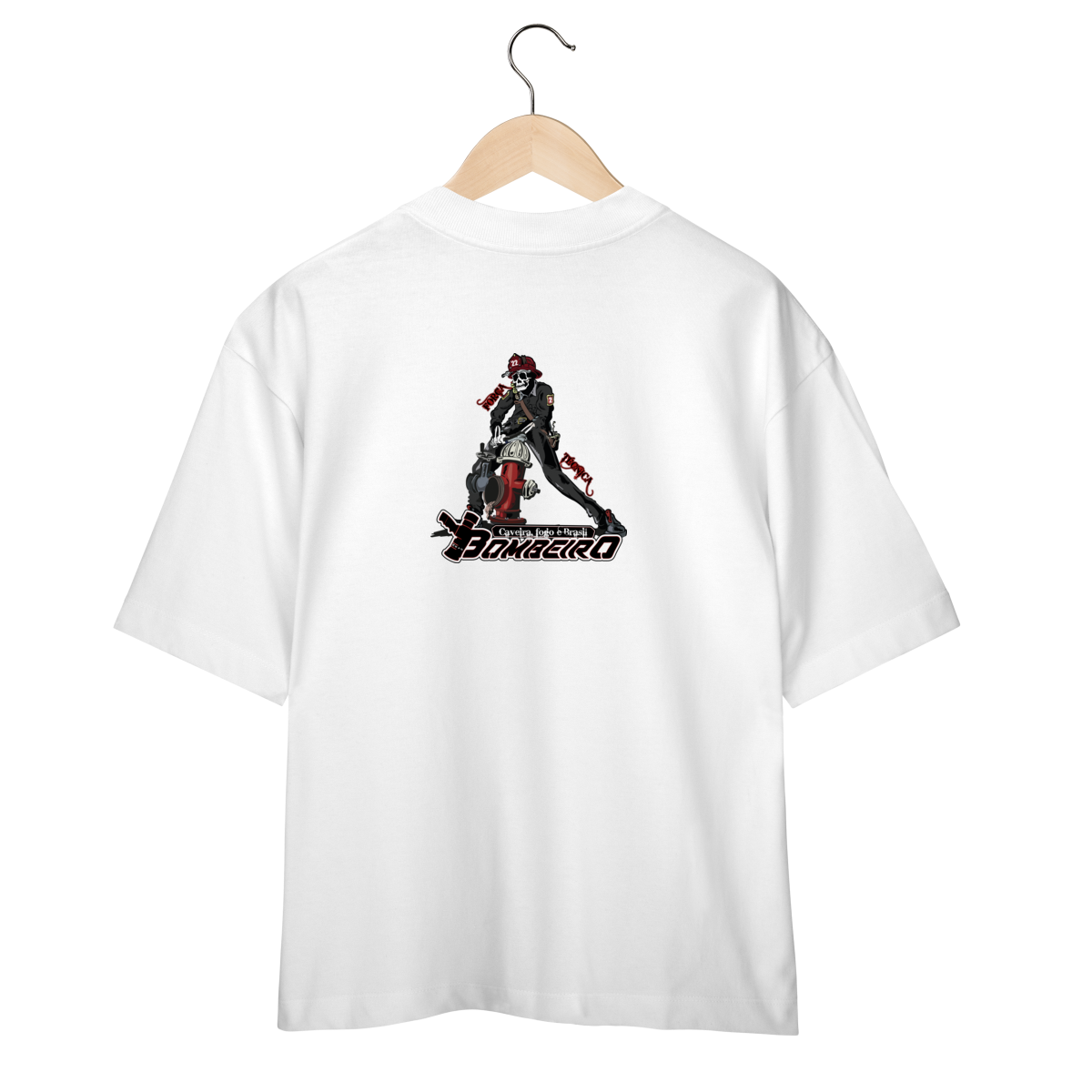 Na base, o lettering “Bombeiro – Caveira, Fogo e Brasil” completa o visual com identidade nacional, criando uma peça ideal para quem vive a profissão, honra a história e carrega o espírito de rua da tropa.