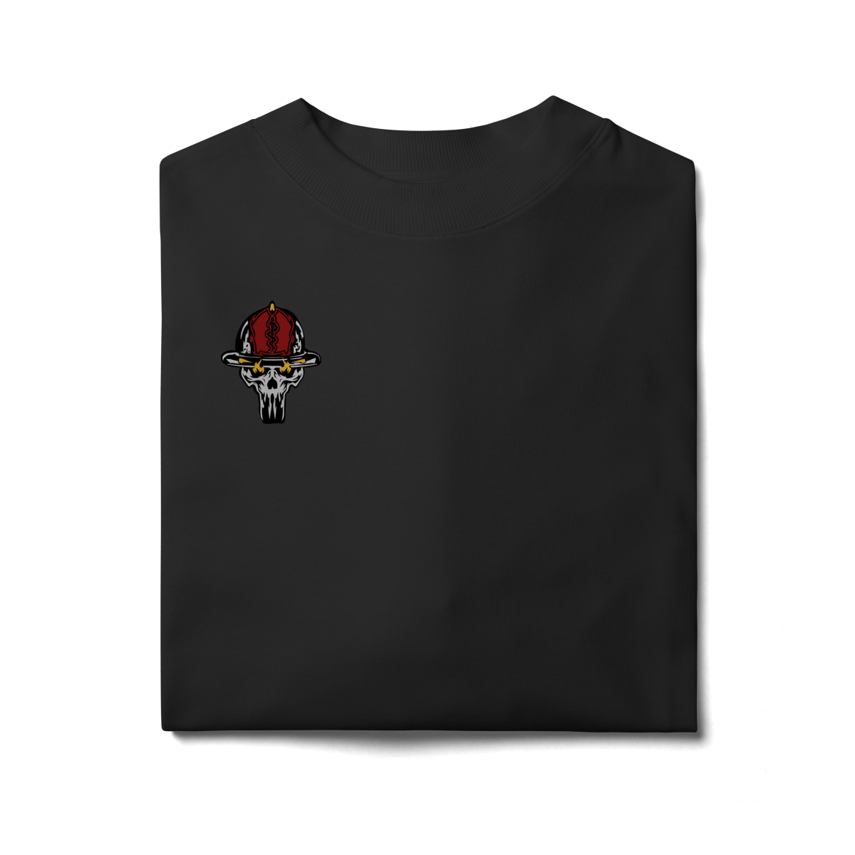 A estampa traz uma caveira operacional vestindo o tradicional uniforme preto e o capacete 22, acionando um hidrante com intensidade e postura de combate. Os detalhes em vermelho reforçam a energia do fogo, enquanto os traços marcantes destacam o clima tenso e heroico que define o serviço.