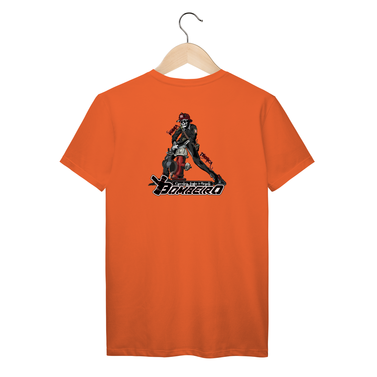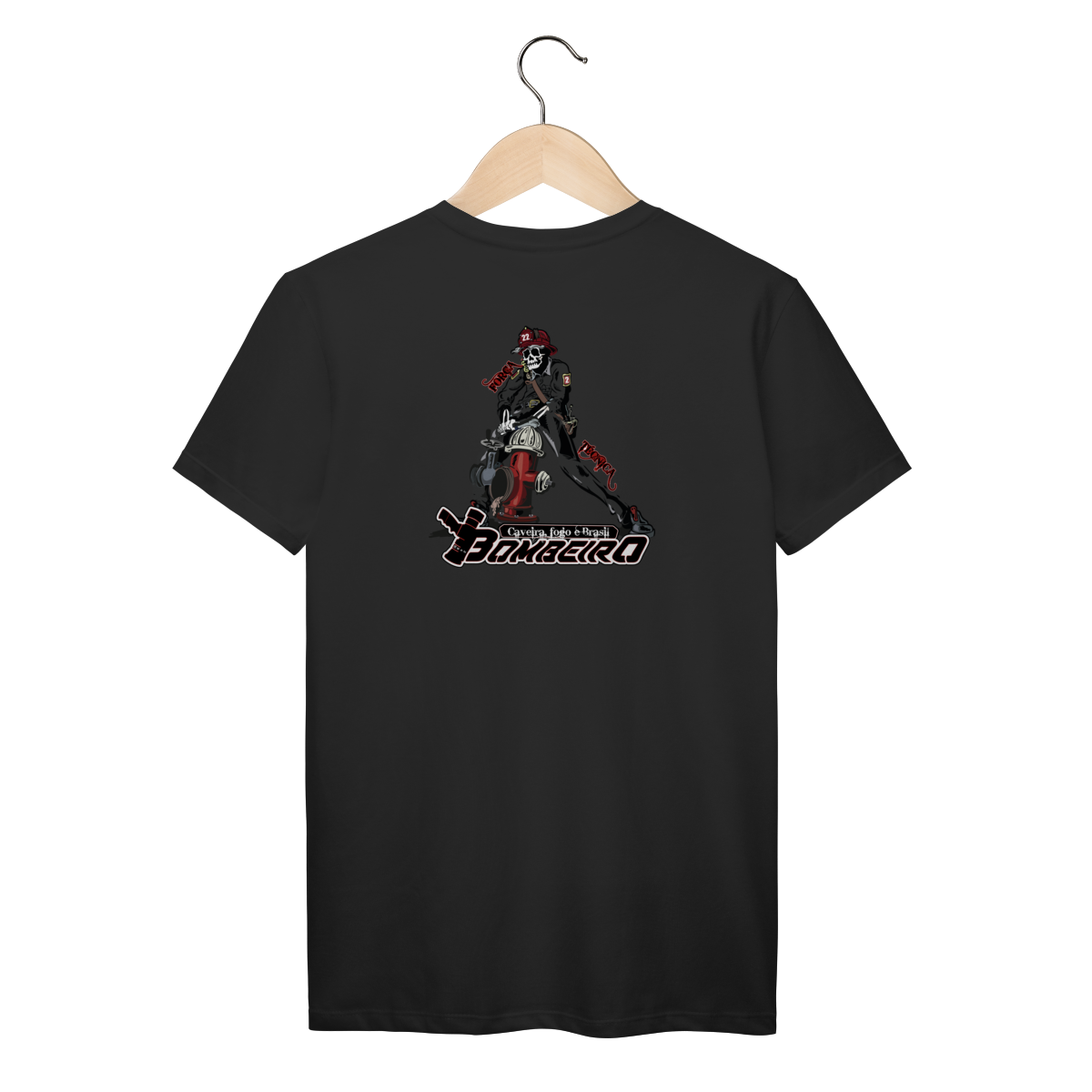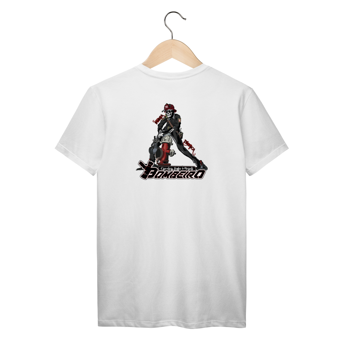 Na base, o lettering “Bombeiro – Caveira, Fogo e Brasil” completa o visual com identidade nacional, criando uma peça ideal para quem vive a profissão, honra a história e carrega o espírito de rua da tropa.