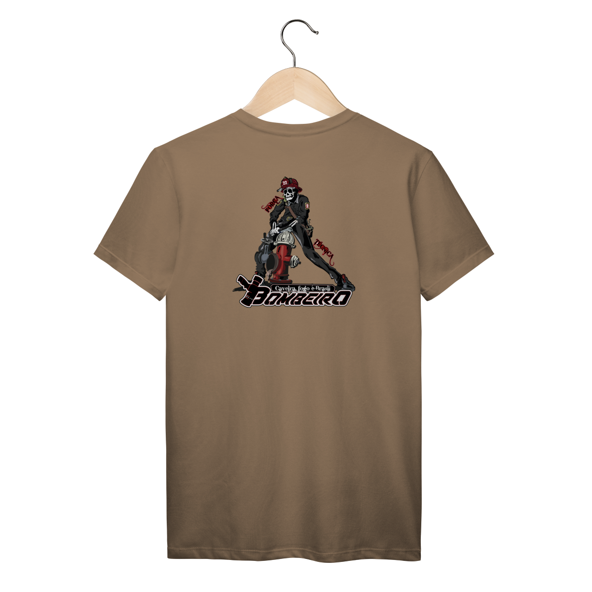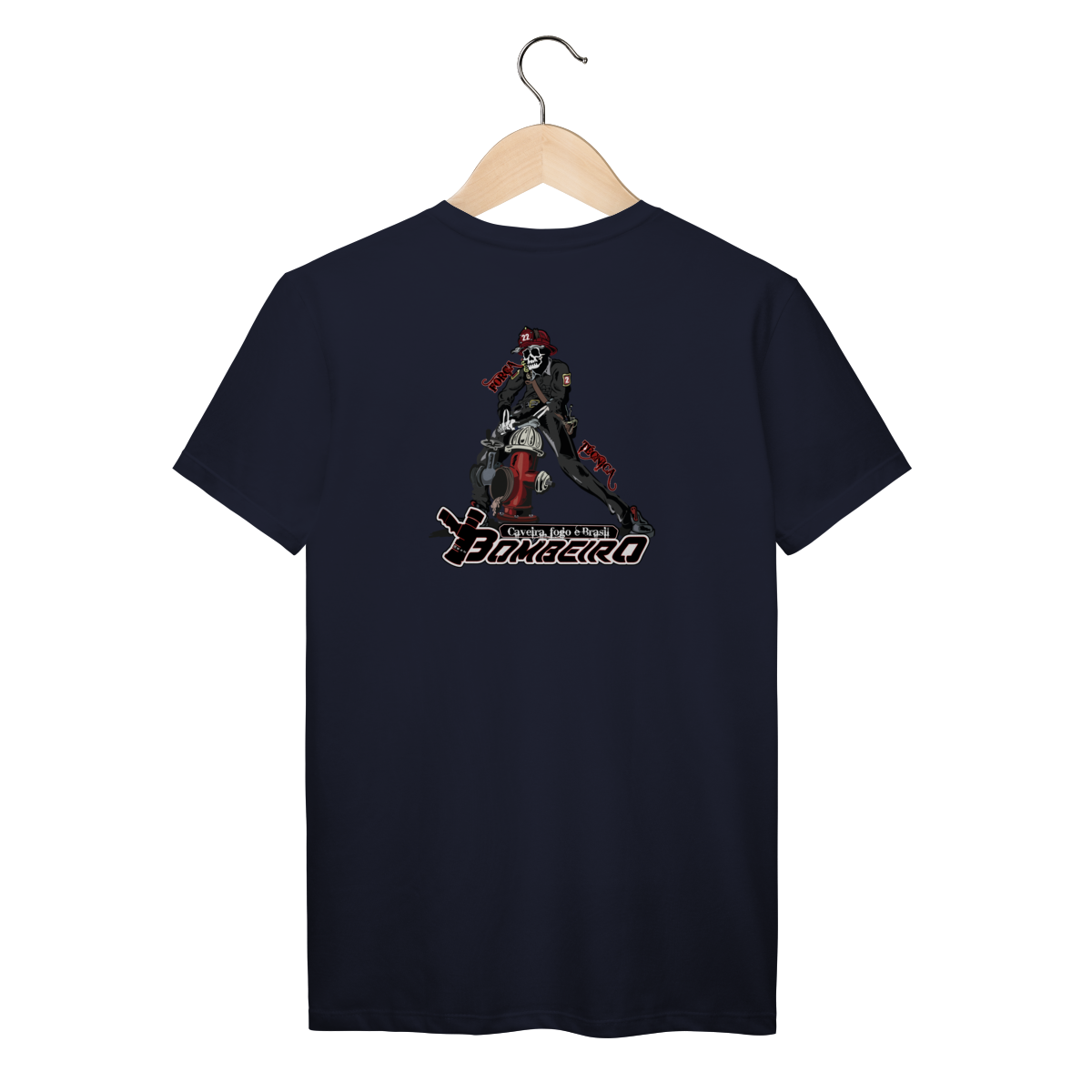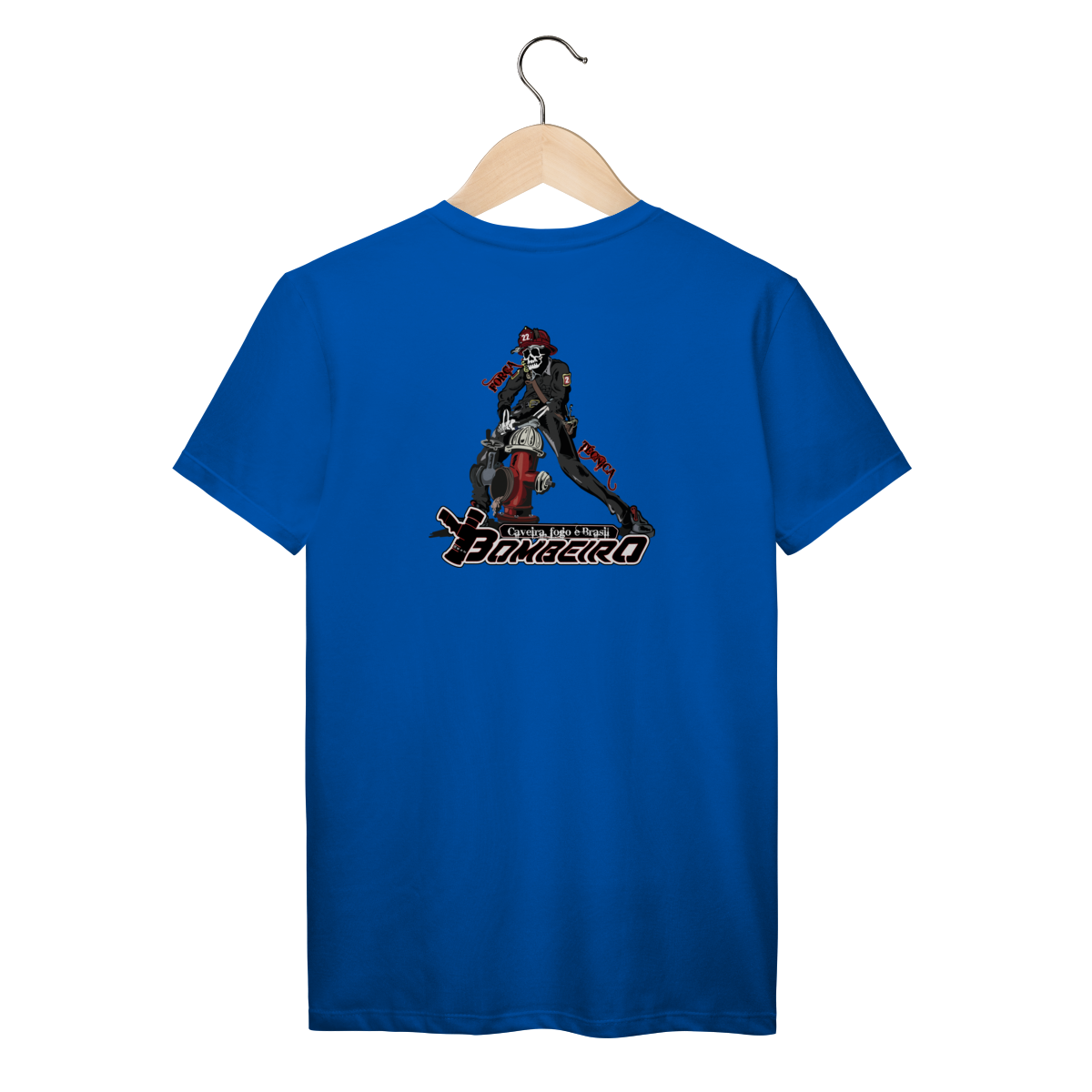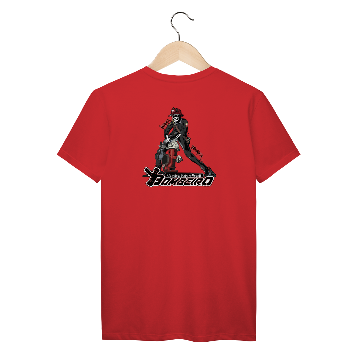 Na base, o lettering “Bombeiro – Caveira, Fogo e Brasil” completa o visual com identidade nacional, criando uma peça ideal para quem vive a profissão, honra a história e carrega o espírito de rua da tropa.