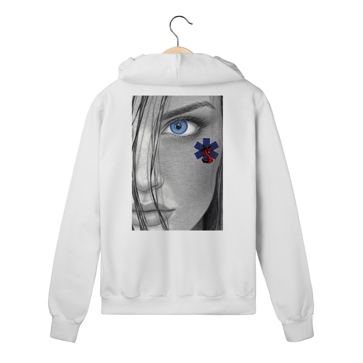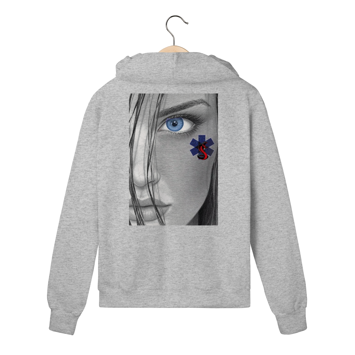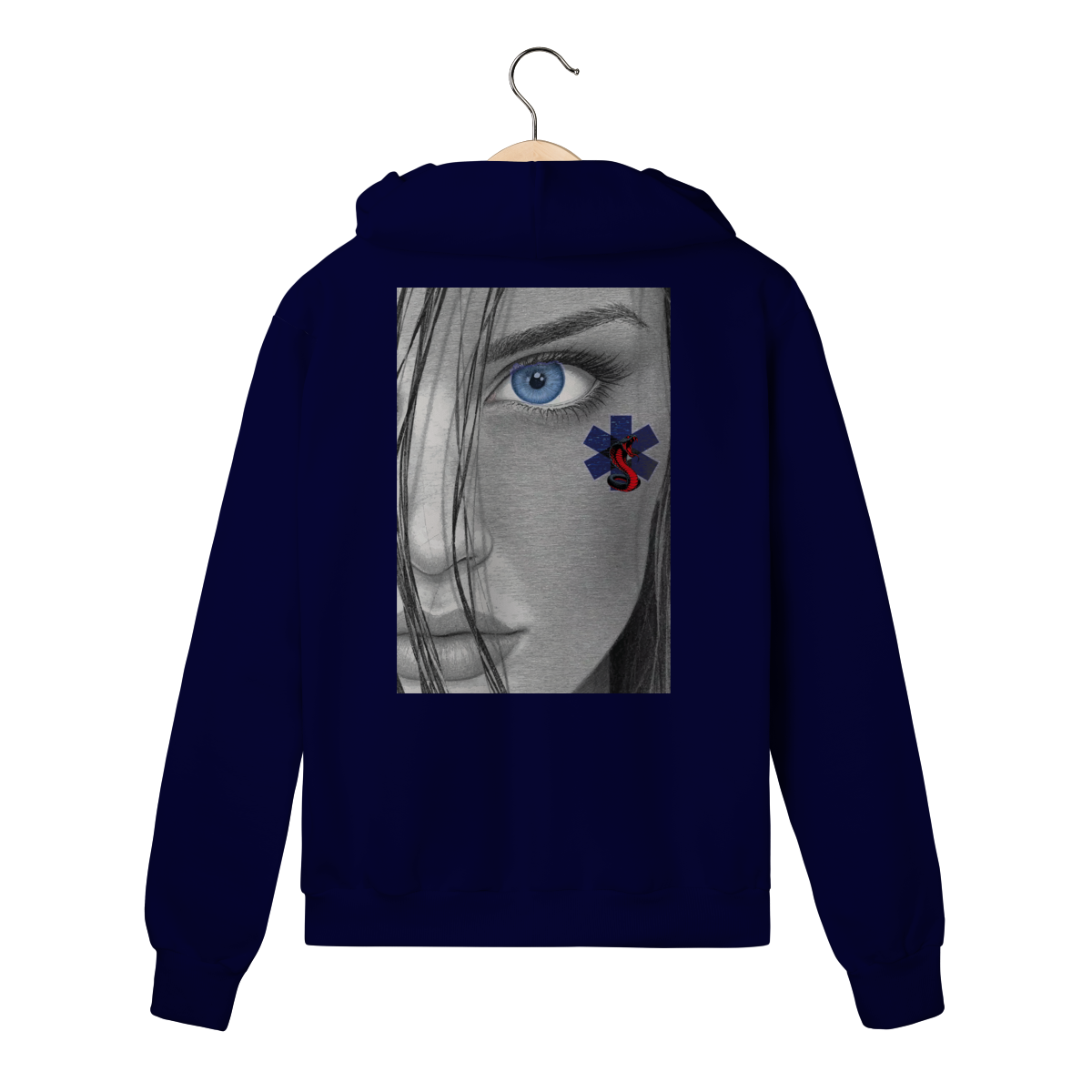 Uma arte impactante que une beleza e força. O olhar azul intenso transmite foco e determinação, simbolizando o sangue-frio e a precisão de quem atua nas emergências. O símbolo da estrela da vida com a serpente vermelha acrescenta identidade e respeito ao universo do APH (Atendimento Pré-Hospitalar), marcando a imagem com um toque de coragem e profissionalismo.