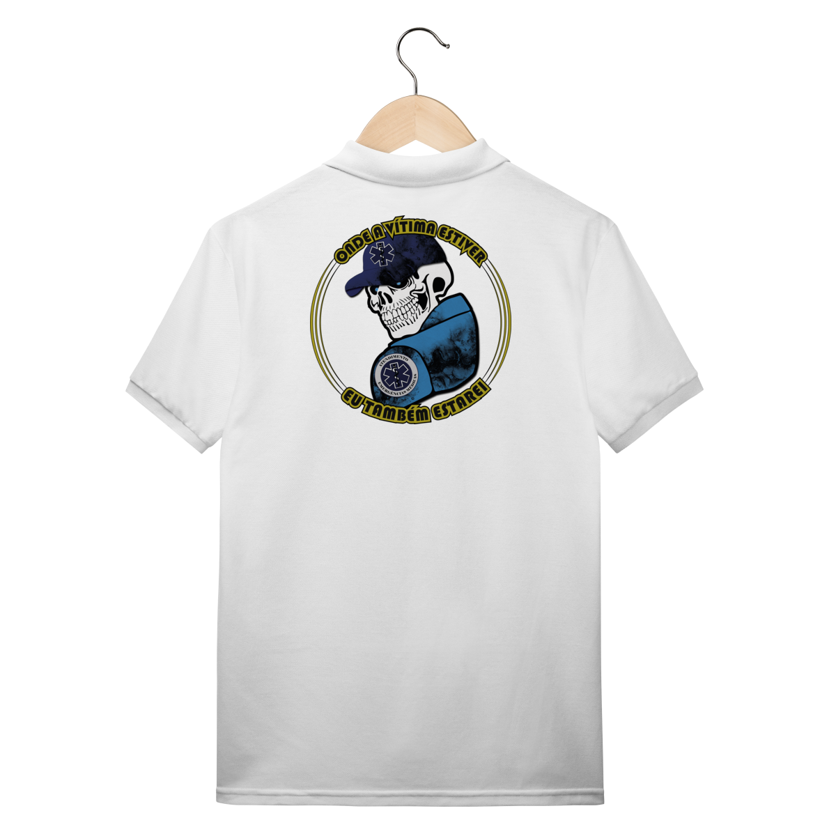 Para quem vive o resgate de verdade. Essa arte traz uma caveira estilizada com boné azul e o símbolo da Estrela da Vida, representando coragem e dedicação dos profissionais de Atendimento Pré-Hospitalar (APH). A frase “Onde a vítima estiver, eu também estarei” expressa o compromisso e a bravura de quem enfrenta qualquer cenário para salvar vidas.