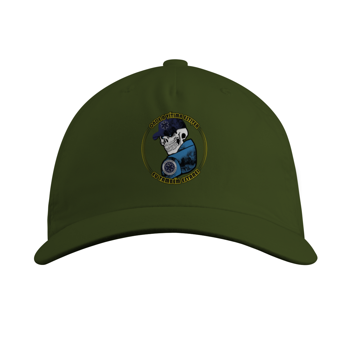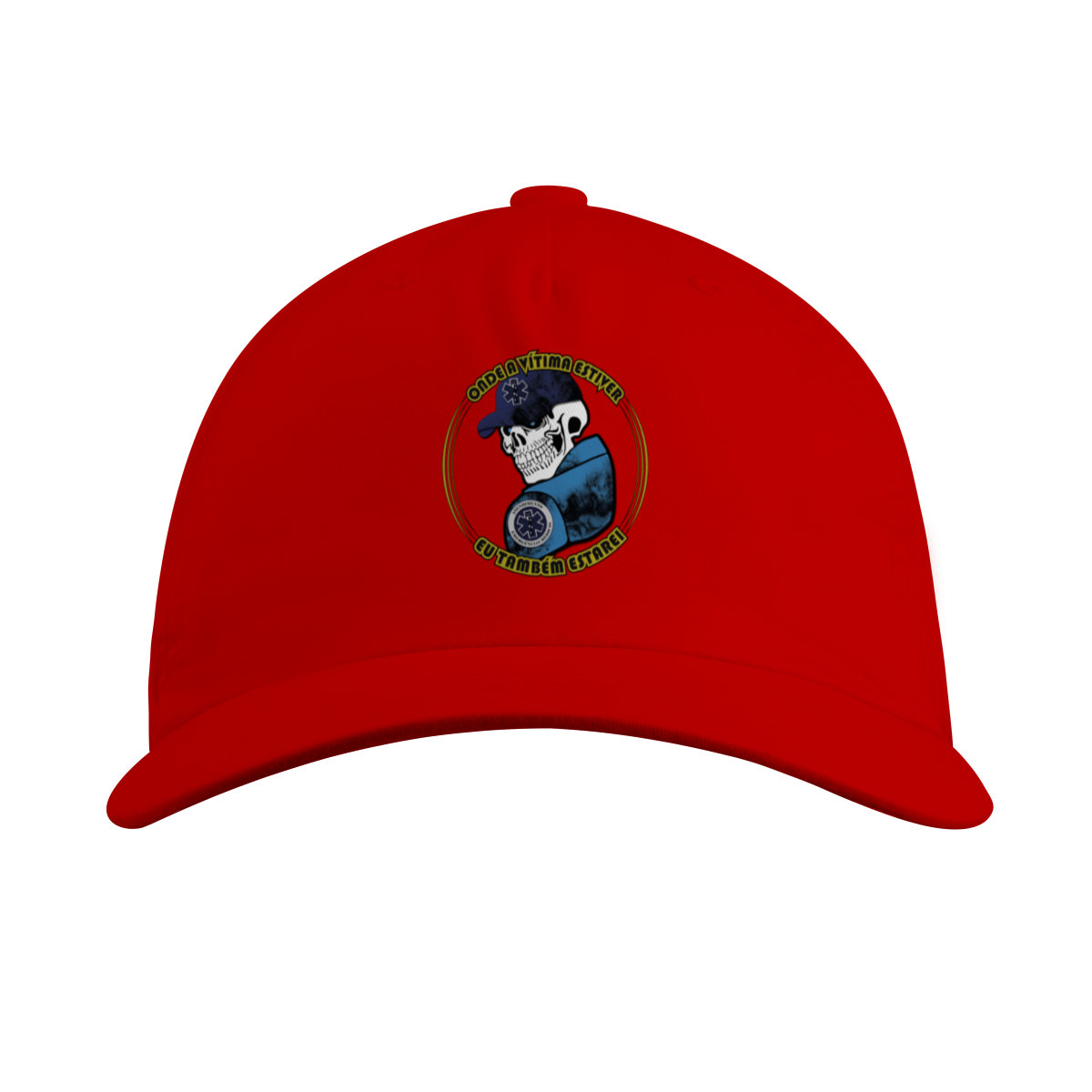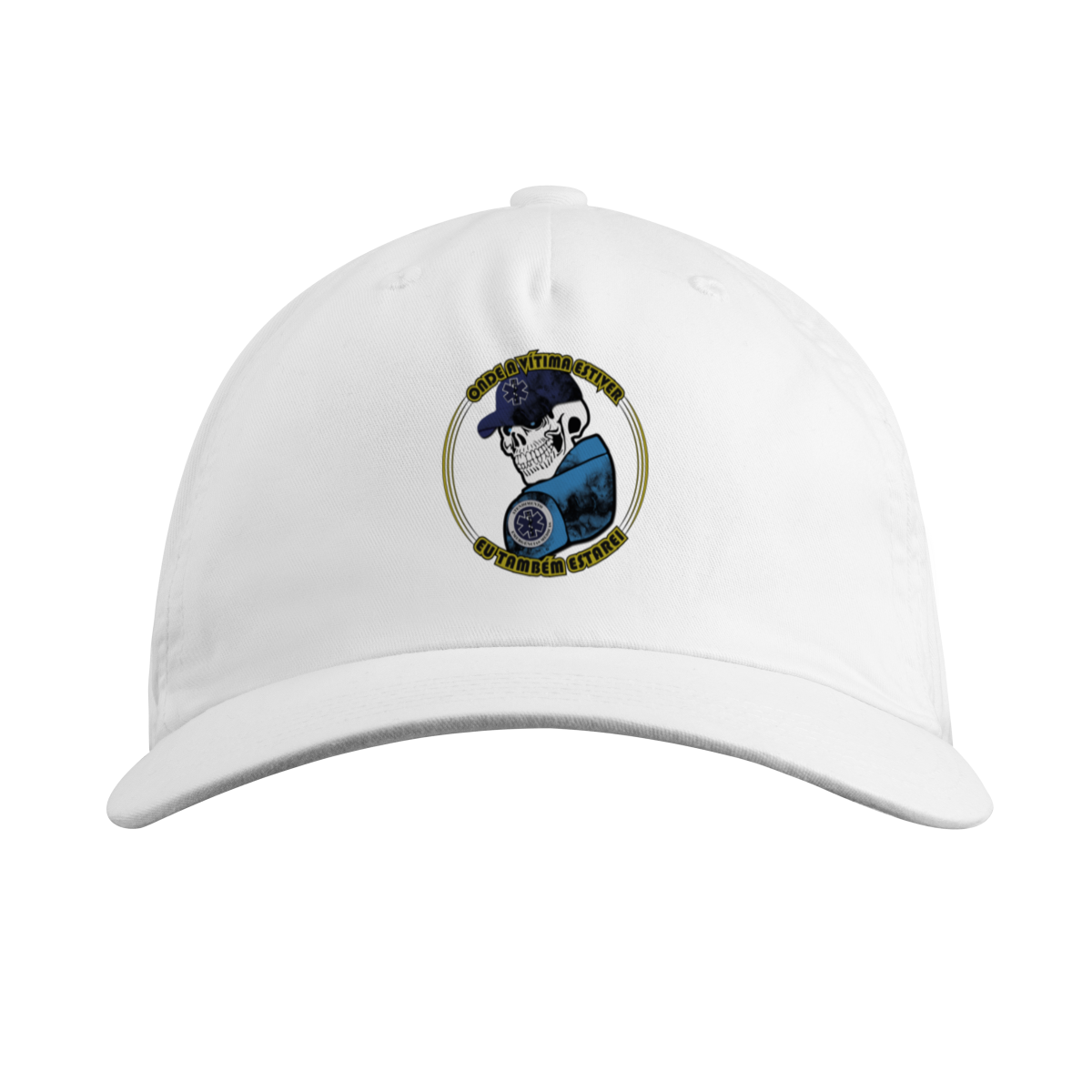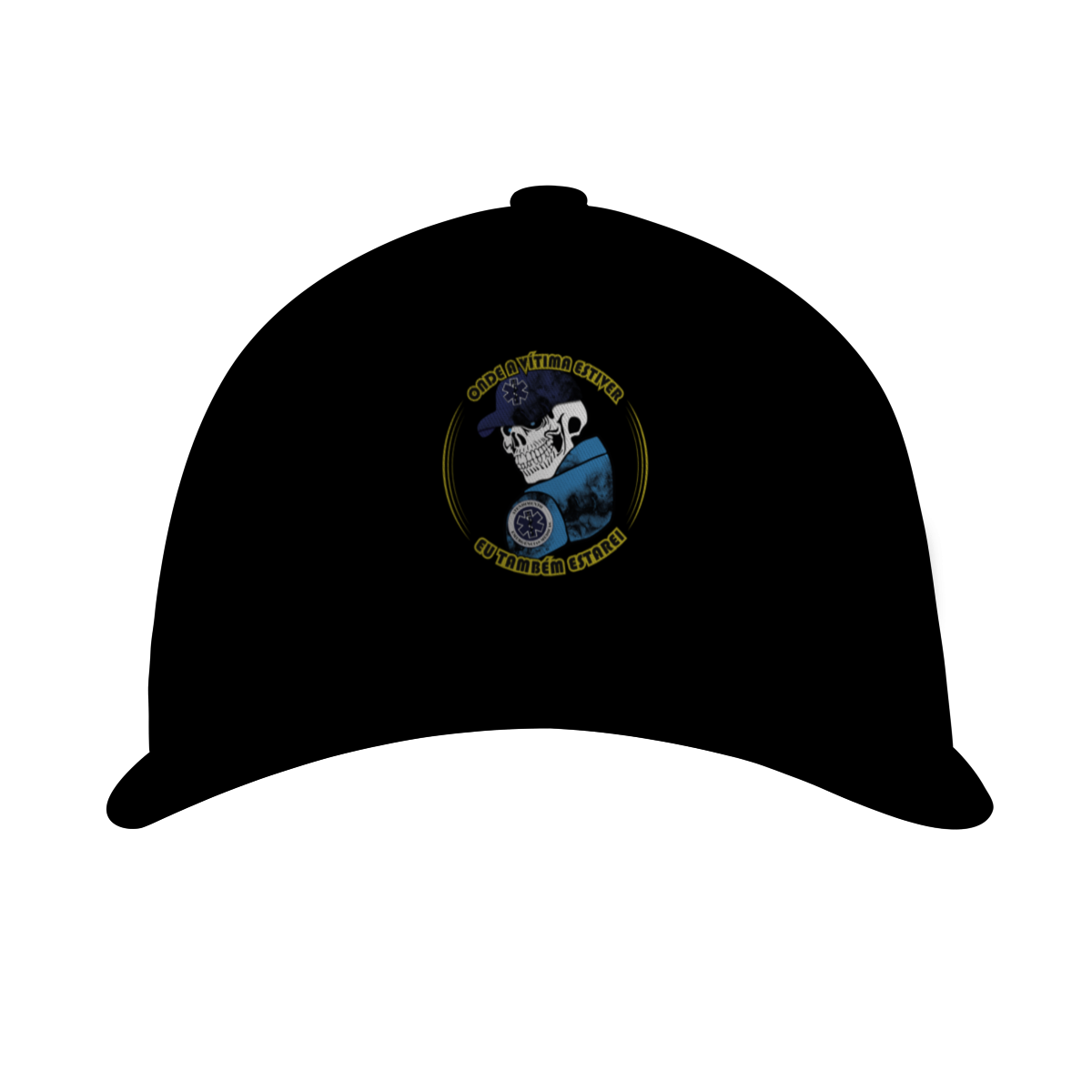 Para quem vive o resgate de verdade. Essa arte traz uma caveira estilizada com boné azul e o símbolo da Estrela da Vida, representando coragem e dedicação dos profissionais de Atendimento Pré-Hospitalar (APH). A frase “Onde a vítima estiver, eu também estarei” expressa o compromisso e a bravura de quem enfrenta qualquer cenário para salvar vidas.