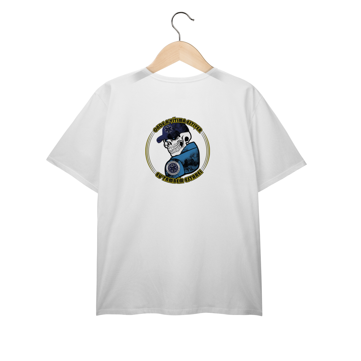 Para quem vive o resgate de verdade. Essa arte traz uma caveira estilizada com boné azul e o símbolo da Estrela da Vida, representando coragem e dedicação dos profissionais de Atendimento Pré-Hospitalar (APH). A frase “Onde a vítima estiver, eu também estarei” expressa o compromisso e a bravura de quem enfrenta qualquer cenário para salvar vidas.