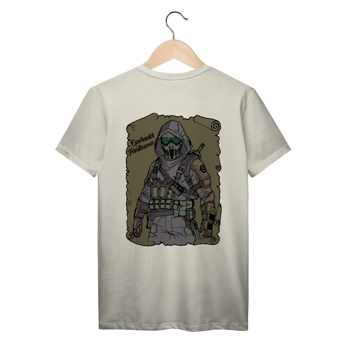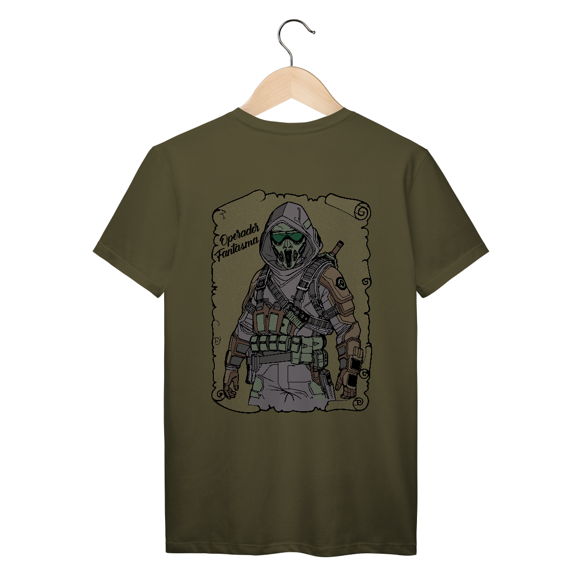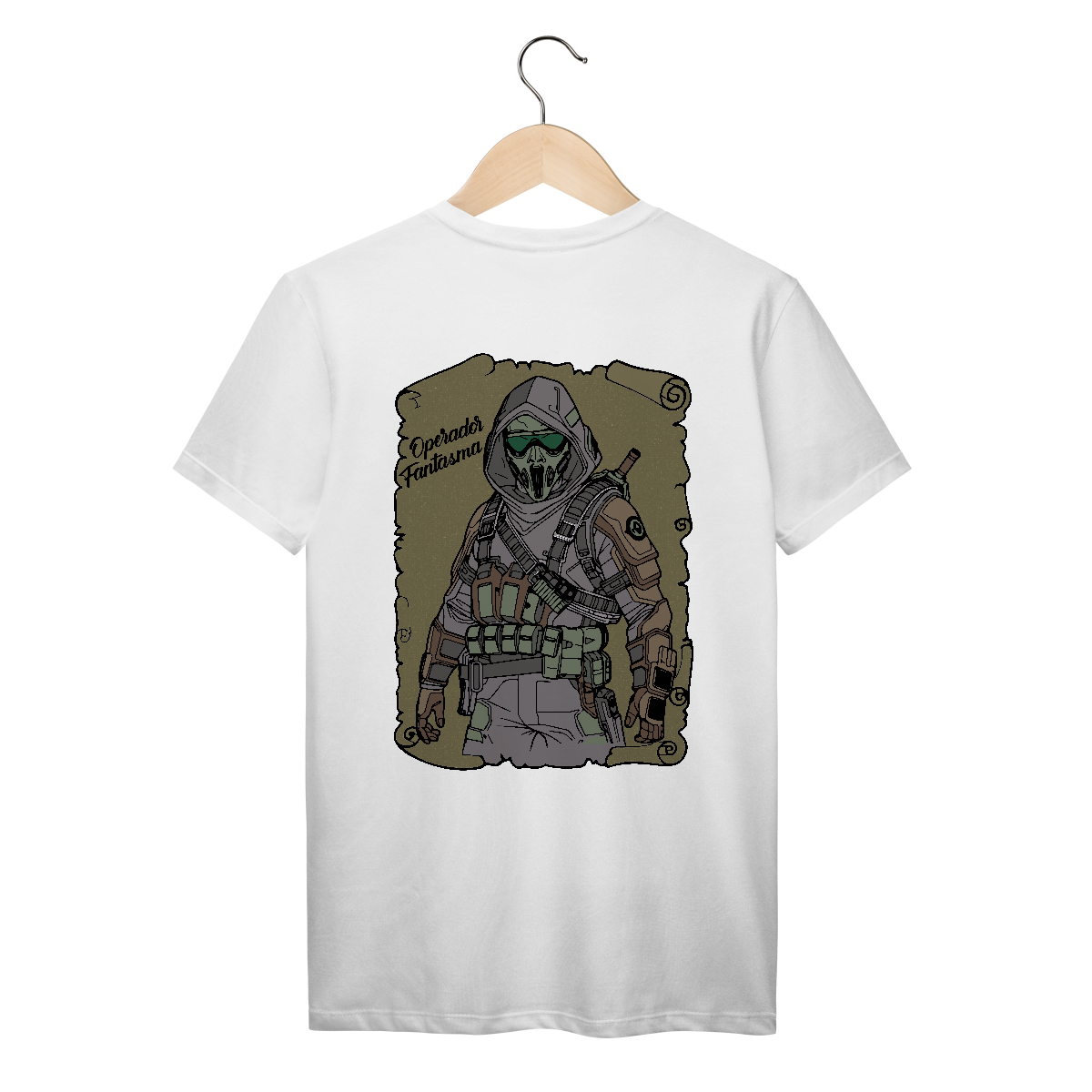 Entre na linha de frente com esta estampa imponente. Um personagem encapuzado com armadura moderna, máscara de respiração e equipamentos táticos reforçados, pronto para qualquer missão. Com tons de verde militar e cinza, a arte transmite poder, precisão e mistério.