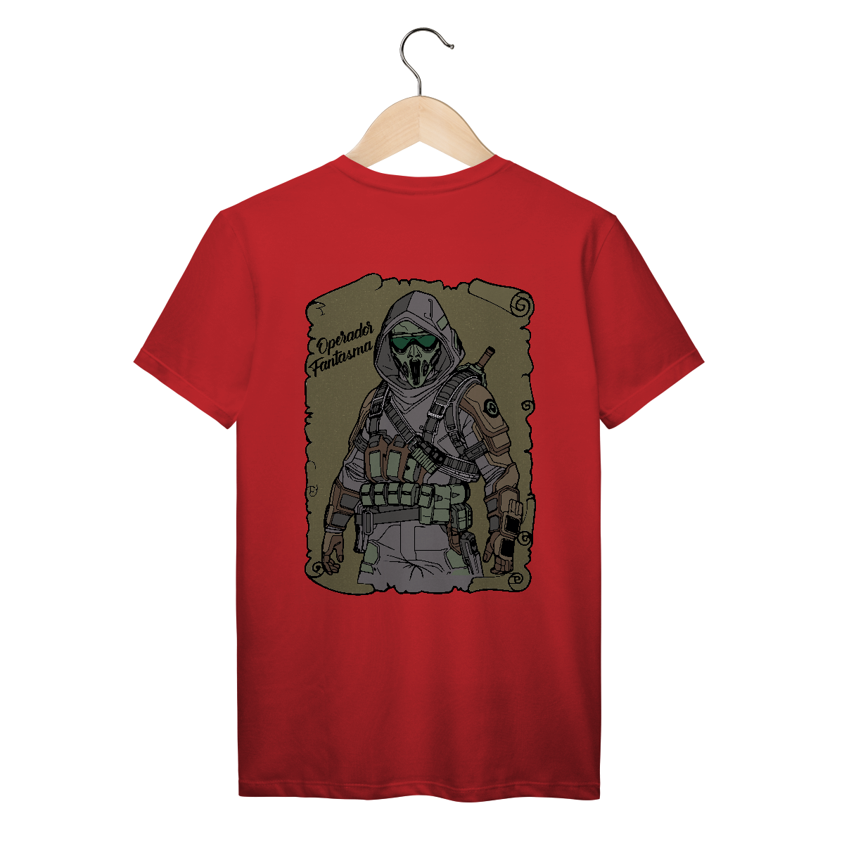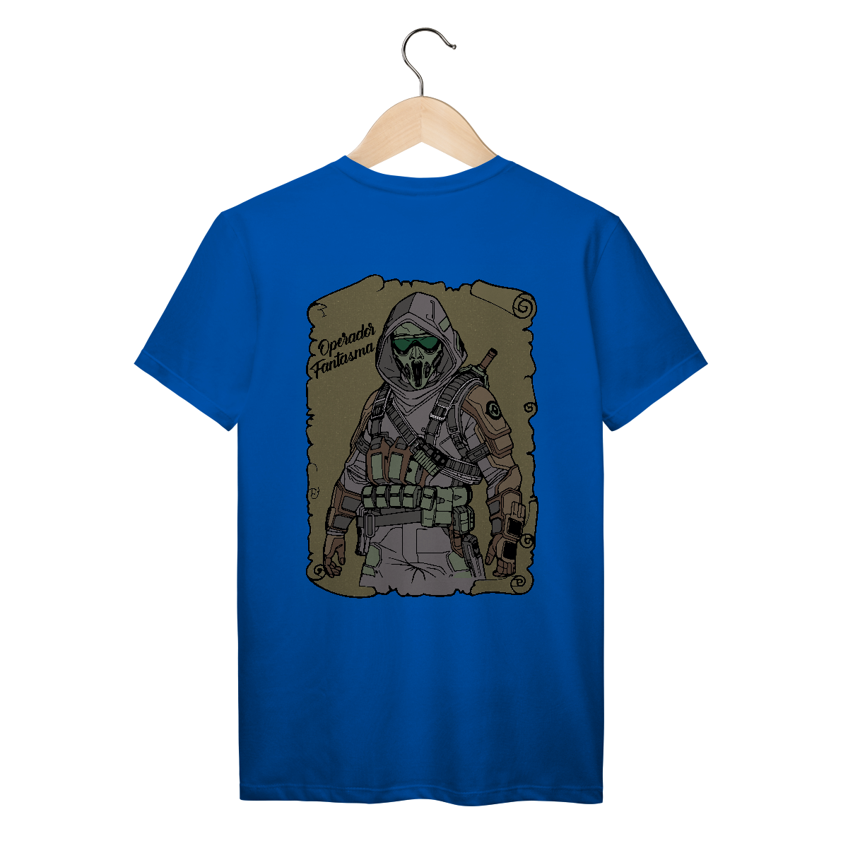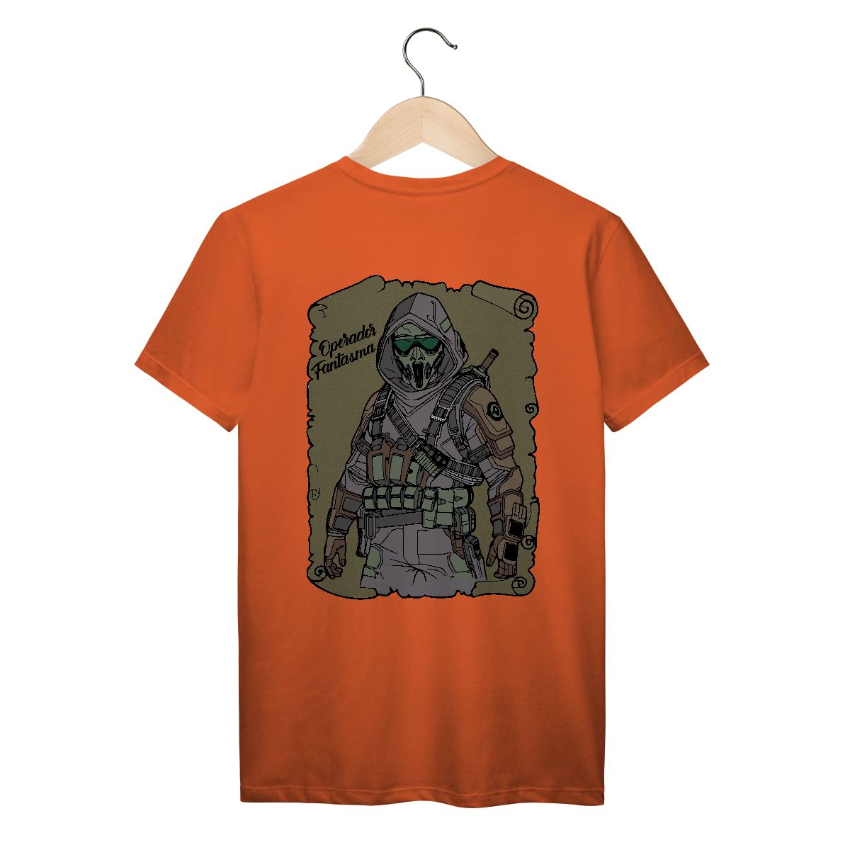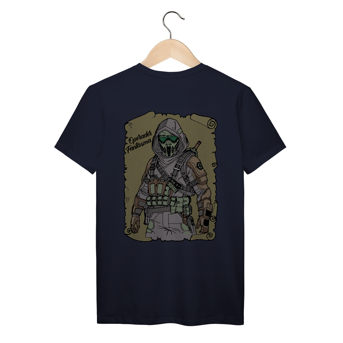 Entre na linha de frente com esta estampa imponente. Um personagem encapuzado com armadura moderna, máscara de respiração e equipamentos táticos reforçados, pronto para qualquer missão. Com tons de verde militar e cinza, a arte transmite poder, precisão e mistério.