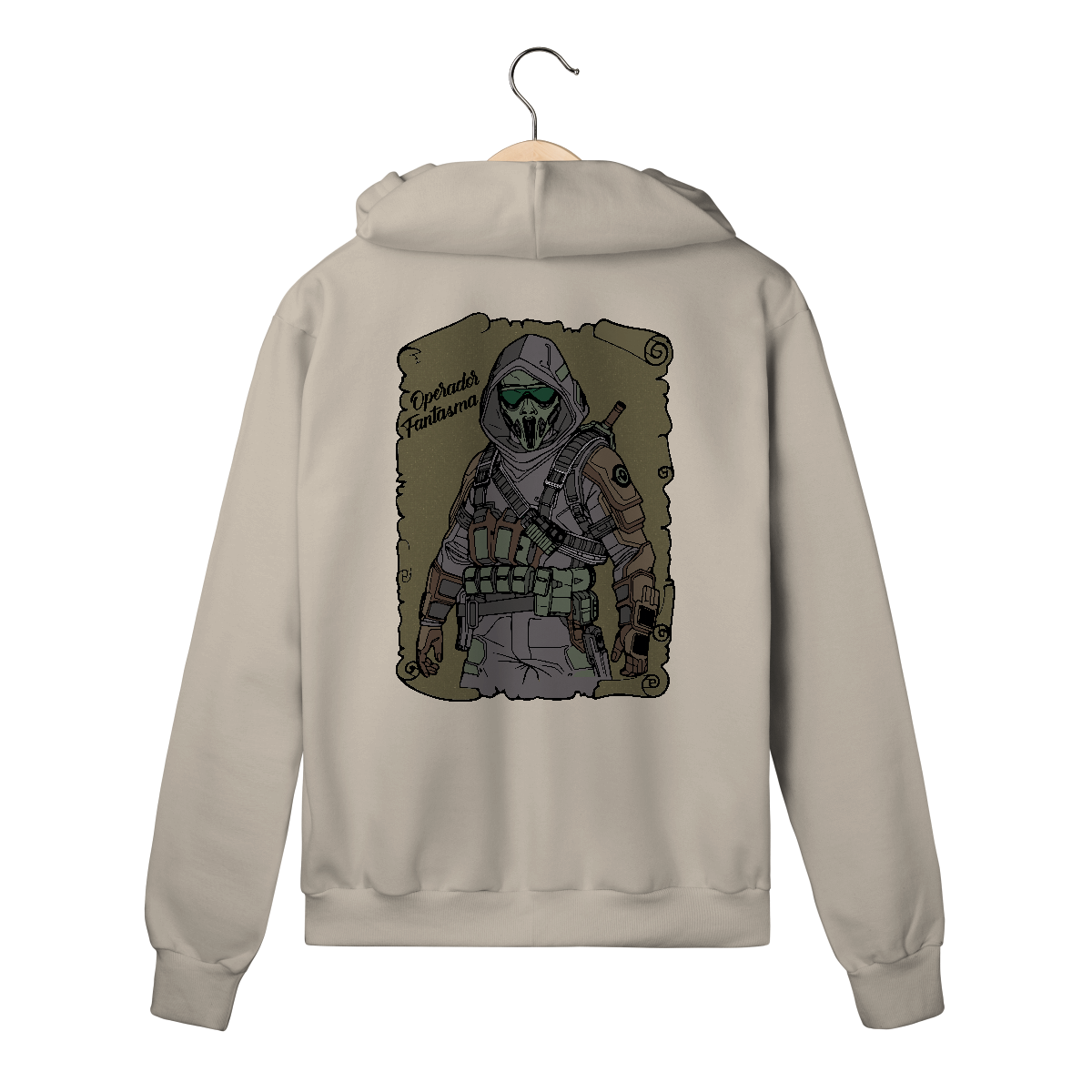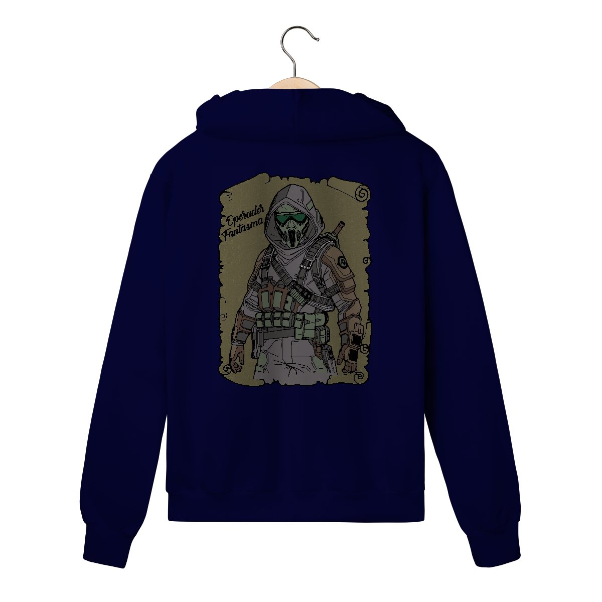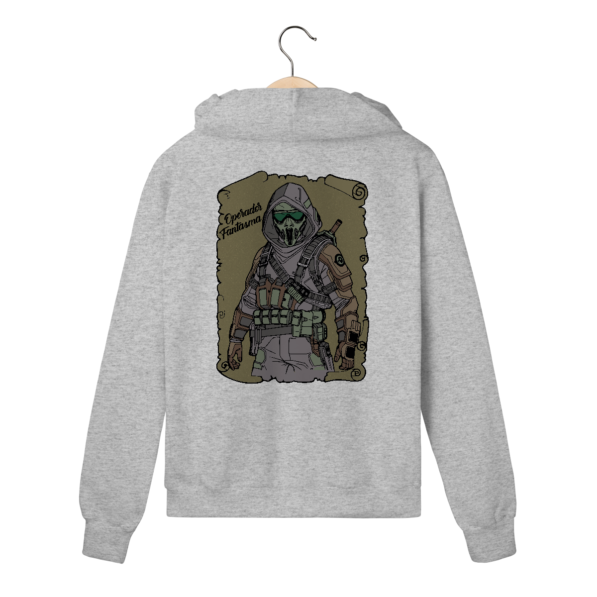 Entre na linha de frente com esta estampa imponente. Um personagem encapuzado com armadura moderna, máscara de respiração e equipamentos táticos reforçados, pronto para qualquer missão. Com tons de verde militar e cinza, a arte transmite poder, precisão e mistério.