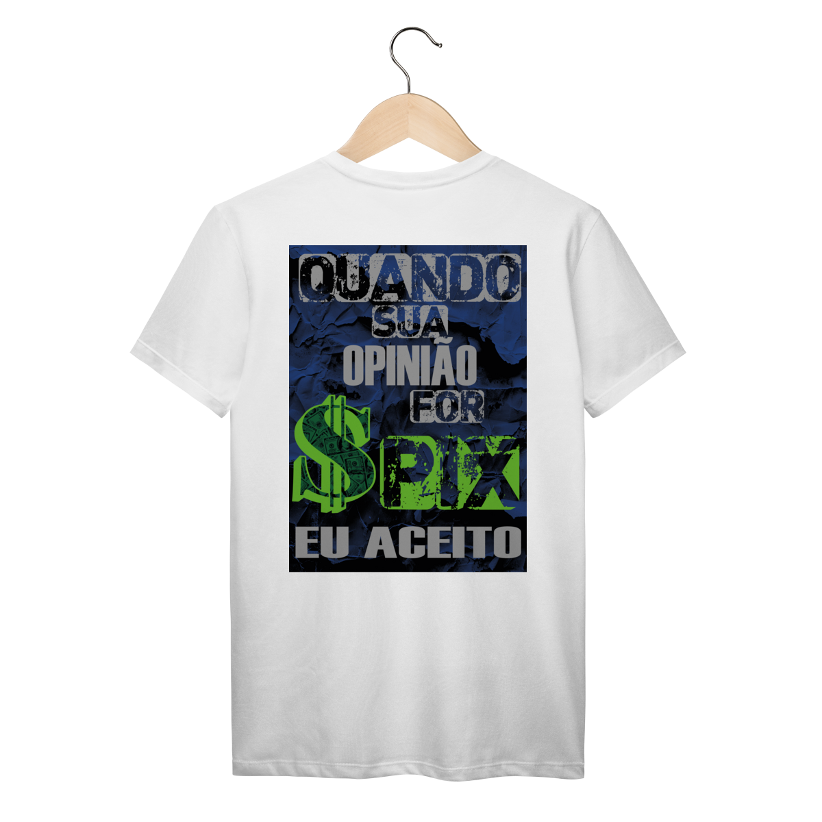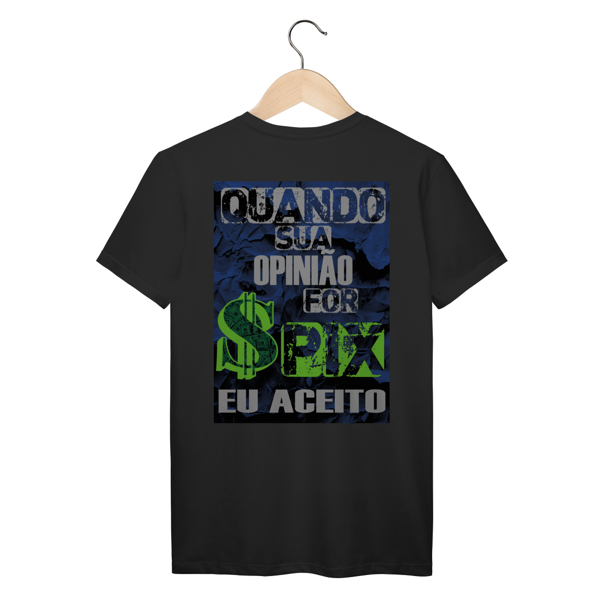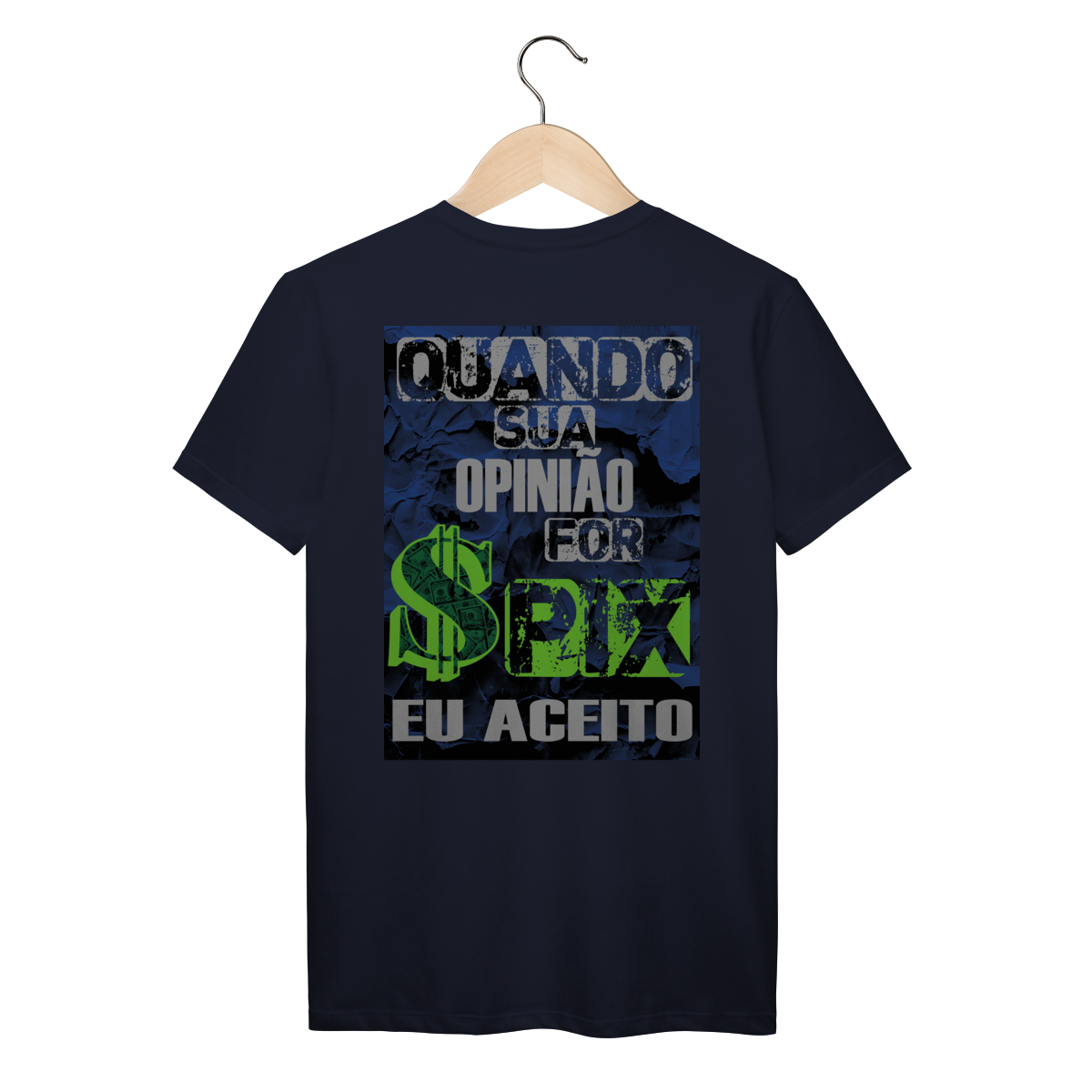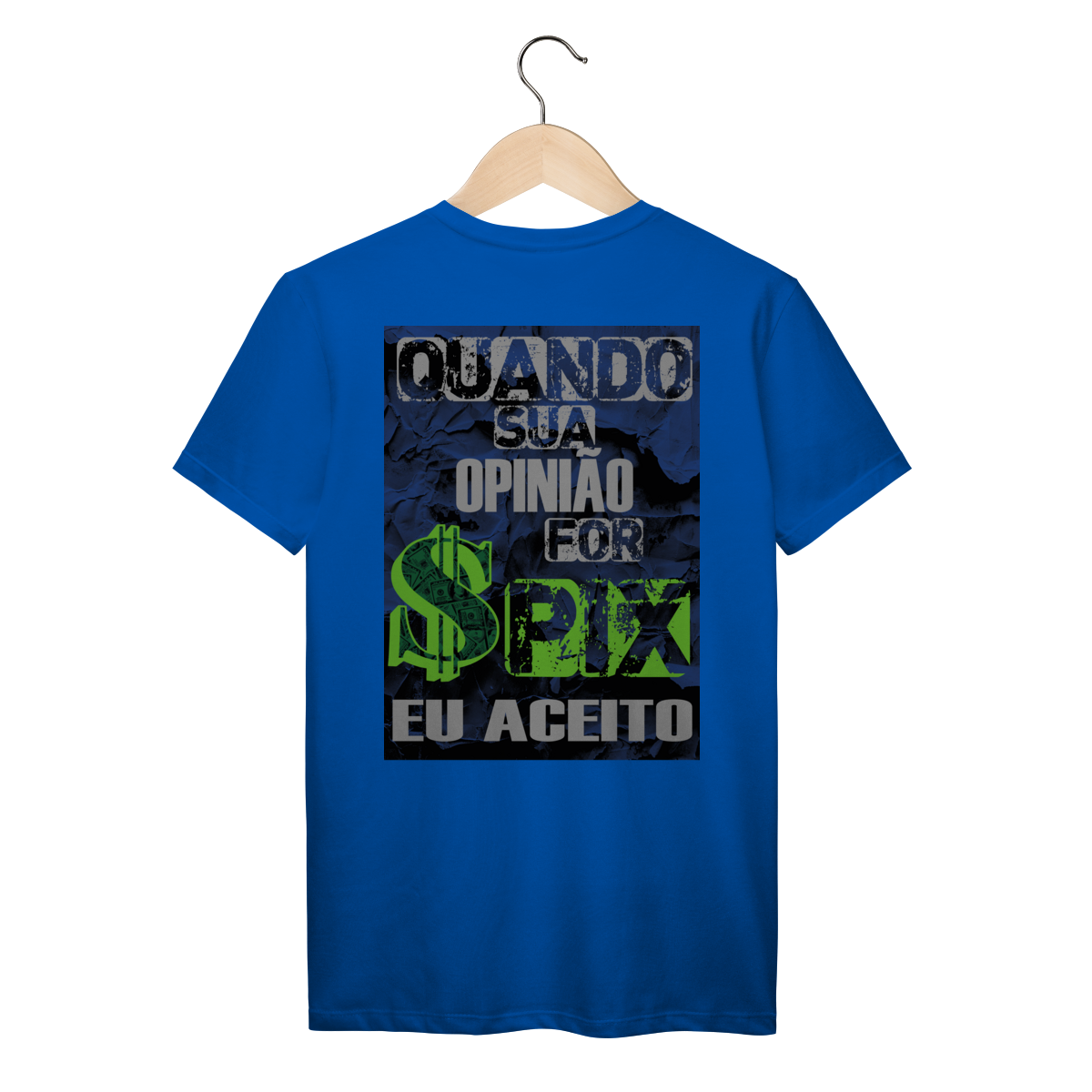 A estampa "Quando Sua Opinião For PIX Eu Aceito" é direta, ousada e perfeita para quem não tem papas na língua. Com um design moderno em fundo azul texturizado, letras marcantes e símbolos de dinheiro e PIX em destaque, essa peça transmite atitude e personalidade. Ideal para quem gosta de roupas com frases impactantes e cheias de estilo.