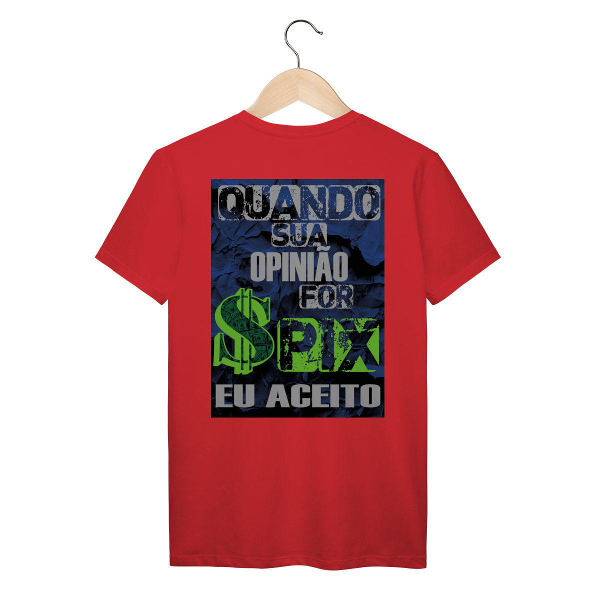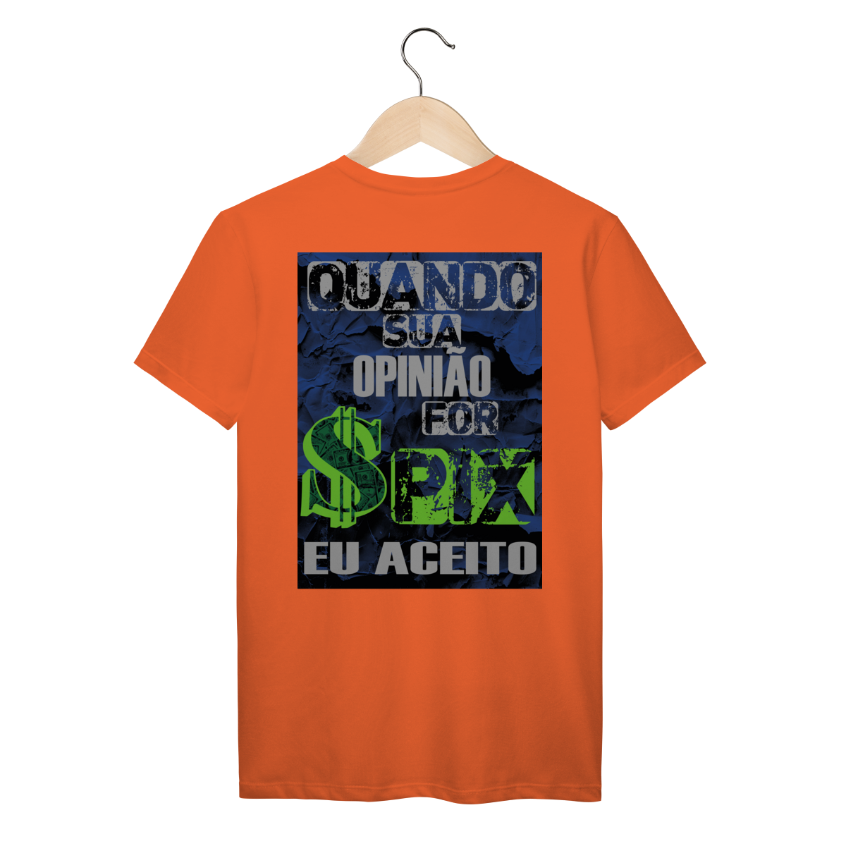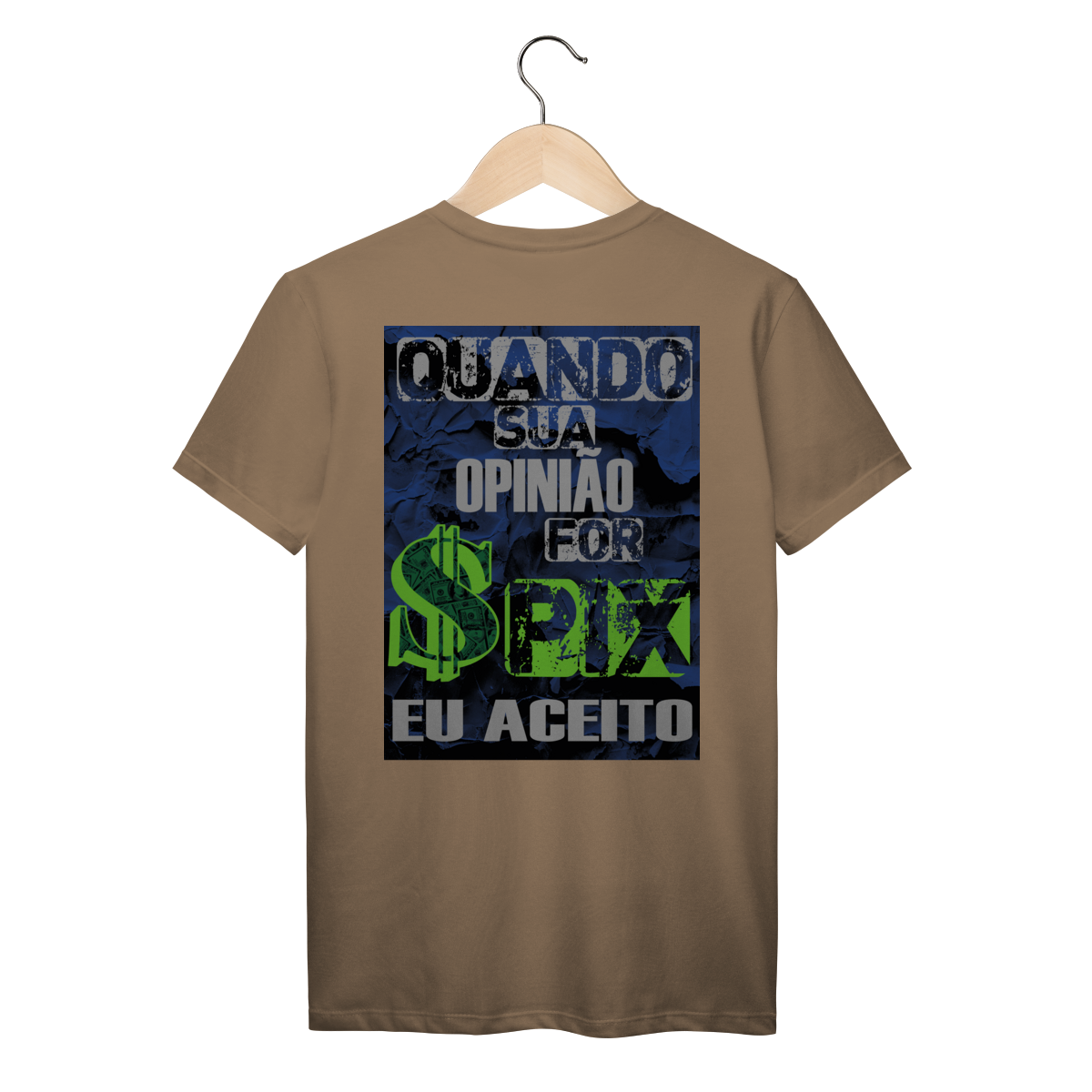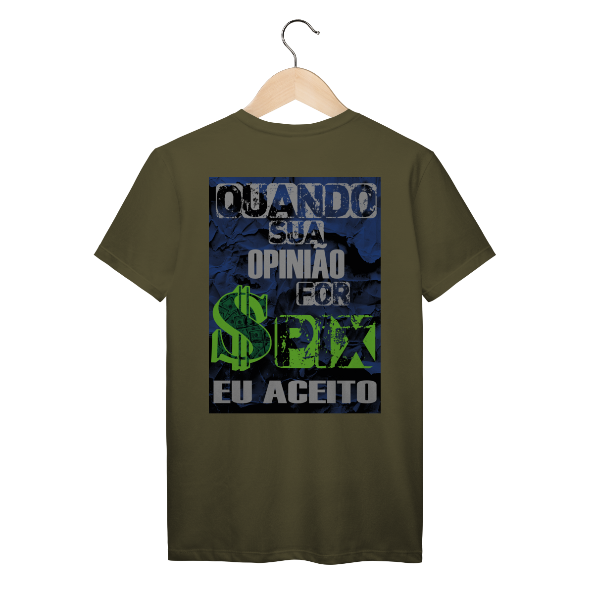 A estampa "Quando Sua Opinião For PIX Eu Aceito" é direta, ousada e perfeita para quem não tem papas na língua. Com um design moderno em fundo azul texturizado, letras marcantes e símbolos de dinheiro e PIX em destaque, essa peça transmite atitude e personalidade. Ideal para quem gosta de roupas com frases impactantes e cheias de estilo.