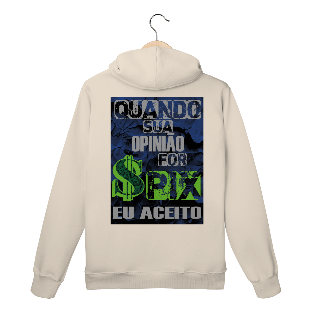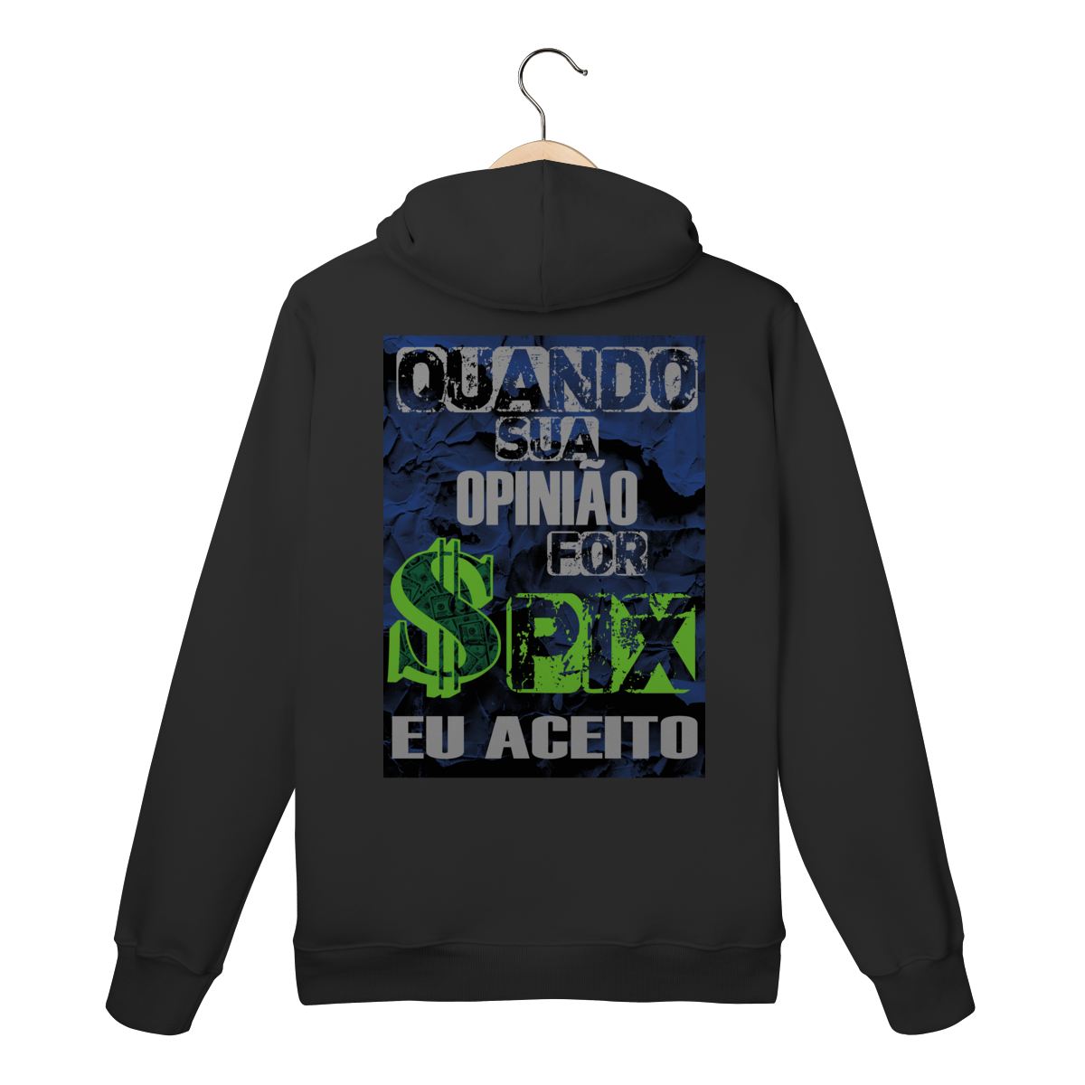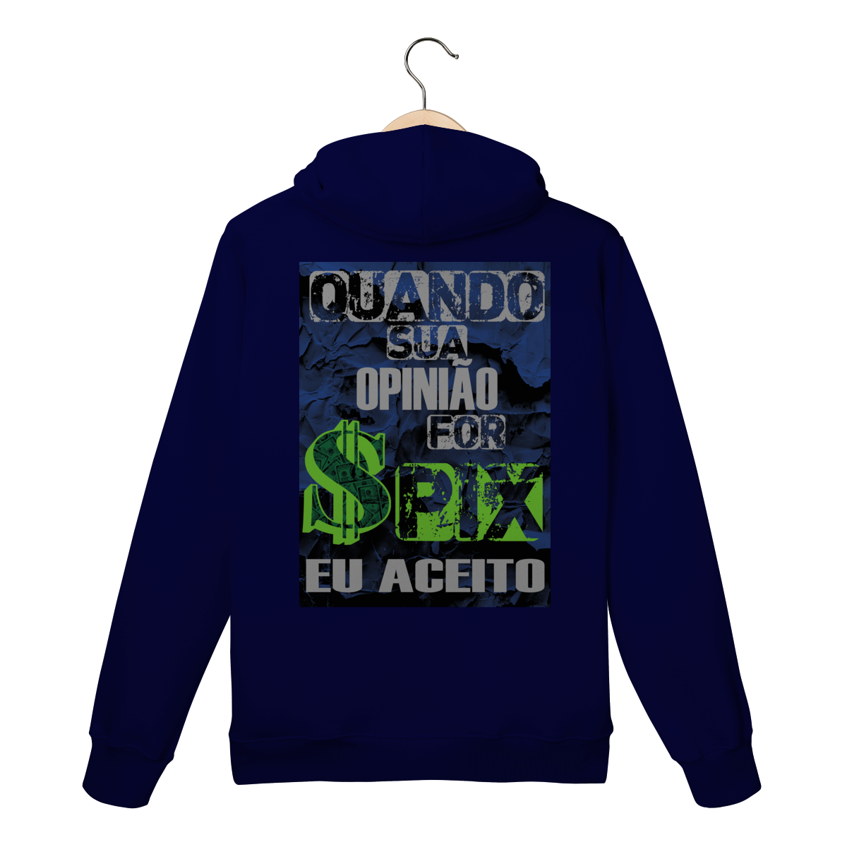 A estampa "Quando Sua Opinião For PIX Eu Aceito" é direta, ousada e perfeita para quem não tem papas na língua. Com um design moderno em fundo azul texturizado, letras marcantes e símbolos de dinheiro e PIX em destaque, essa peça transmite atitude e personalidade. Ideal para quem gosta de roupas com frases impactantes e cheias de estilo.