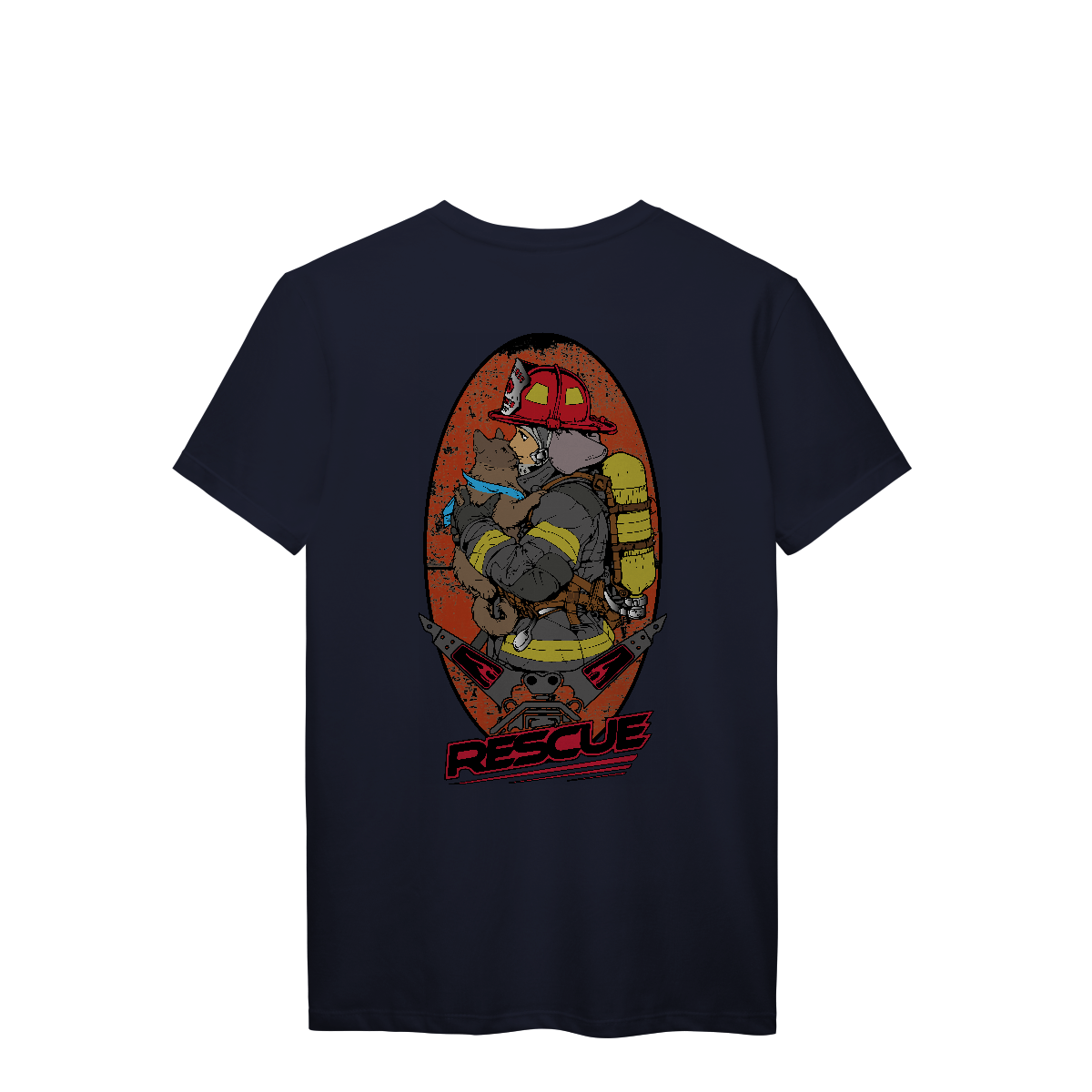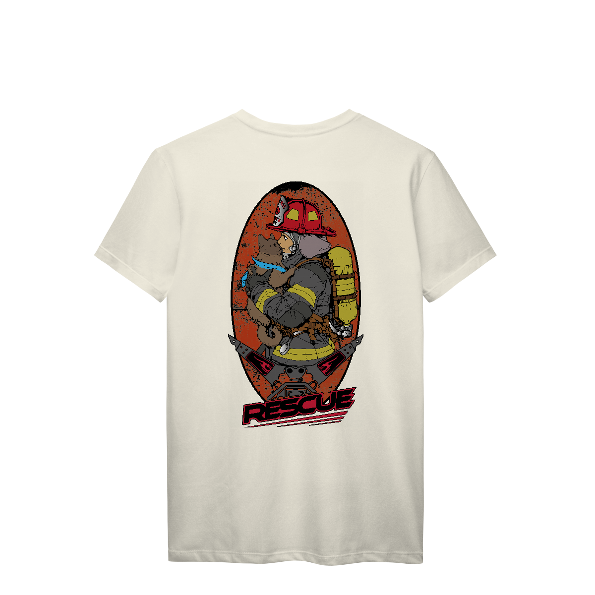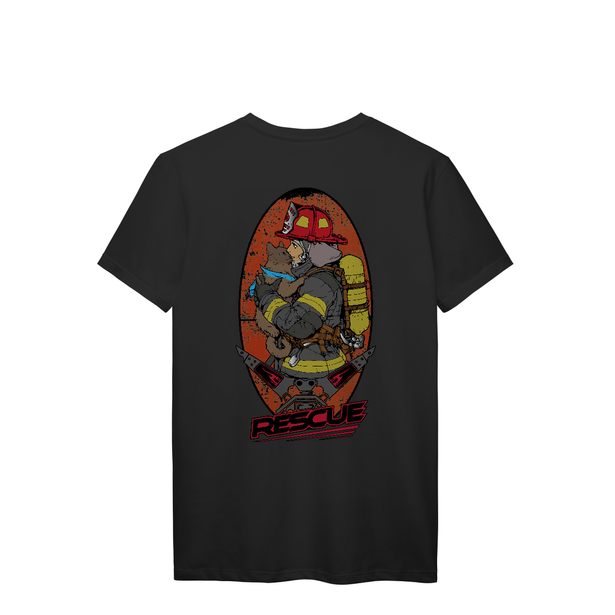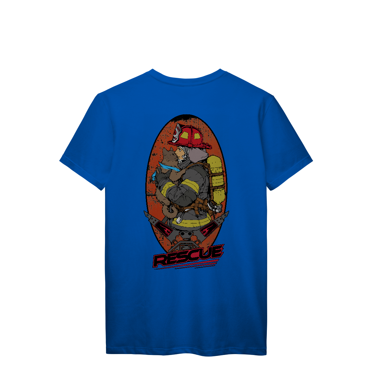 Esta estampa poderosa retrata a essência do resgate com sensibilidade e força. Em destaque, uma bombeira em traje completo de combate a incêndio segura nos braços um gato resgatado, transmitindo um momento de alívio, humanidade e empatia. O animal, com um lenço azul no pescoço, representa as vidas inocentes protegidas durante emergências.