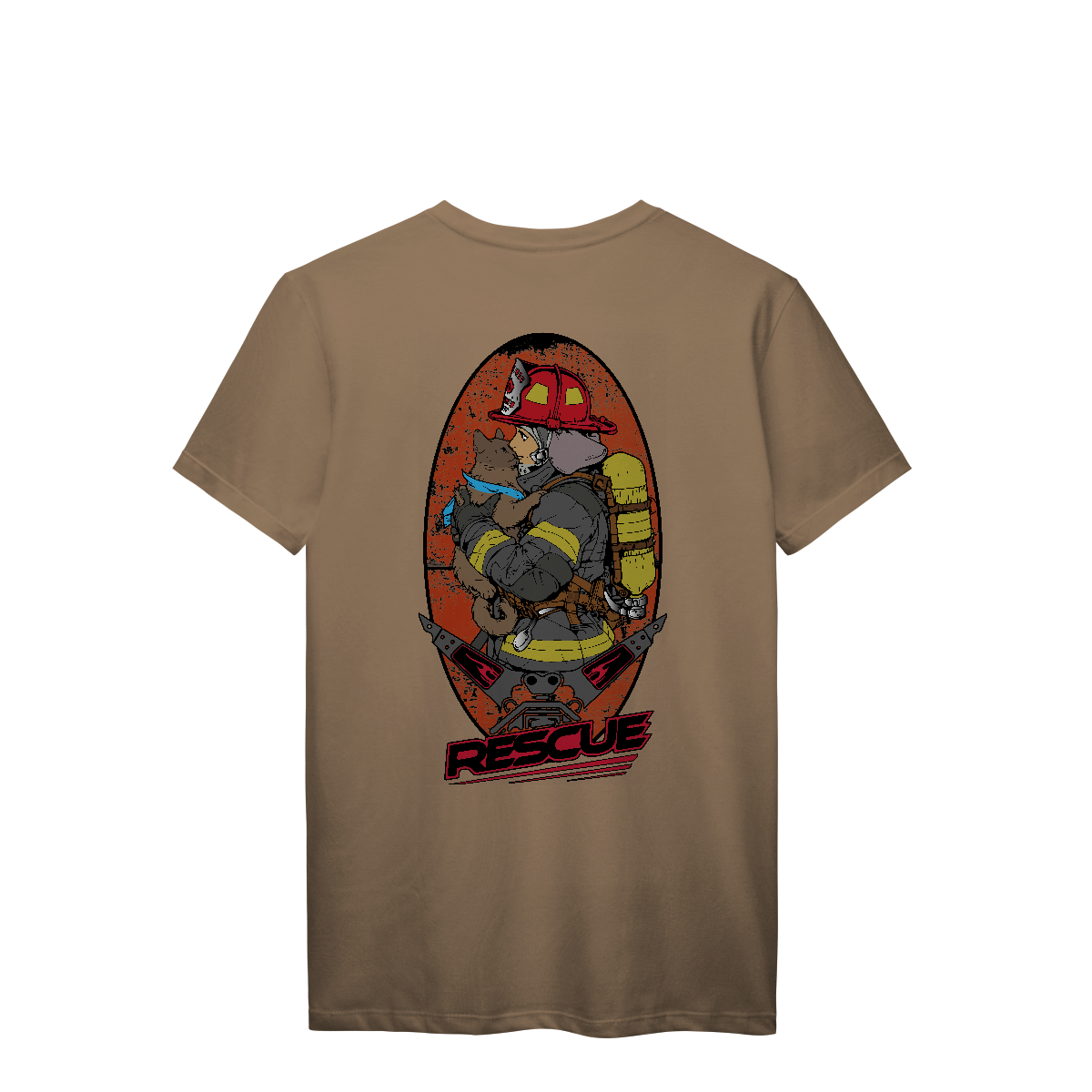 O fundo em tons avermelhados e texturizados simula fuligem e calor, trazendo dramaticidade à arte. A palavra RESCUE, em fonte robusta e inclinada na parte inferior, reforça a missão que vai além do fogo: salvar o que importa, com coragem e compaixão.
