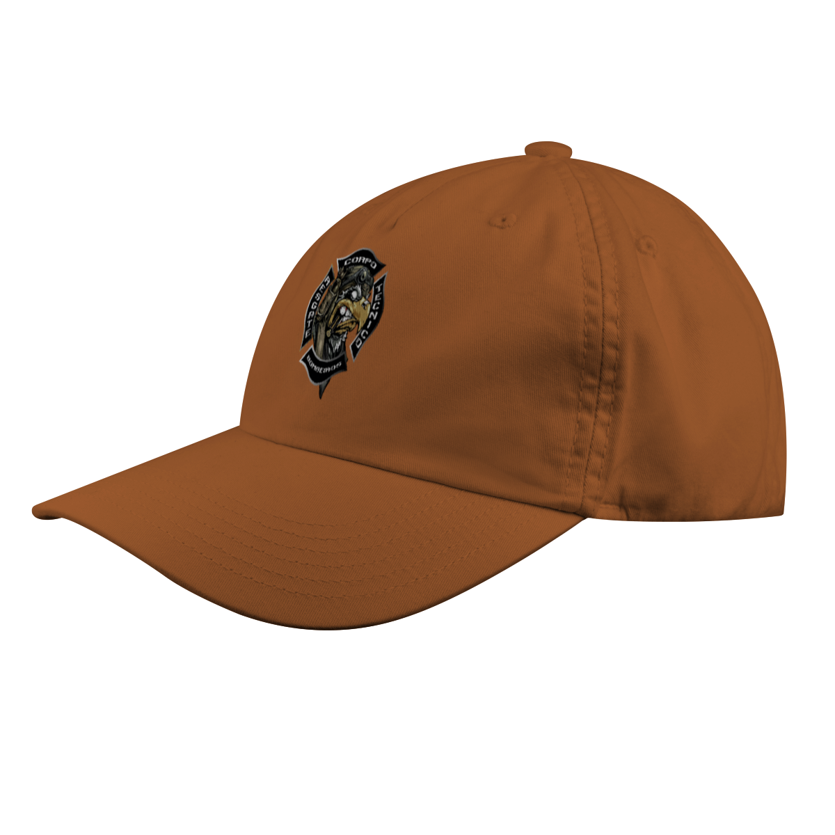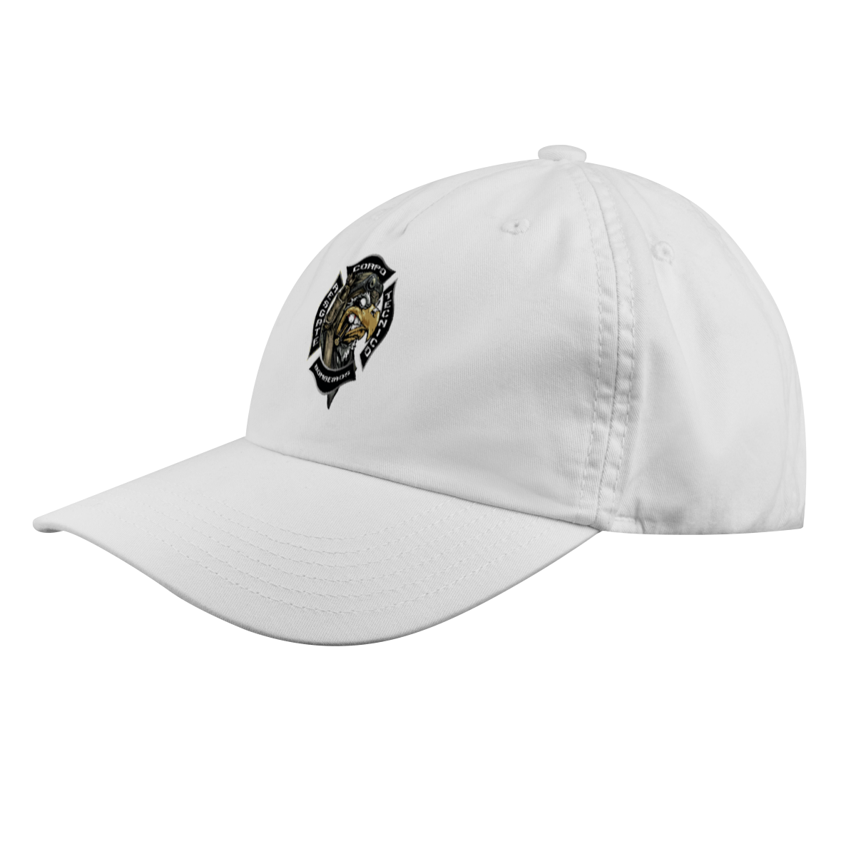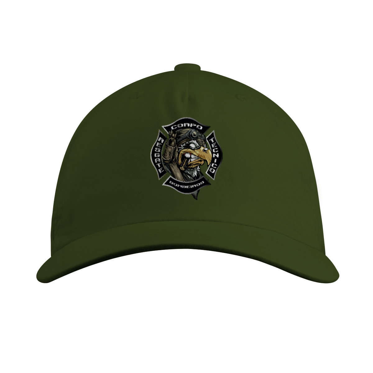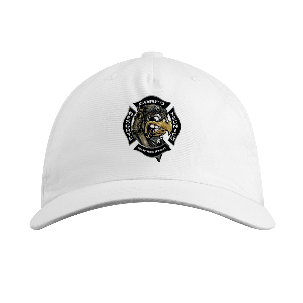 Design agressivo e estilizado que traz como figura central uma águia de expressão feroz, com dentes cerrados e um cartucho na boca, vestida com capacete e óculos de combate. A águia representa visão estratégica, força e autoridade, valores muito associados ao Corpo Técnico de Bombeiros e às equipes de resgate.