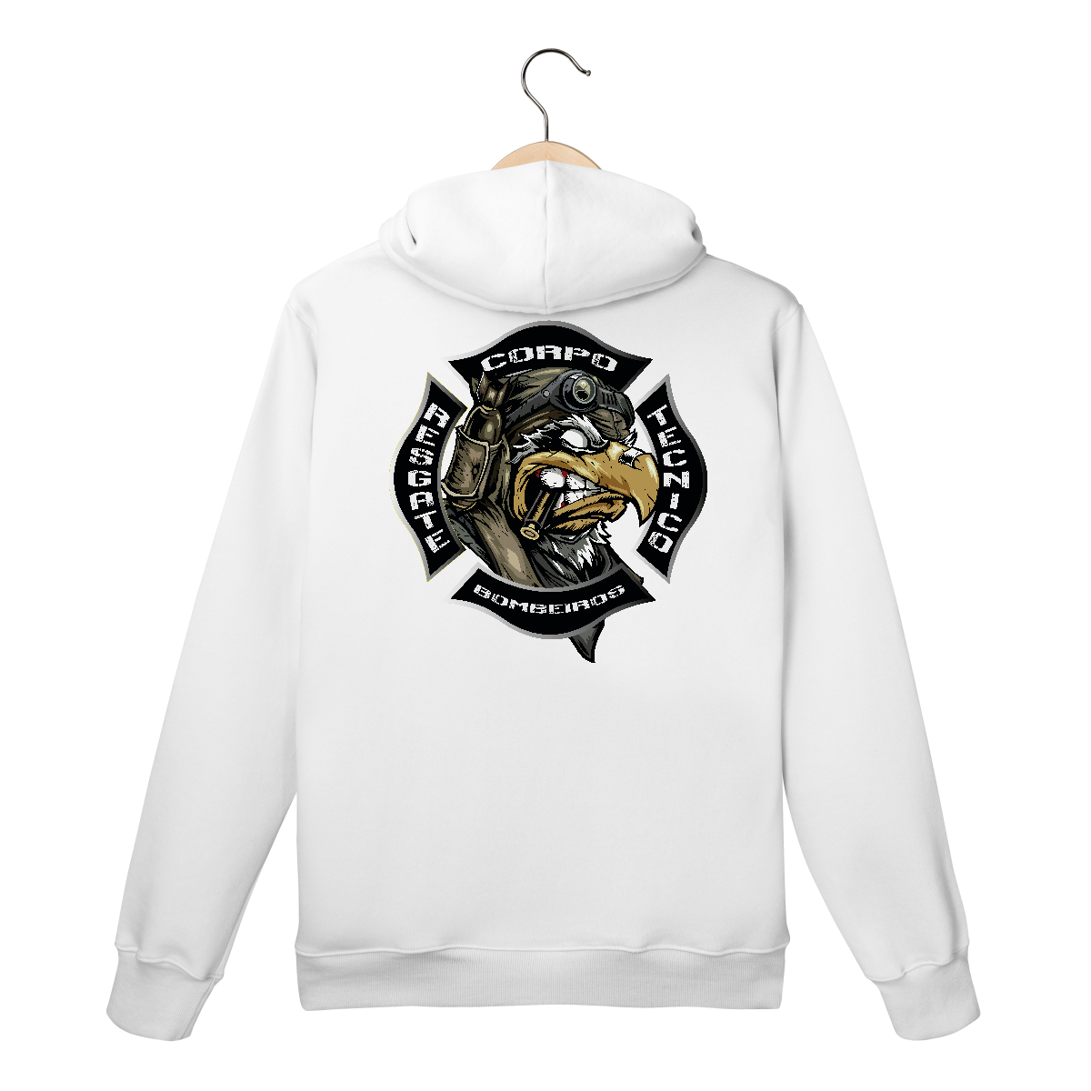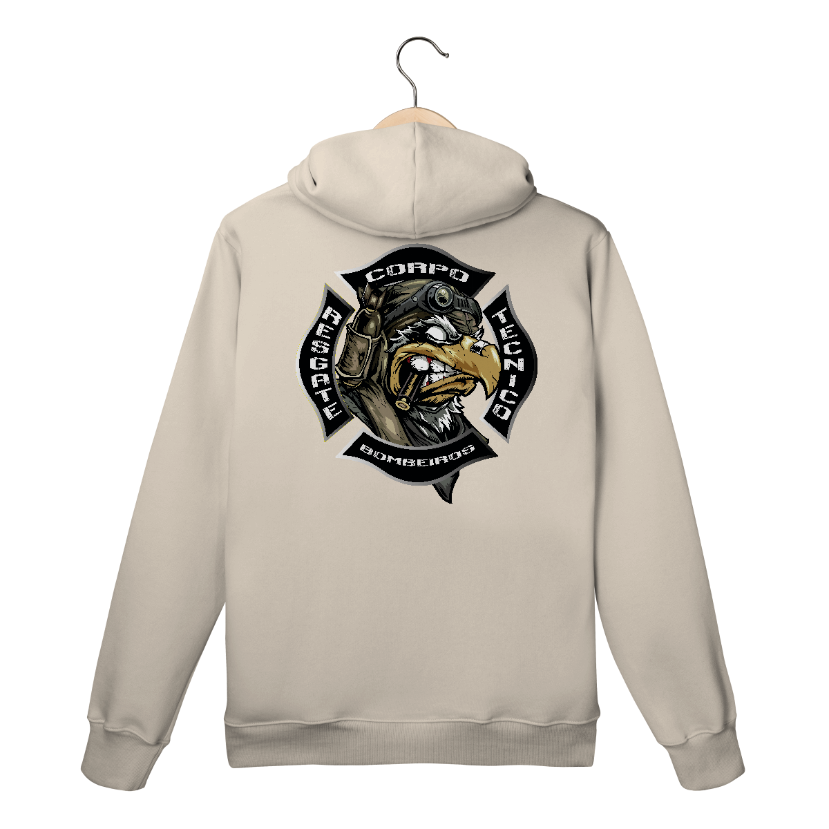 Design agressivo e estilizado que traz como figura central uma águia de expressão feroz, com dentes cerrados e um cartucho na boca, vestida com capacete e óculos de combate. A águia representa visão estratégica, força e autoridade, valores muito associados ao Corpo Técnico de Bombeiros e às equipes de resgate.