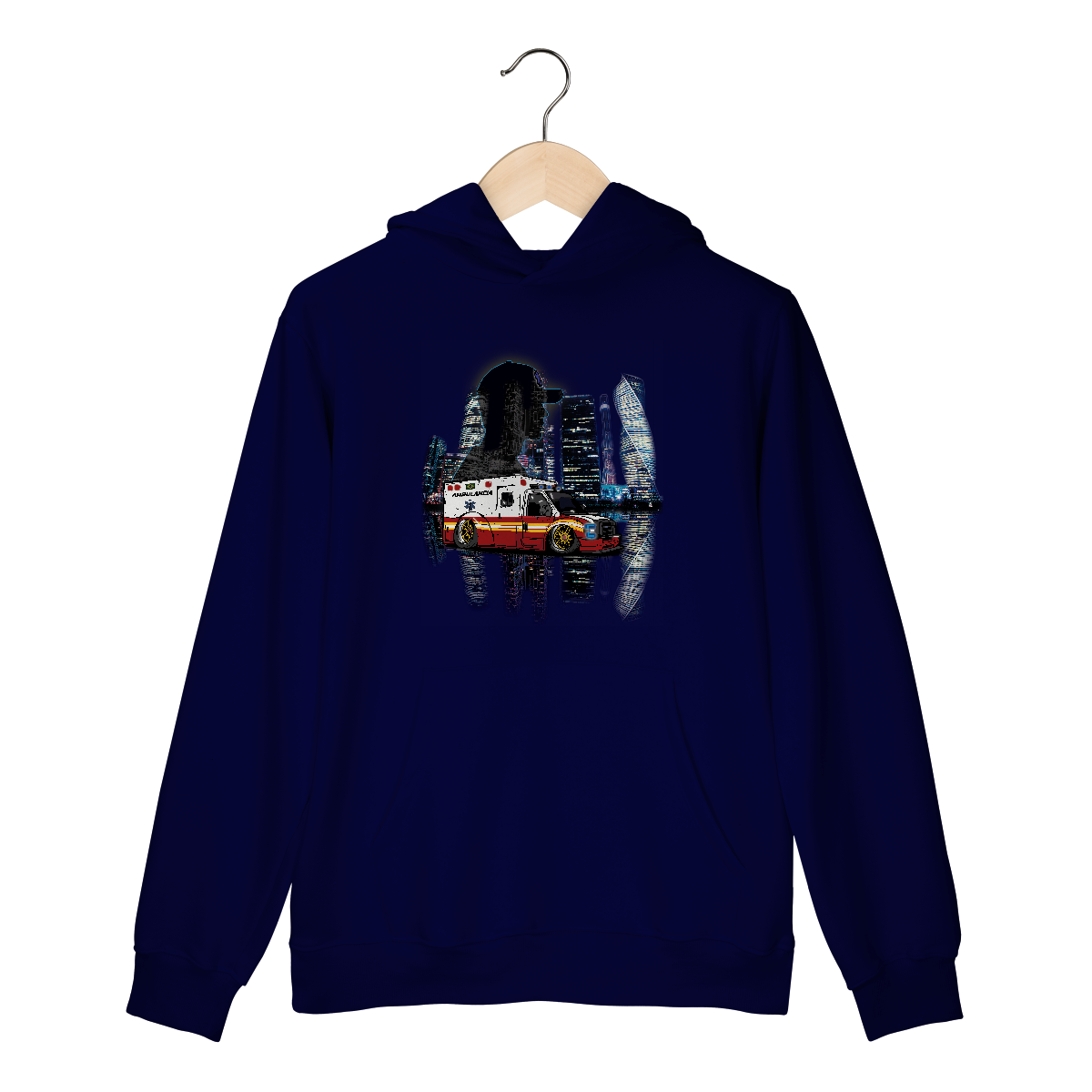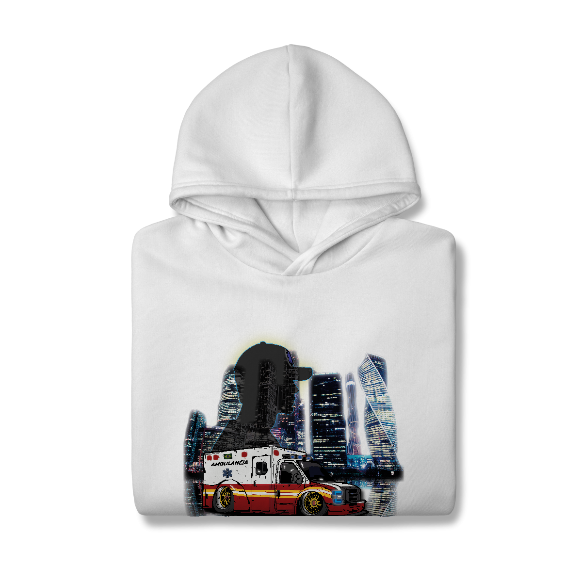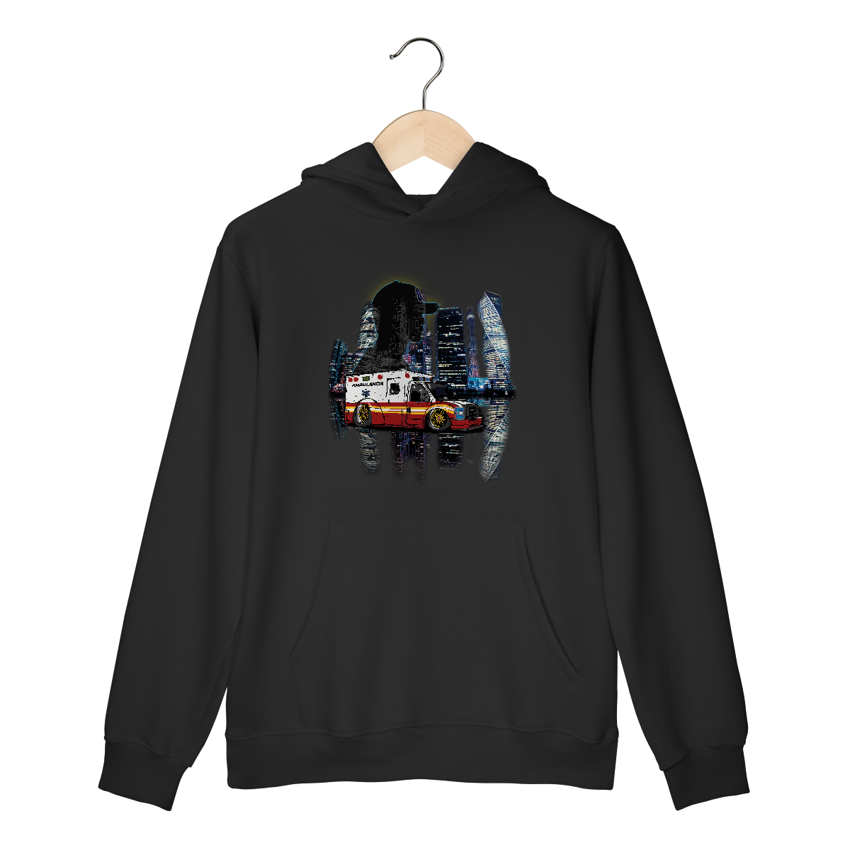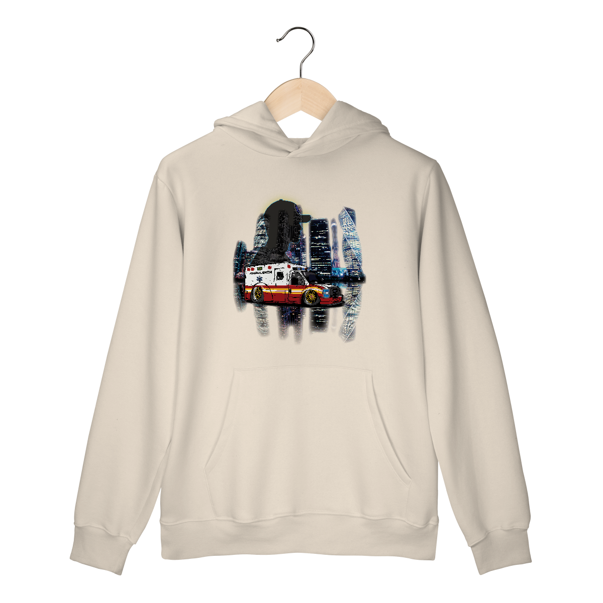 Esta arte vibrante e urbana homenageia os profissionais do resgate com estilo e atitude. Em primeiro plano, uma ambulância customizada em estilo lowrider domina a cena — com rodas esportivas, suspensão rebaixada e detalhes gráficos agressivos, ela representa a fusão entre o mundo do socorro e a cultura de rua. A bandeira do Brasil reforça o orgulho nacional dos socorristas.