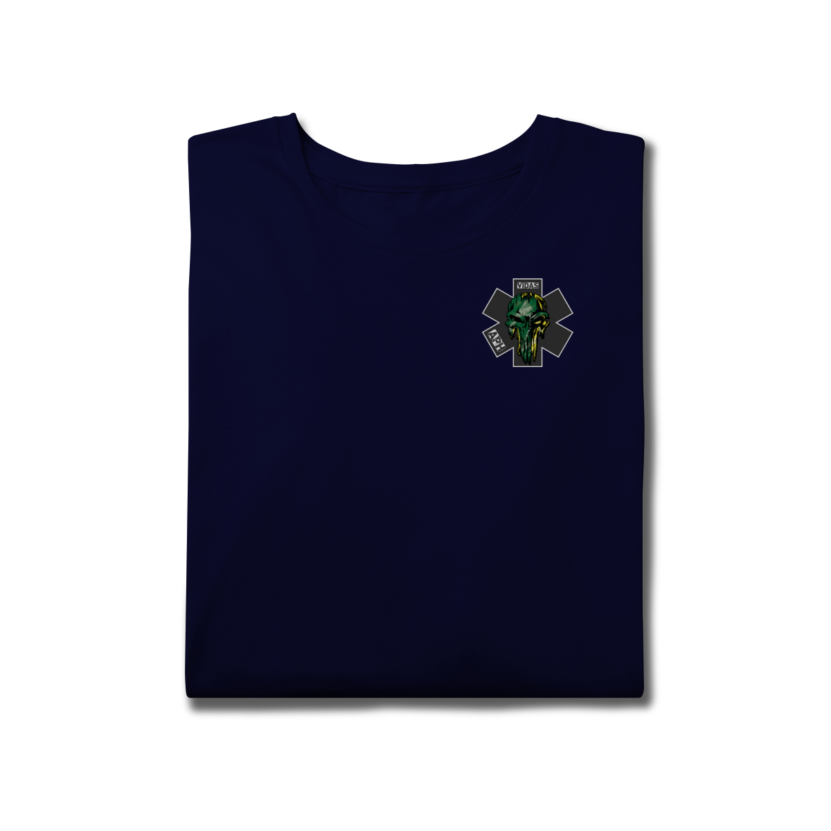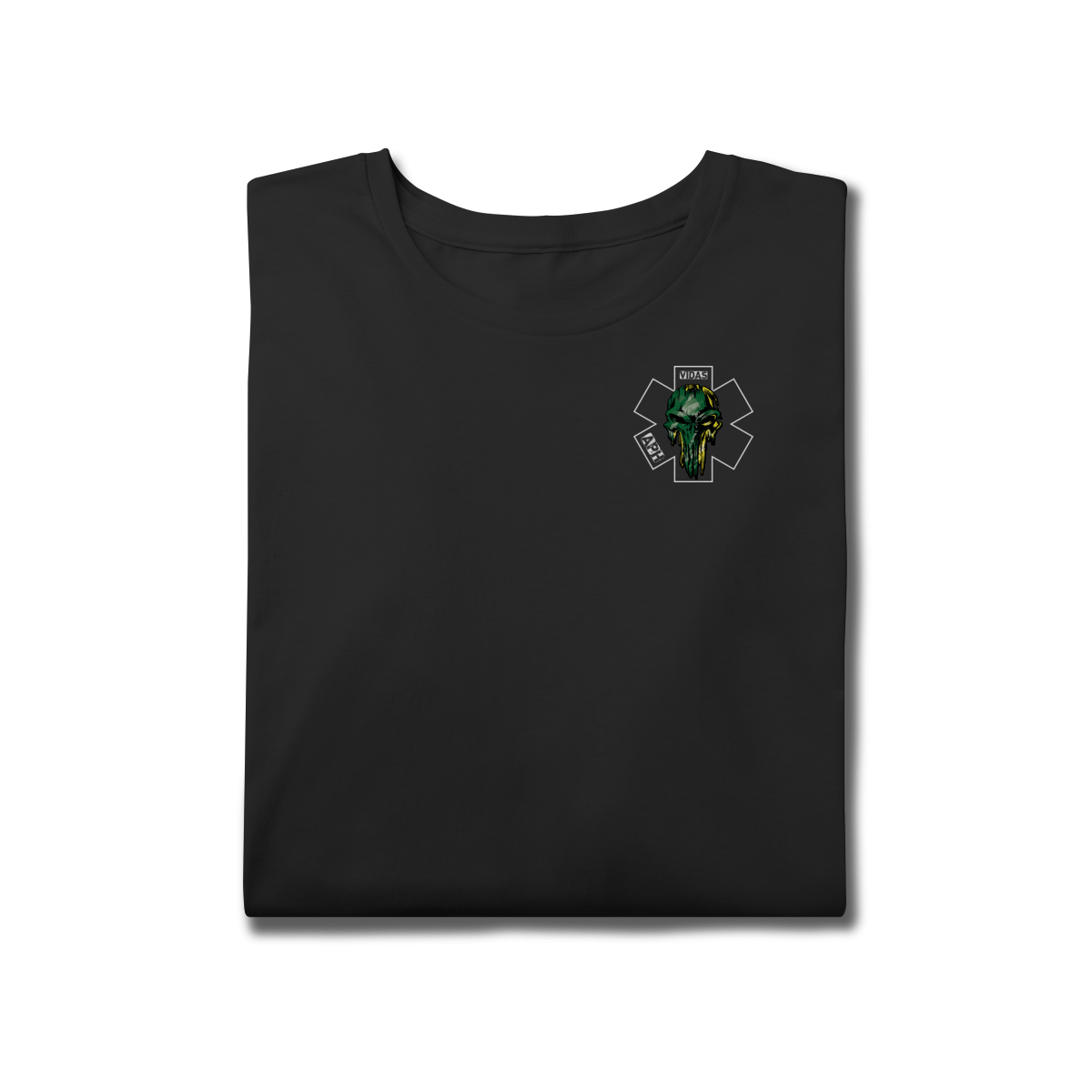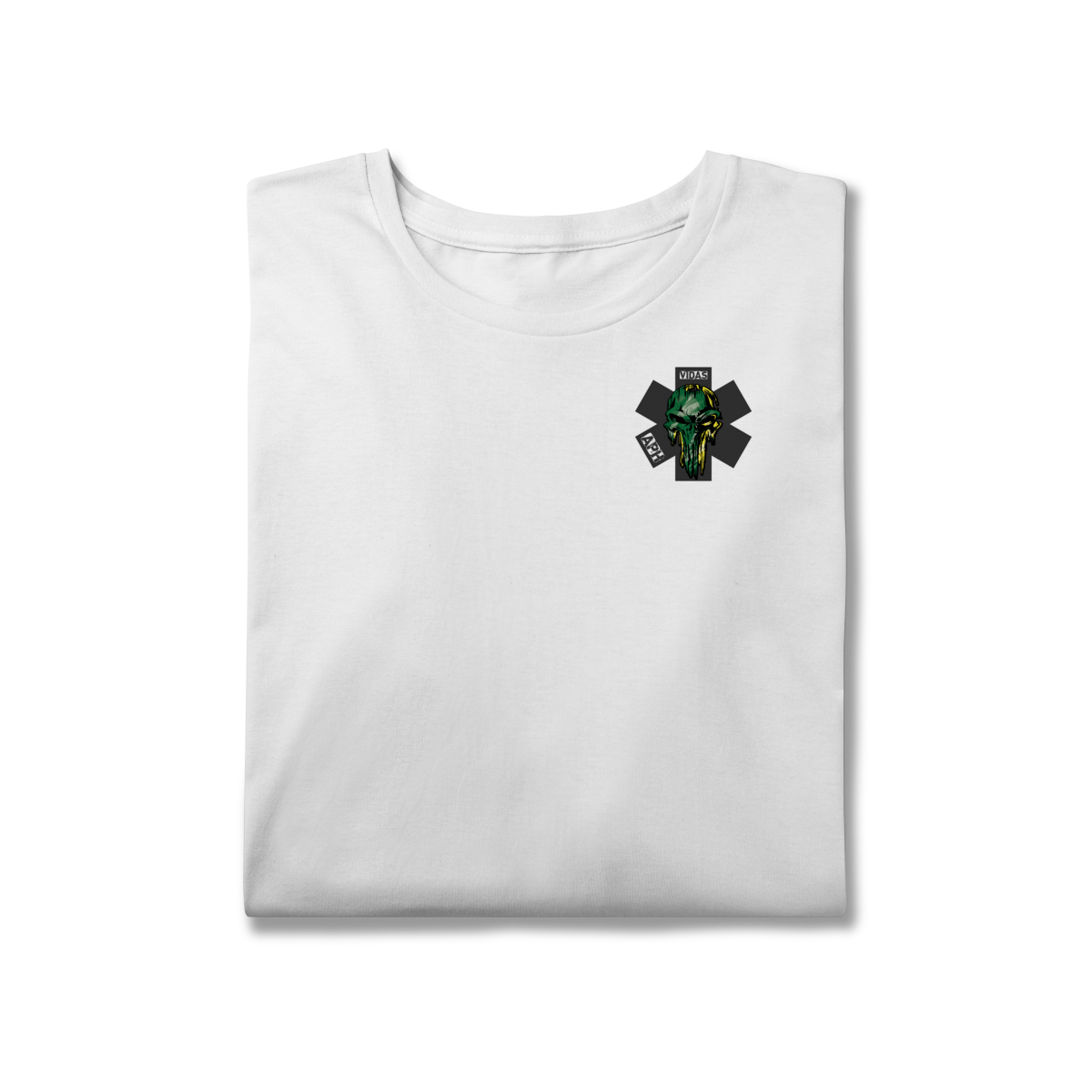 Uma arte impactante que representa a bravura e a garra dos profissionais do Atendimento Pré-Hospitalar. O design traz uma caveira estilizada em verde e amarelo, com um visual forte e marcante, destacando a estrela da vida e as palavras APH e VIDAS, simbolizando a luta diária de quem está sempre pronto para salvar.