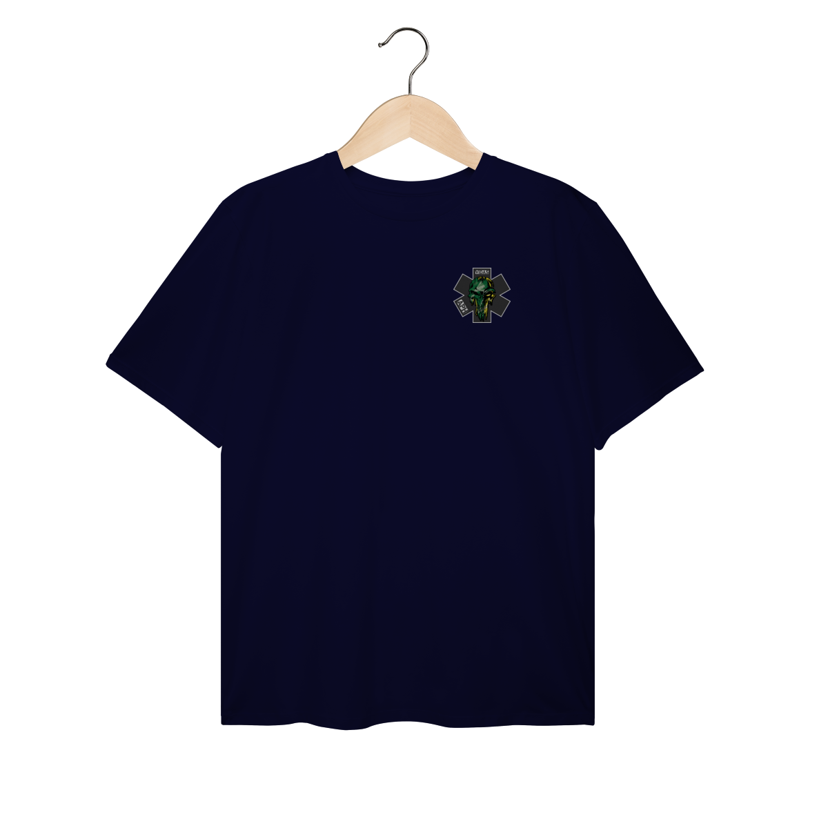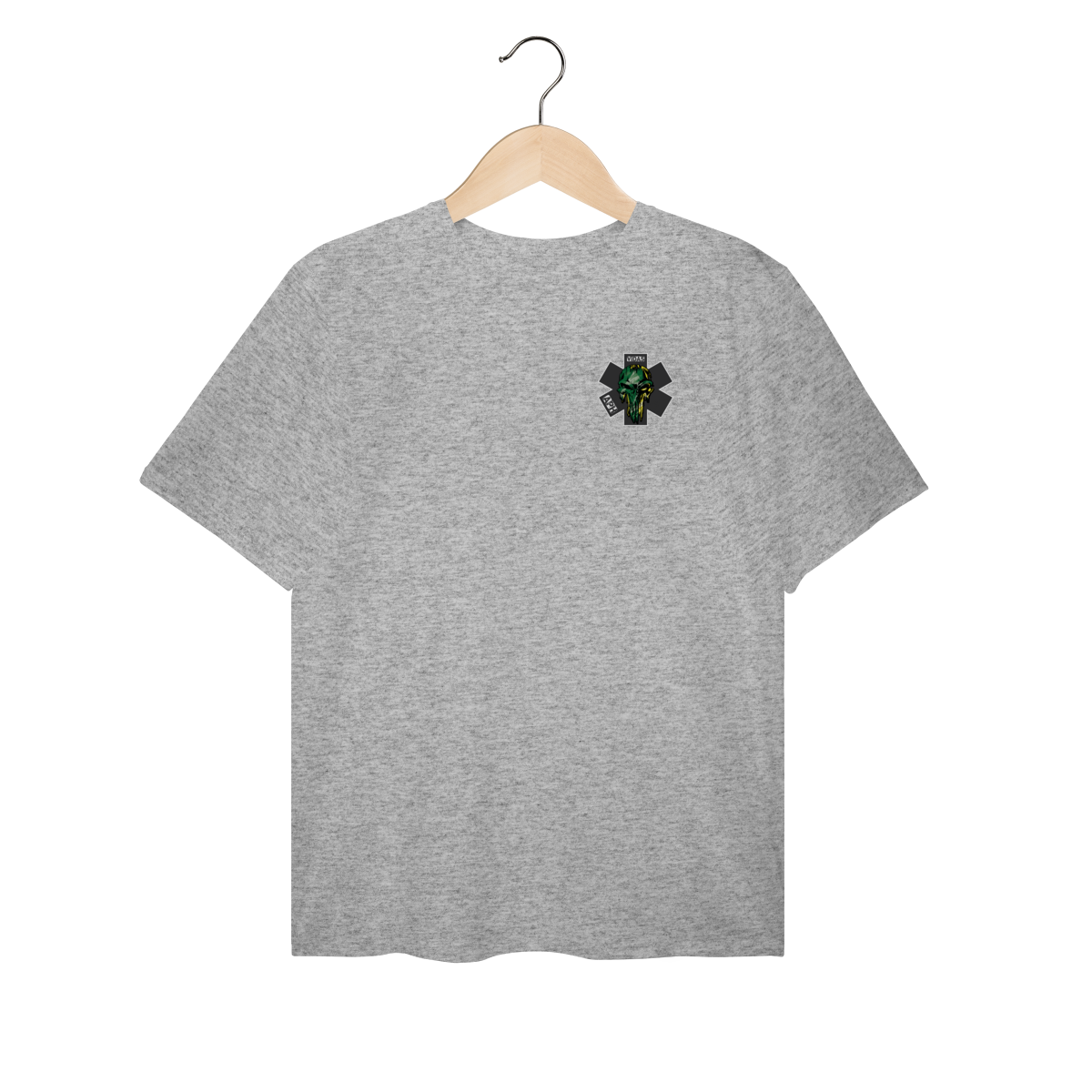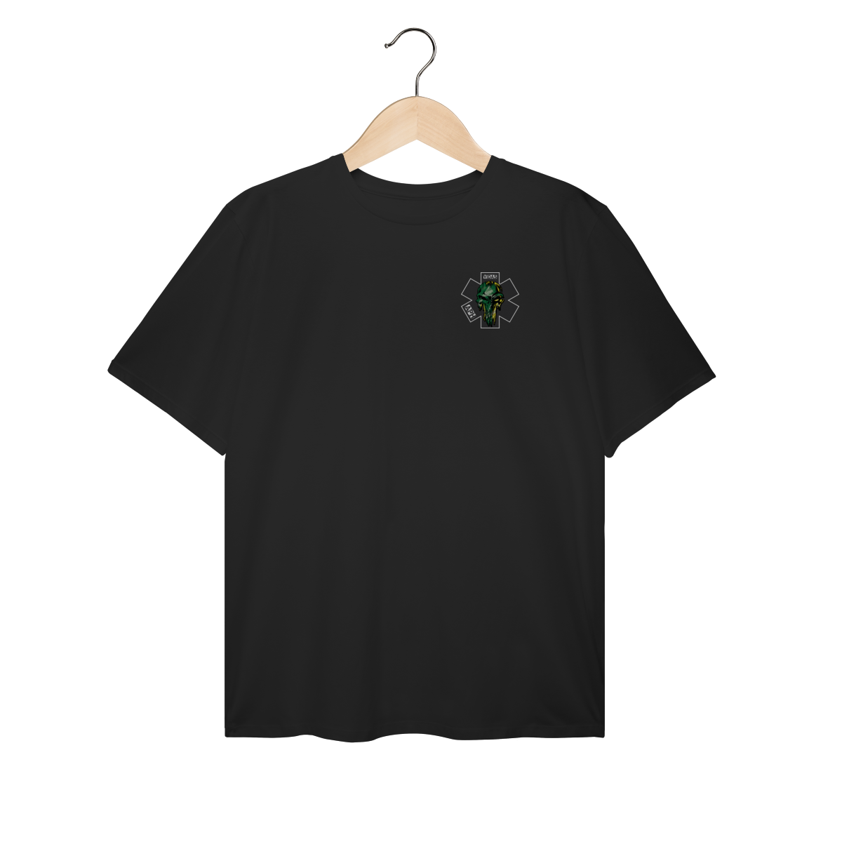 Uma arte impactante que representa a bravura e a garra dos profissionais do Atendimento Pré-Hospitalar. O design traz uma caveira estilizada em verde e amarelo, com um visual forte e marcante, destacando a estrela da vida e as palavras APH e VIDAS, simbolizando a luta diária de quem está sempre pronto para salvar.
