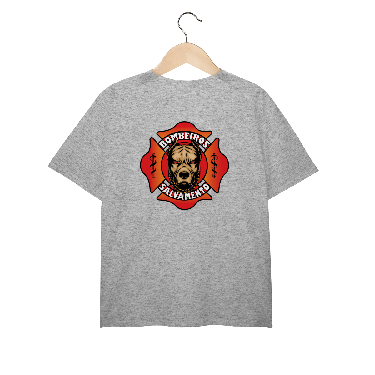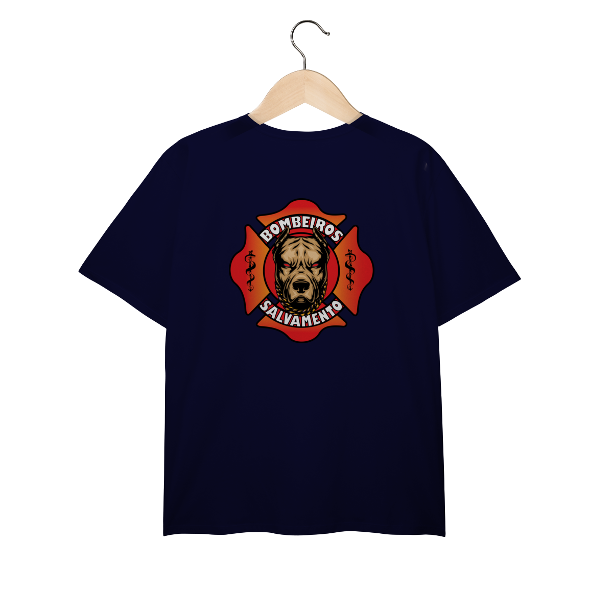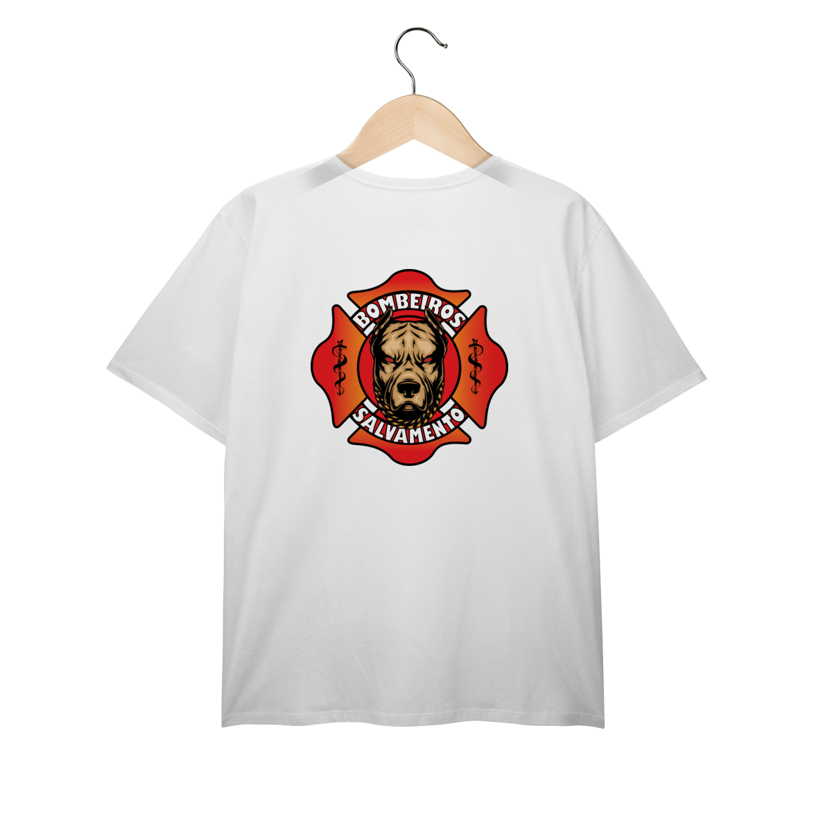 Estampa poderosa que une a força e a lealdade representadas pela figura de um cão imponente, dentro da cruz de malta dos bombeiros. Com tons quentes em vermelho e laranja, o design transmite coragem, proteção e a missão incansável de salvar vidas em qualquer situação de emergência.