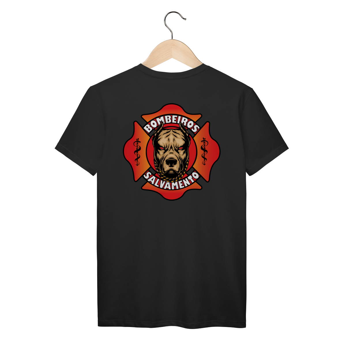 Estampa poderosa que une a força e a lealdade representadas pela figura de um cão imponente, dentro da cruz de malta dos bombeiros. Com tons quentes em vermelho e laranja, o design transmite coragem, proteção e a missão incansável de salvar vidas em qualquer situação de emergência.