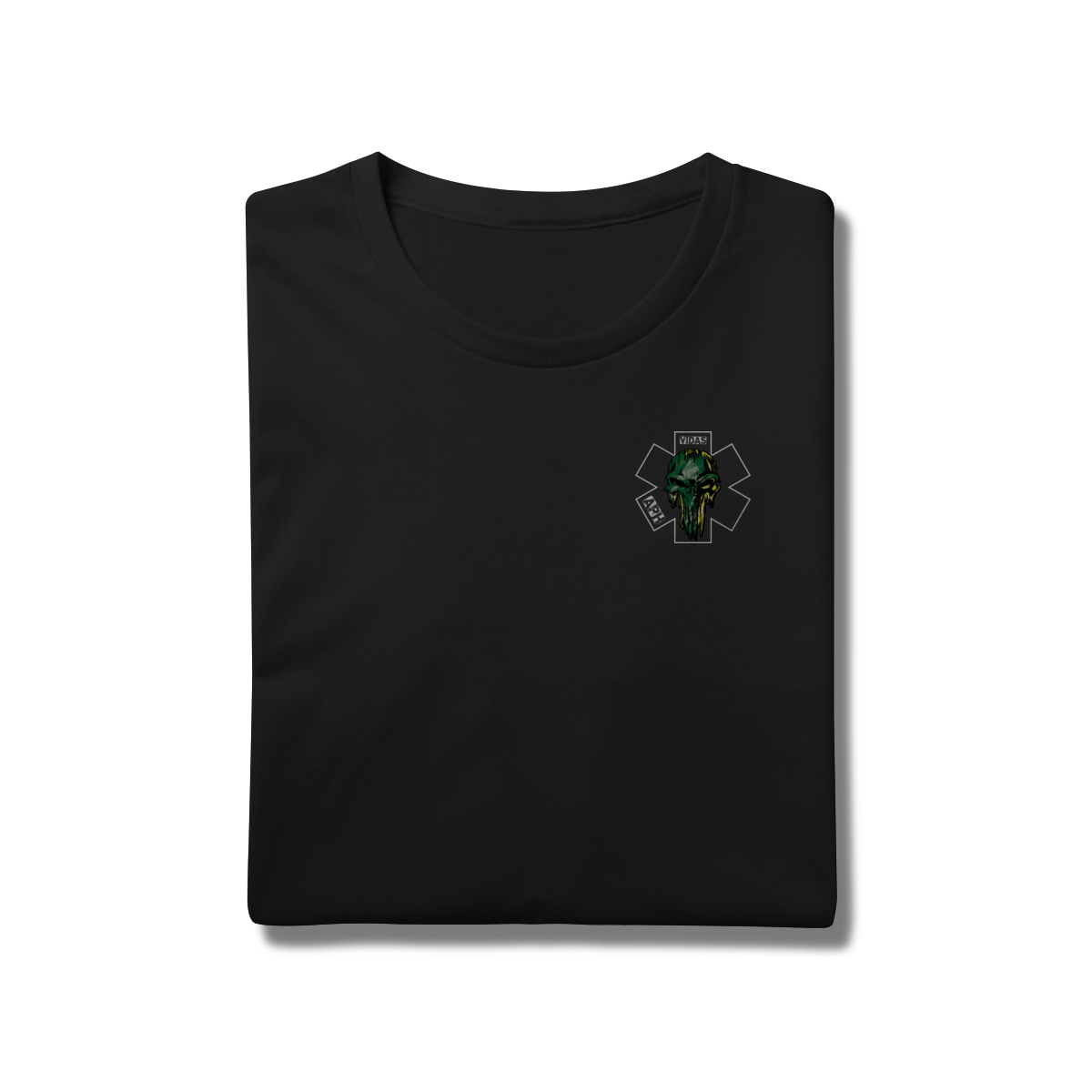 Uma arte impactante que representa a bravura e a garra dos profissionais do Atendimento Pré-Hospitalar. O design traz uma caveira estilizada em verde e amarelo, com um visual forte e marcante, destacando a estrela da vida e as palavras APH e VIDAS, simbolizando a luta diária de quem está sempre pronto para salvar.